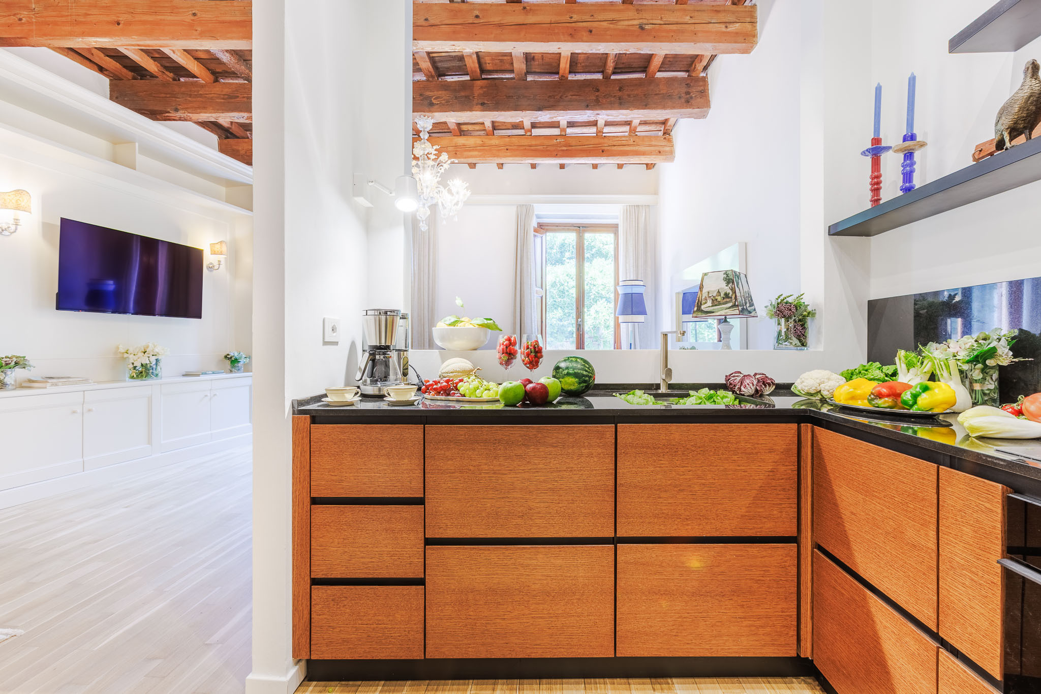 La cucina indipendente è completamente attrezzata e include elettrodomestici di ultima generazione: frigorifero, congelatore, lavatrice, asciugatrice, forno, lavastoviglie, macchina da caffè e tutti gli utensili necessari per preparare pasti deliziosi. La presenza di un ferro da stiro aggiunge praticità al soggiorno.