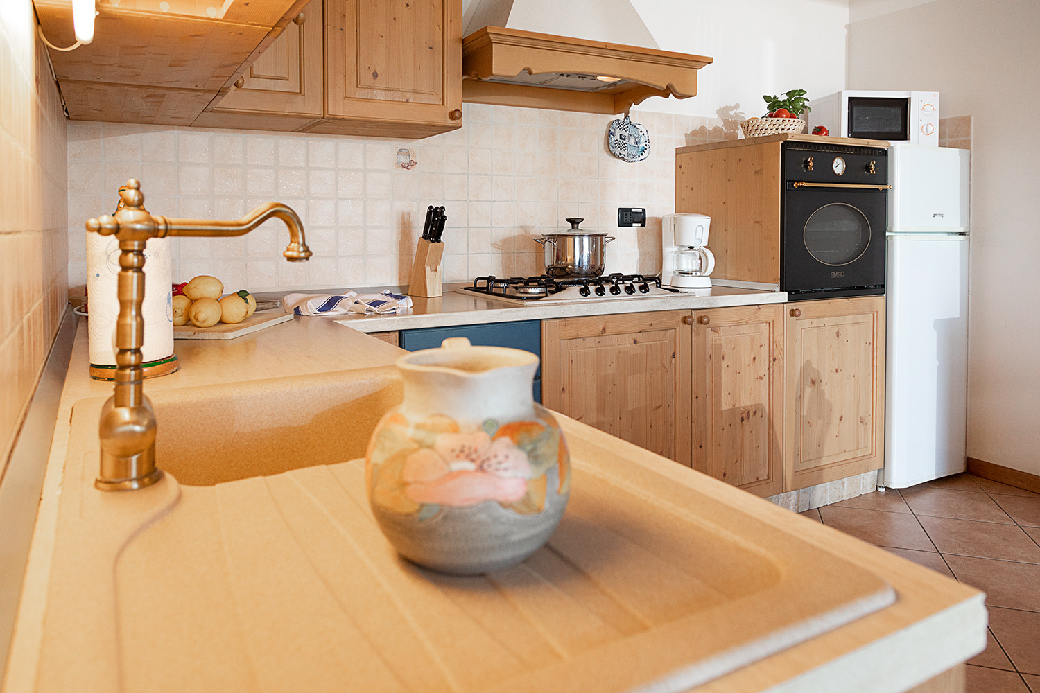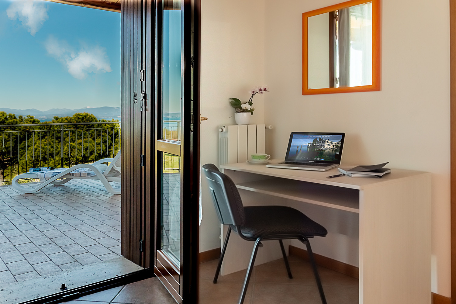 La zona giorno è dotata di angolo cottura completamente attrezzato con frigorifero, fornello a cinque fuochi, forno, forno a microonde, lavastoviglie, macchina da caffè tedesca, tostapane; divano letto doppio, Tv-satellitare ed aria condizionata. Camera con letto matrimoniale ed un letto singolo con 2 finestre ed aria condizionata. Cameretta con due letti singoli con uscita sulla terrazza vista lago, aria condizionata e bagno in camera dotato di doccia, WC, bidet, finestra. Secondo bagno con doccia, wc, bidet, lavatrice, finestra. Animali domestici su richiesta.