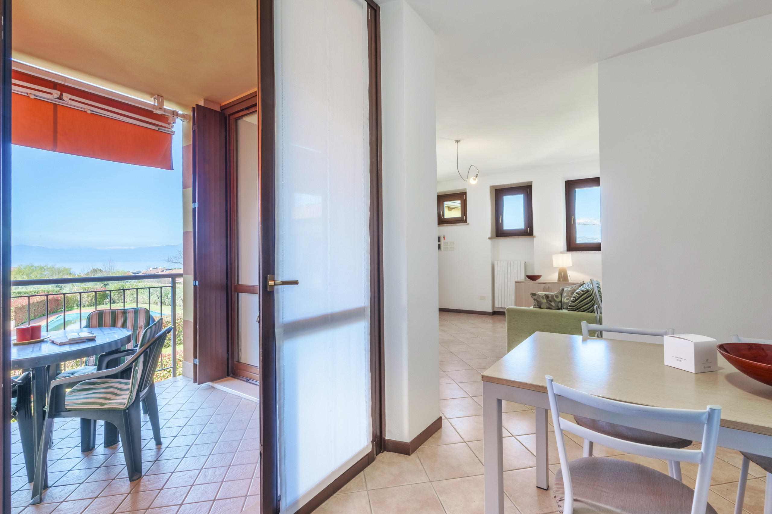 L'appartamento si trova in un piccolo e tranquillo complesso residenziale, può ospitare fino a 5 persone e dispone di una luminosa zona giorno con spaziosa cucina attrezzata con frigorifero, fornello a gas, forno, congelatore, lavastoviglie, stoviglie/posate, utensili da cucina, caffettiera e tostapane. La zona giorno è inoltre dotata di un letto a scomparsa alla francese, un comodo divano, una tv satellitare, wifi e l'aria condizionata. Spaziosa camera da letto matrimoniale, camera con due letti singoli. Bagno finestrato con lavatrice e box doccia. La spaziosa terrazza con meravigliosa vista lago vi accoglierà per cene al tramonto e pranzi all'aperto grazie alla presenza di una comoda tenda da sole. Il complesso residenziale dispone di una graziosa piscina (periodo di apertura garantito 15/05-30/09) e di un verde giardino condominiale. Parcheggio all'aperto vicino alla struttura. Animali non ammessi.