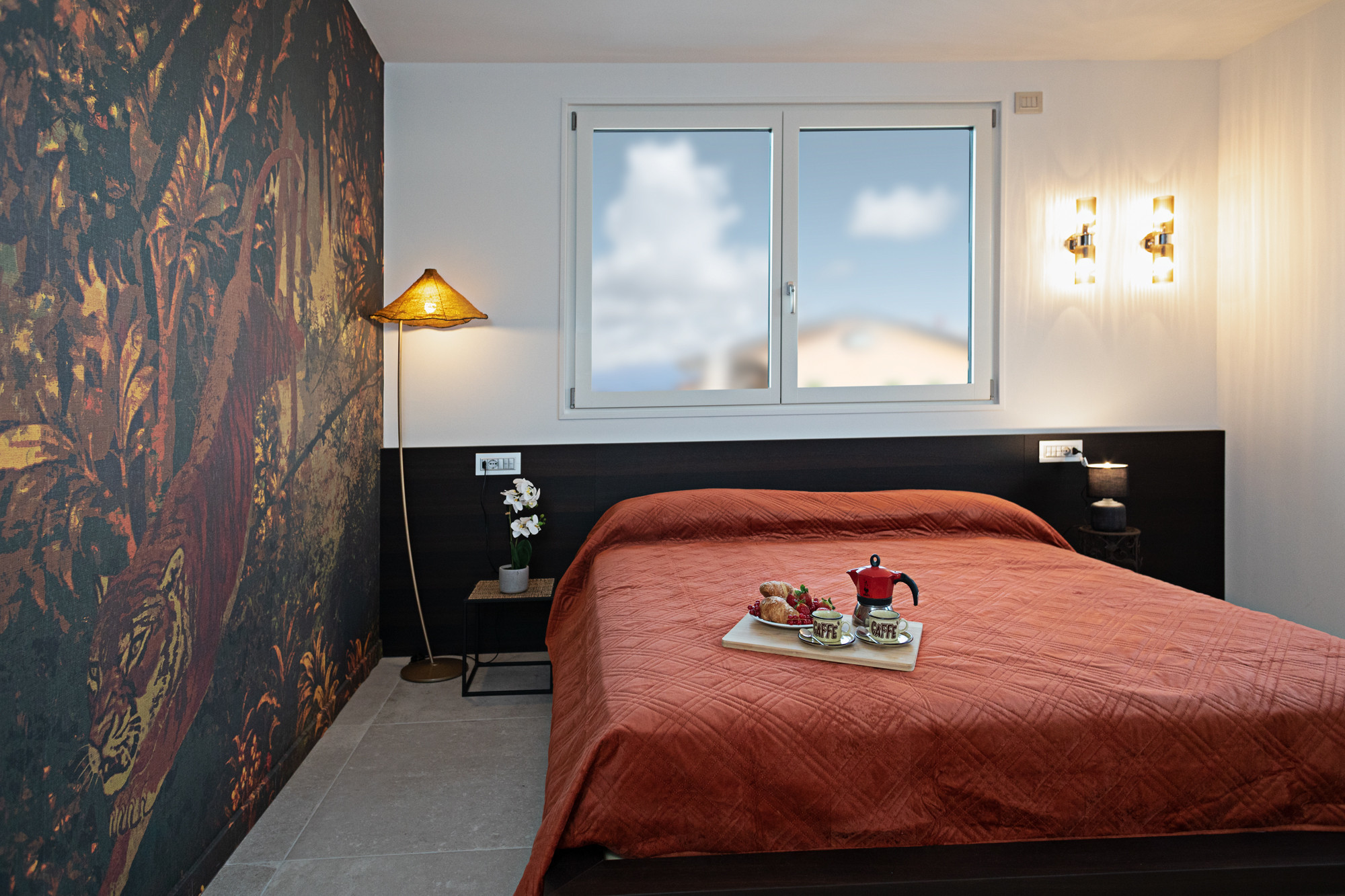 Il punto forte dell'appartamento è l'ampia terrazza coperta con travi a vista che si affaccia sull'incantevole panorama del Lago di Garda. Da qui, infatti, gli ospiti possono ammirare il paese di Lazise a sinistra e la baia di Garda a destra. La terrazza è attrezzata con tavolo e sedie per pranzare all'aperto e due sdraio per momenti di relax. L'appartamento Yin e Yang offre una luminosa zona living con grandi finestre scorrevoli e una cucina moderna dotata di ogni comfort: piano cottura a induzione, frigorifero con congelatore, forno, lavastoviglie, bollitore, tostapane, macchina per il caffè. L'area pranzo è arredata con un grande tavolo quadrato, tv satellitare e un elegante divano in velluto. La camera da letto matrimoniale, in stile orientale, è arredata con un letto matrimoniale e un armadio a specchio scorrevole. Seconda camera con letto singolo e secondo letto estraibile dotata di armadio a 3 ante. Il bagno dispone di doccia a filo pavimento, lavabo, bidet e WC. Aria condizionata nel corridoio tra le camere da letto e il soggiorno. Wifi gratuito a disposizione degli ospiti. Un posto auto riservato all'esterno della proprietà, parcheggi esterni aggiuntivi nel vicino parcheggio pubblico. Animali non ammessi. Appartamento non fumatori.