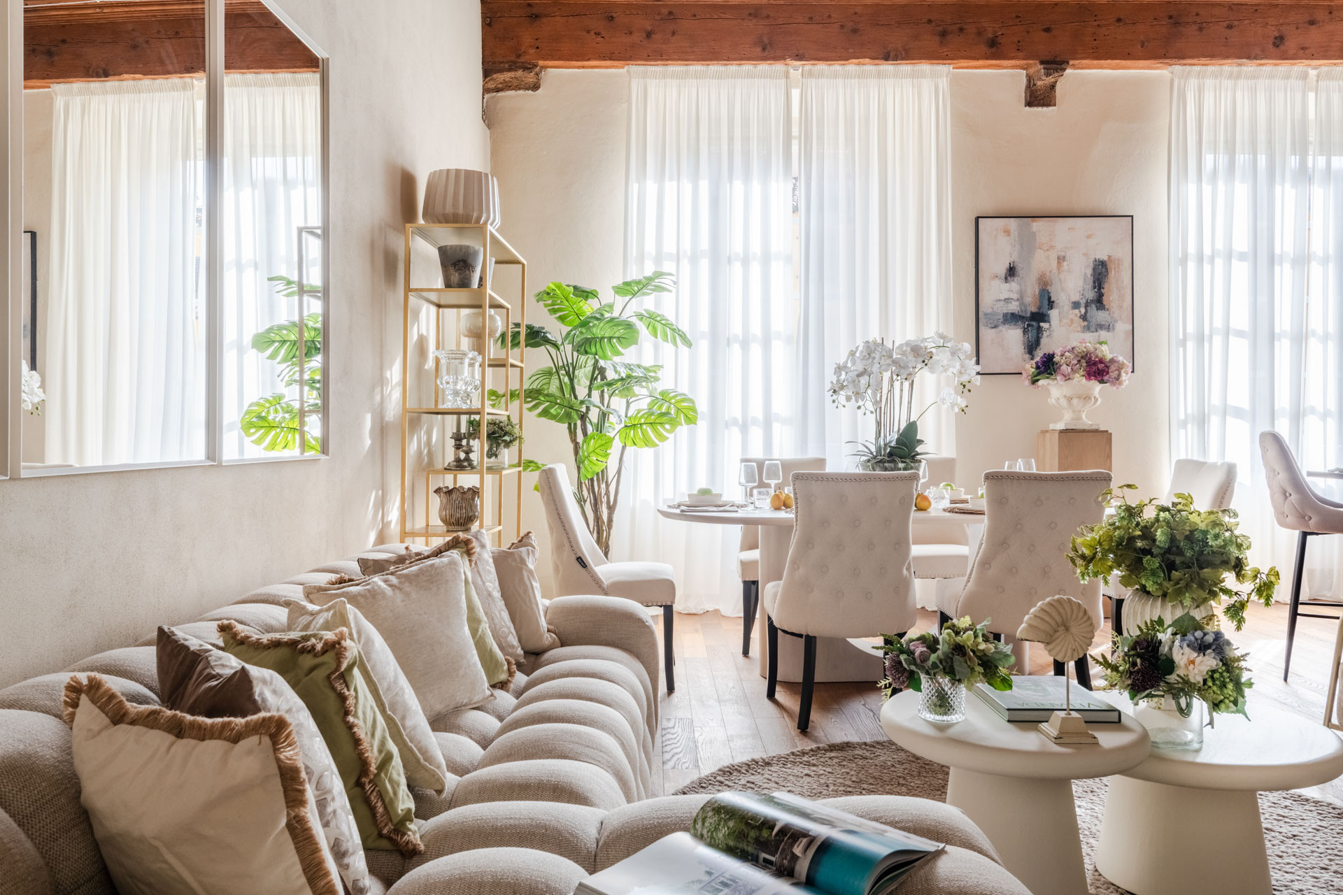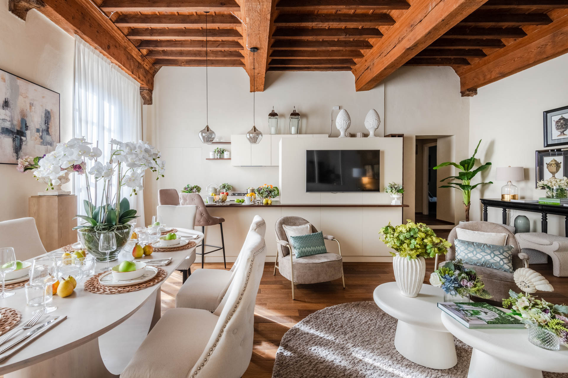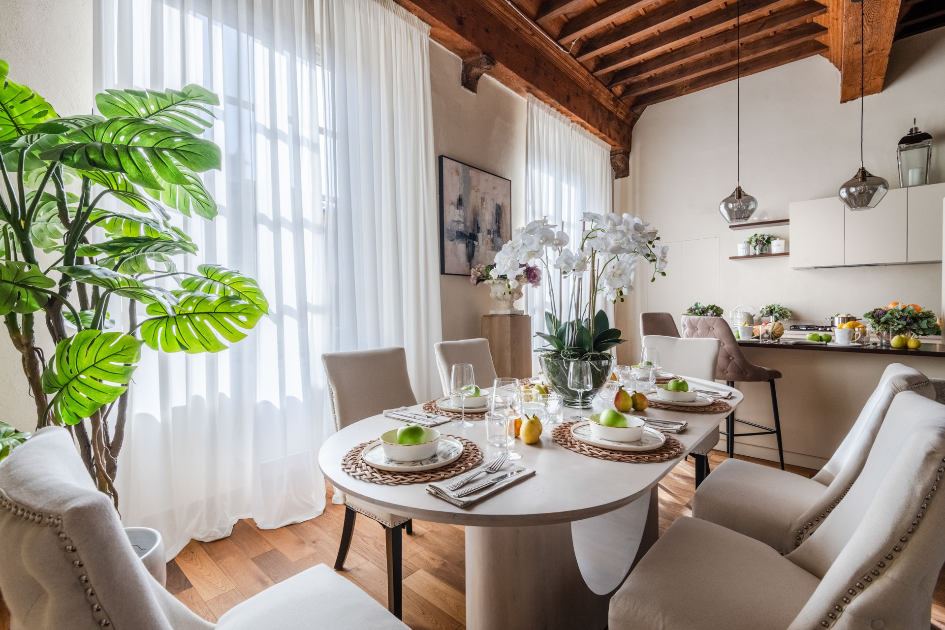 La cucina all'americana è completamente attrezzata con elettrodomestici di ultima generazione: frigorifero, congelatore, lavatrice, asciugatrice, macchina del caffè, forno, lavastoviglie, microonde, tostapane, bollitore e molto altro. Perfetta per chi ama cucinare o preparare pasti veloci.