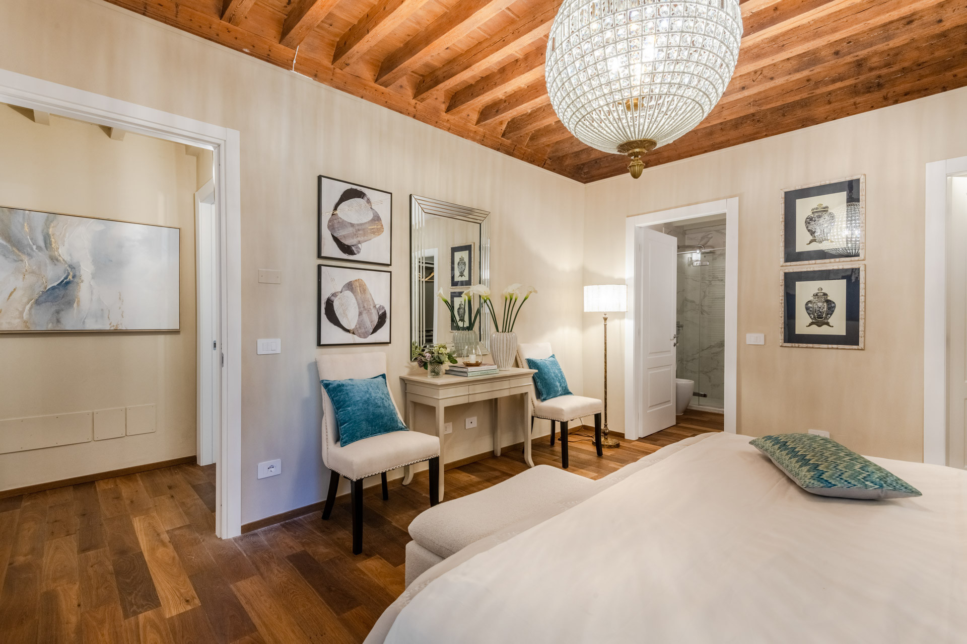 L'appartamento offre due camere da letto con letti matrimoniali, garantendo comfort e privacy per tutti gli ospiti. La casa è dotata di due bagni con doccia, rendendo la permanenza pratica e funzionale. L'aria condizionata presente in tutti gli ambienti assicura un soggiorno piacevole in ogni stagione.