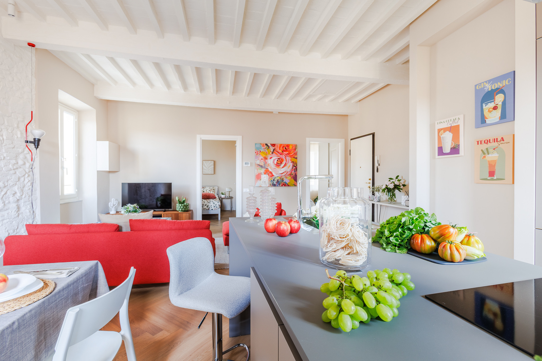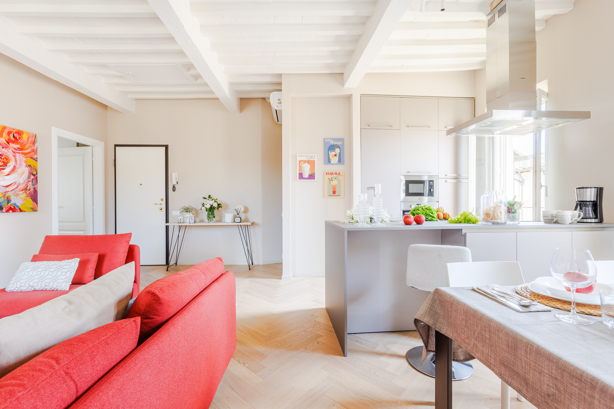 L'appartamento dispone di una camera da letto con un letto matrimoniale e un divano letto, permettendo di ospitare comodamente fino a 4 persone. Il bagno con doccia è completamente attrezzato, mentre la cucina all'americana è un vero punto di forza dell'appartamento. Qui troverete tutti gli elettrodomestici necessari: frigorifero, lavatrice, forno, microonde, macchina del caffè, lavastoviglie e molto altro ancora.