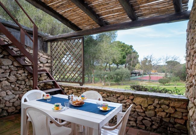 SPAZI ESTERNILa veranda coperta, arredata con tavolo e sedie, è perfetta per pranzi e cene all’aperto ammirando la vista panoramica sul Golfo di Cugnana. Il residence, immerso nella macchia mediterranea, assicura privacy e silenzio, arricchito da piscina e campo da tennis condivisi.