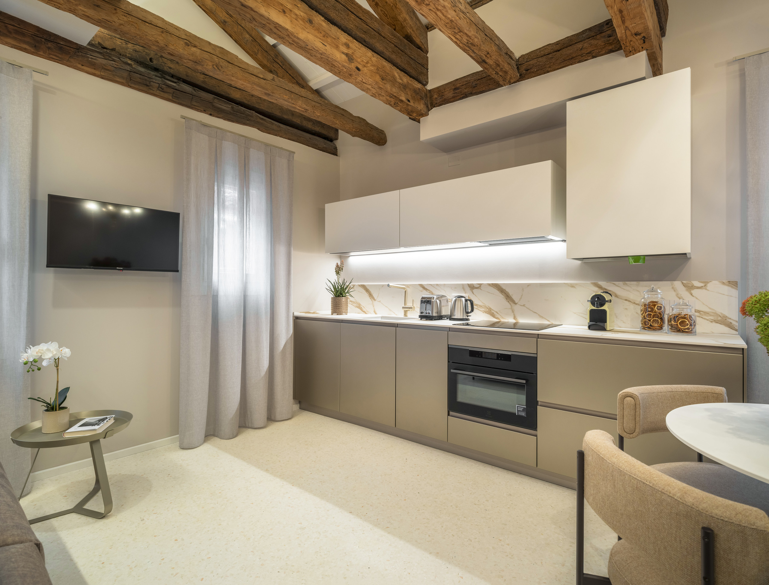 Lo spazio è pensato per stare comodi in due o tre persone: c’è un letto matrimoniale e un divano letto per un ospite in più. La piccola cucina è perfetta per una colazione lenta o una cena facile dopo una giornata in giro tra calli e bacari. La zona è vivace ma tranquilla, piena di vita veneziana vera: botteghe, bar, ristoranti e tutto quello che serve sono sotto casa. Ottimo punto di partenza per esplorare la città a piedi, senza fretta. Un posto pratico, curato e con una spiccata personalità, per chi vuole sentirsi subito a casa a Venezia.