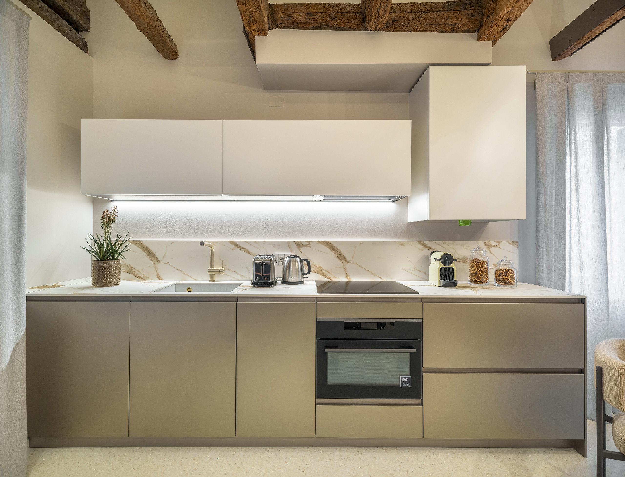 La venezianità e la modernità si fondono per creare questo piccolo bilocale in una delle zone più tranquille e residenziali di Venezia: i Giardini della Biennale, nel sestiere di Castello.