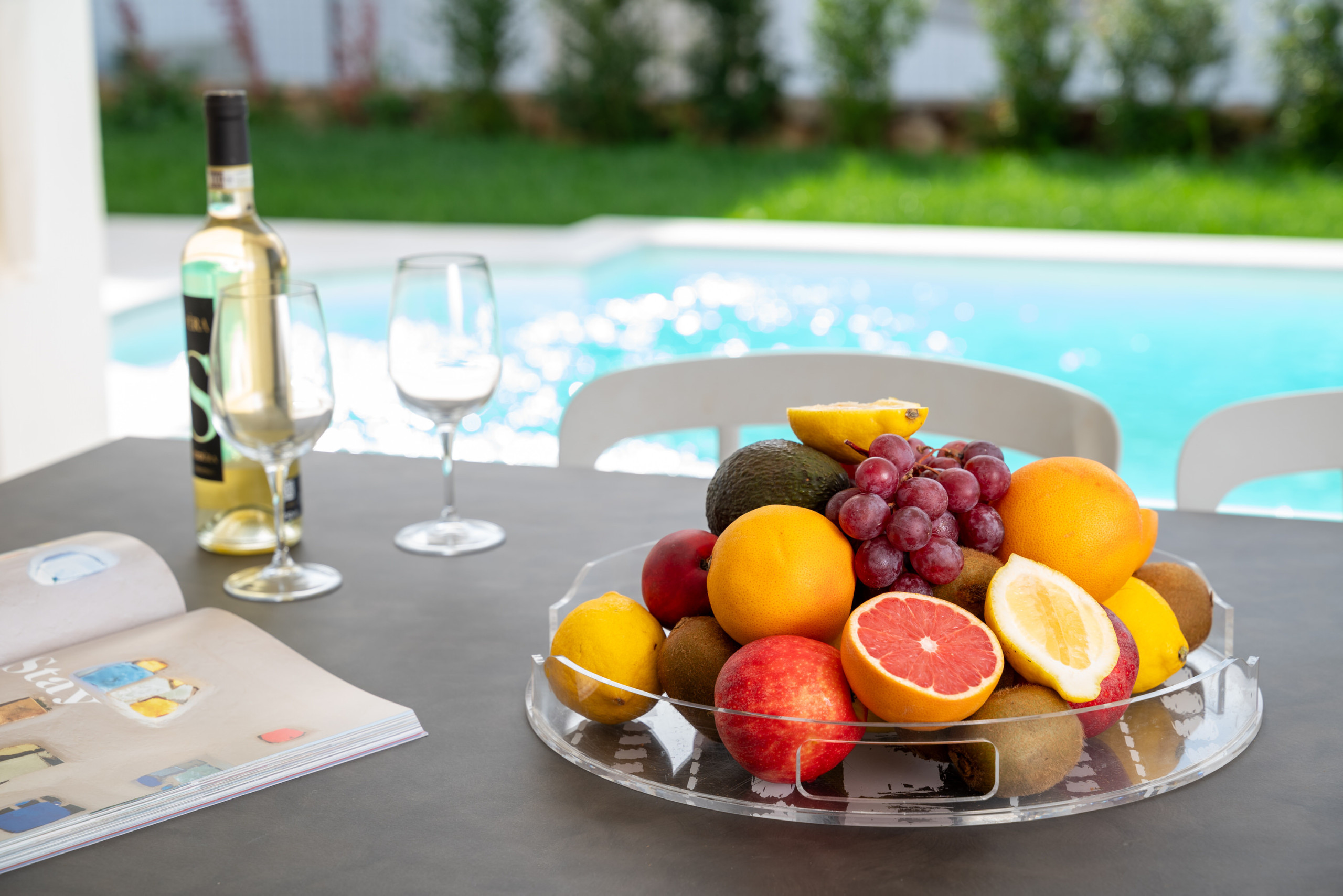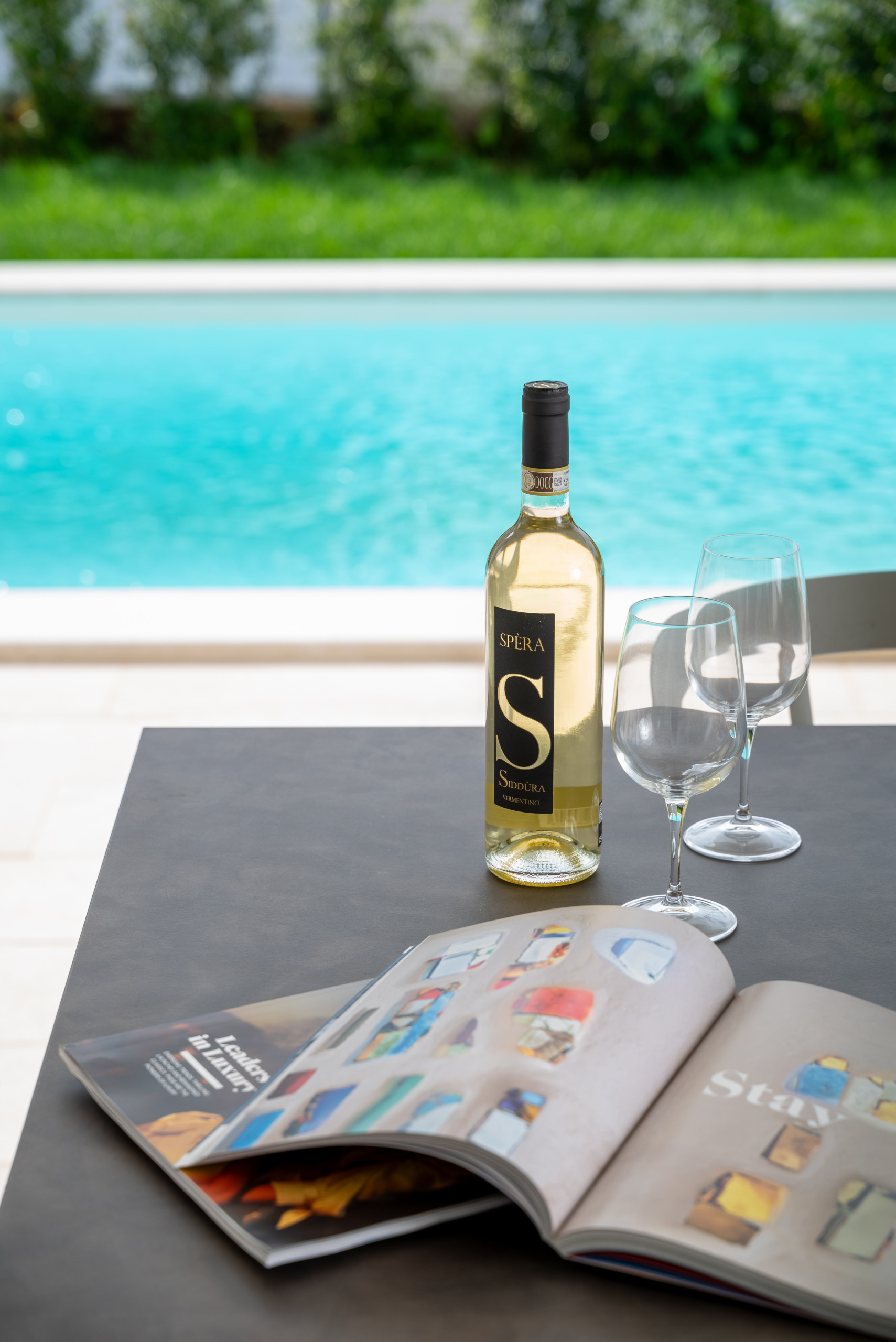 La piscina privata rappresenta il cuore visivo della proprietà, offrendo un’atmosfera rilassante e suggestiva che avvolge gli spazi interni grazie alle aperture panoramiche.