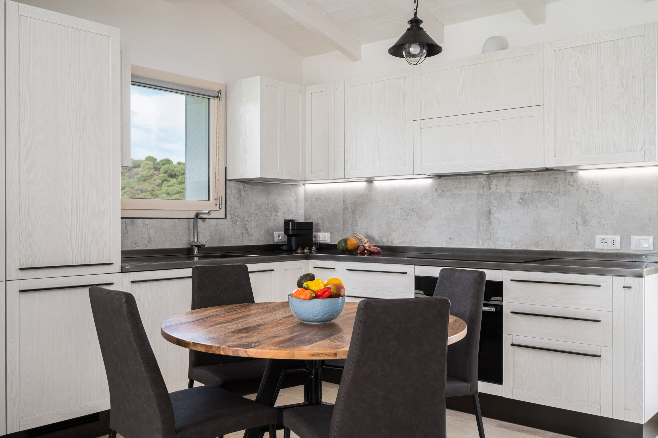 Gli interni di Villa Ca’La Luna sono curati in ogni dettaglio per garantire eleganza e funzionalità. La luminosa zona giorno affaccia sulla veranda e sul giardino attraverso ampie vetrate, e include una cucina moderna completamente attrezzata.