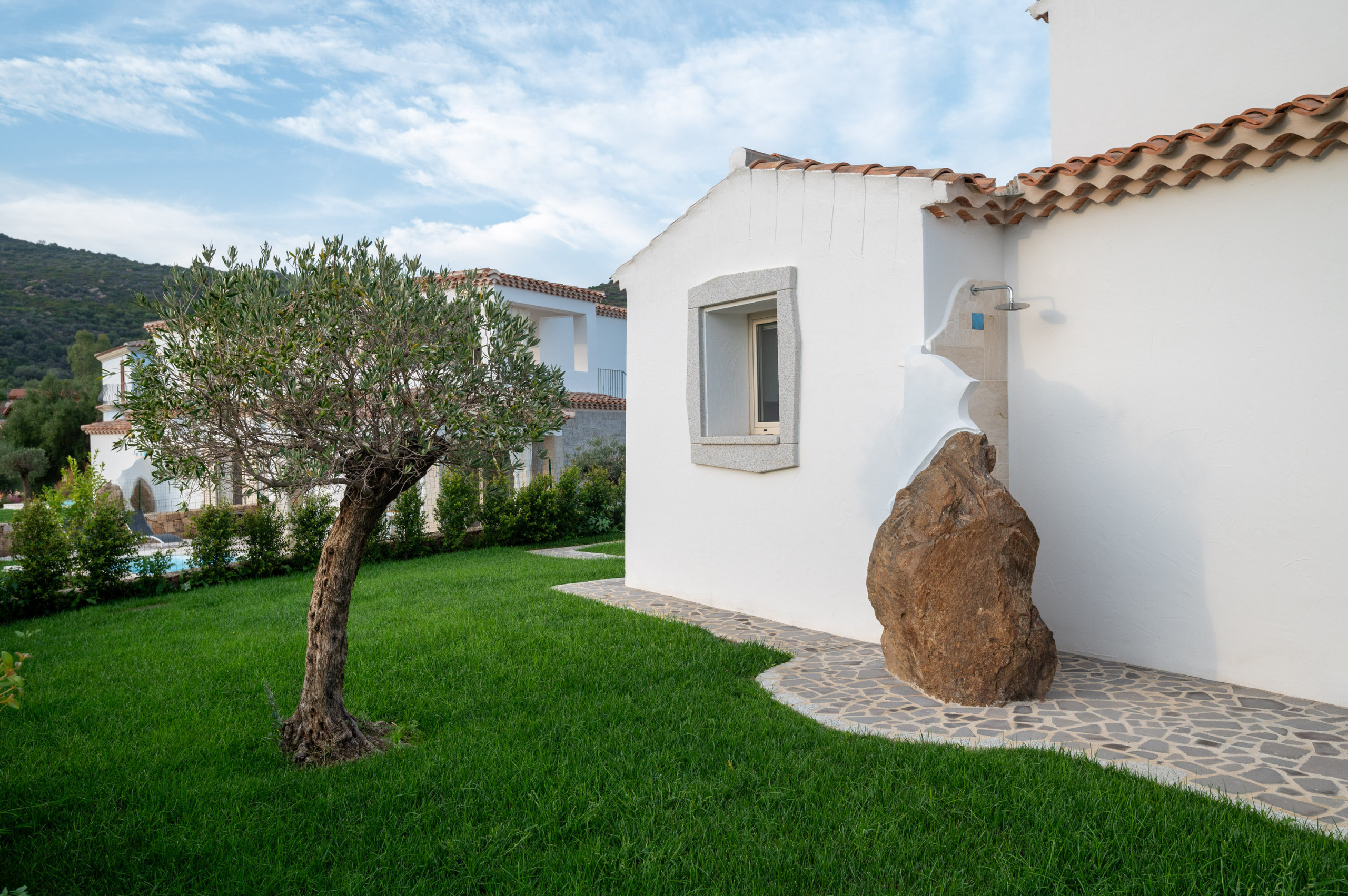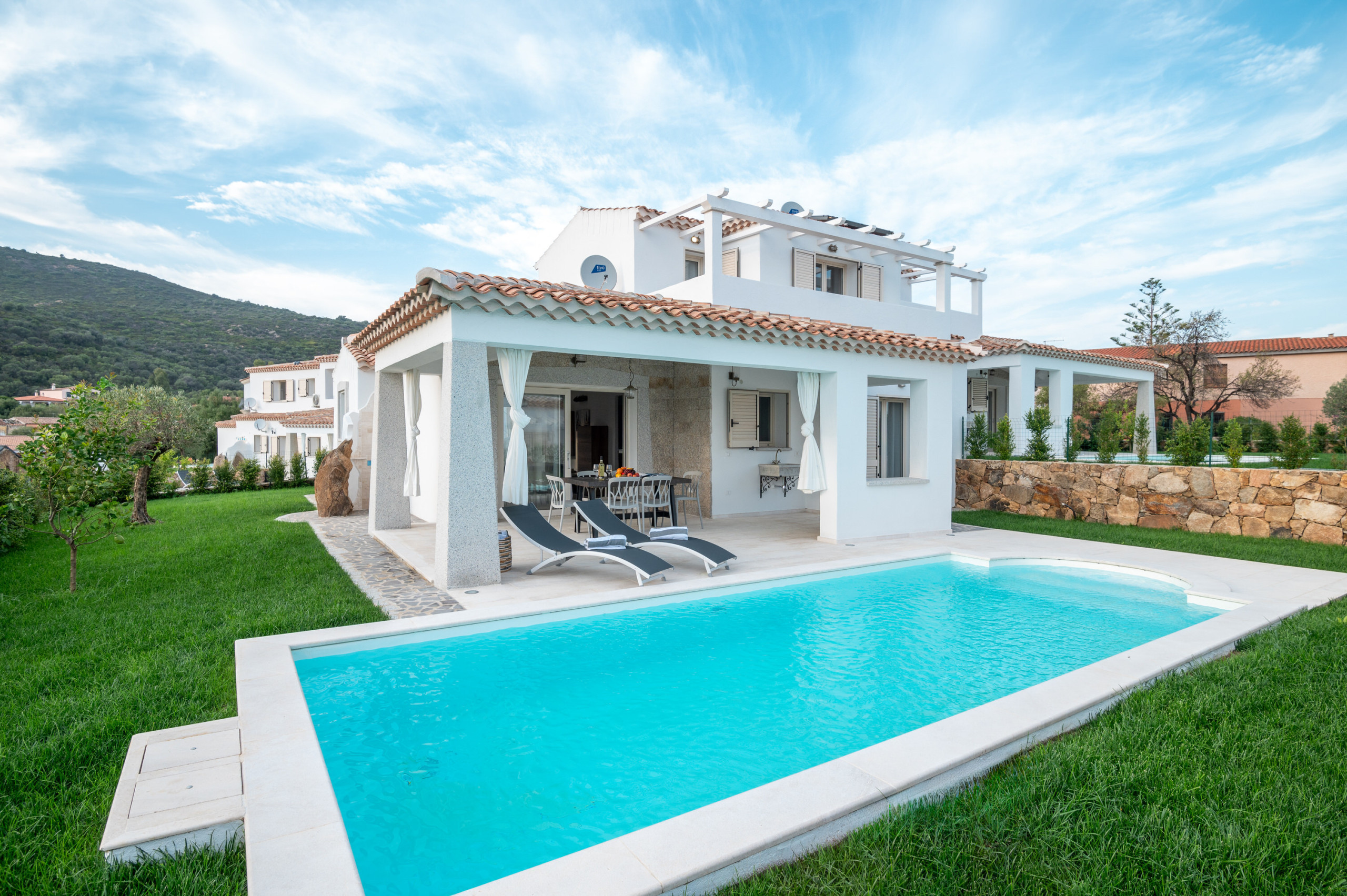 Il giardino privato, circondato dalla macchia mediterranea, ospita una piscina esterna scoperta completa di area prendisole, sdraio e doccia esterna. La veranda coperta, arredata per pranzi e cene all’aperto, offre un ambiente perfetto per vivere momenti di relax in totale privacy. Gli spazi esterni della villa sono progettati per integrarsi armoniosamente con il paesaggio naturale.