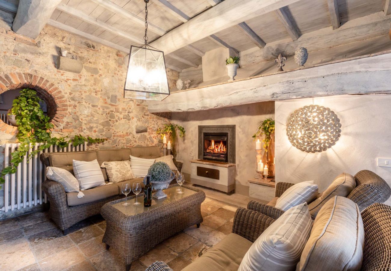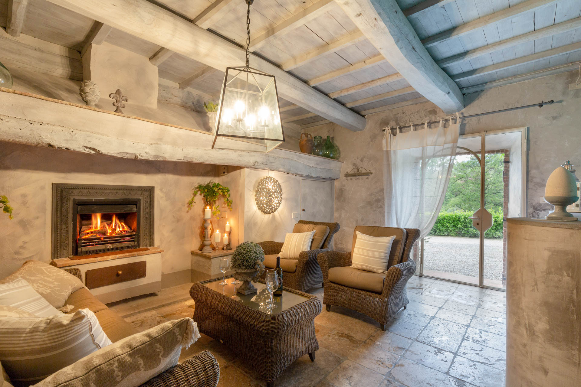 Il piano inferiore della villa colpisce per le pareti in pietra a vista e i soffitti a volta dove si trova una piscina coperta riscaldata con sali termali. Mentre ti immergi nell'acqua calda godendoti le vasche idromassaggio e la magnifica vista sui boschi e sulle colline, un caminetto che scalda il cuore aggiungerà pace e fascino ai tuoi momenti di relax.