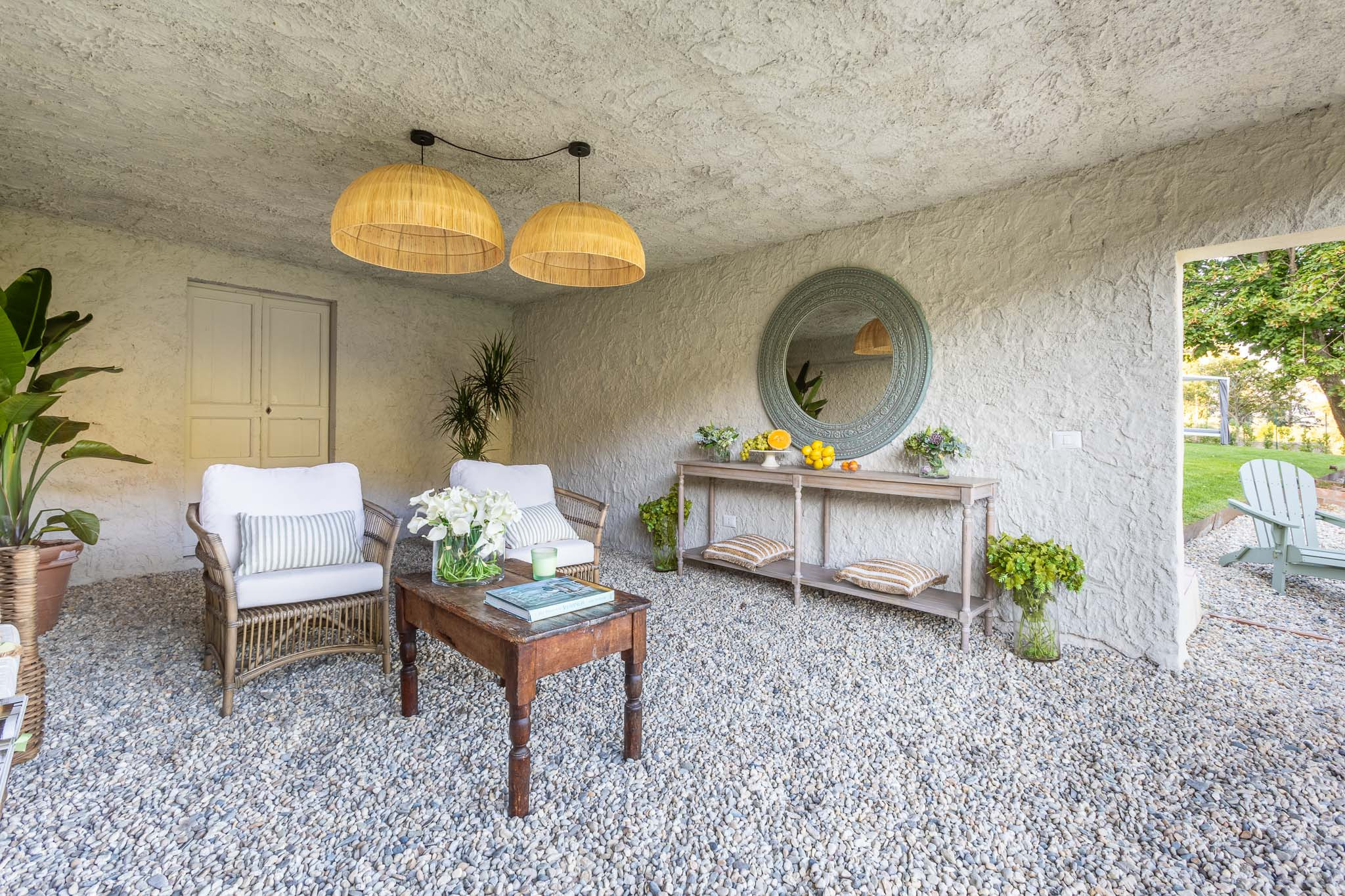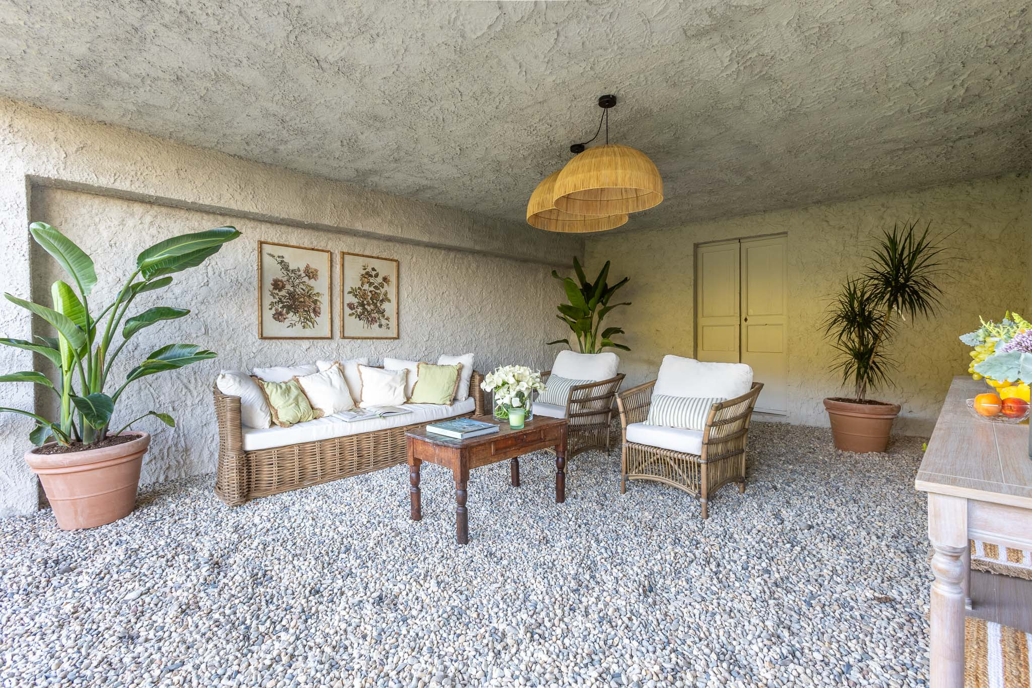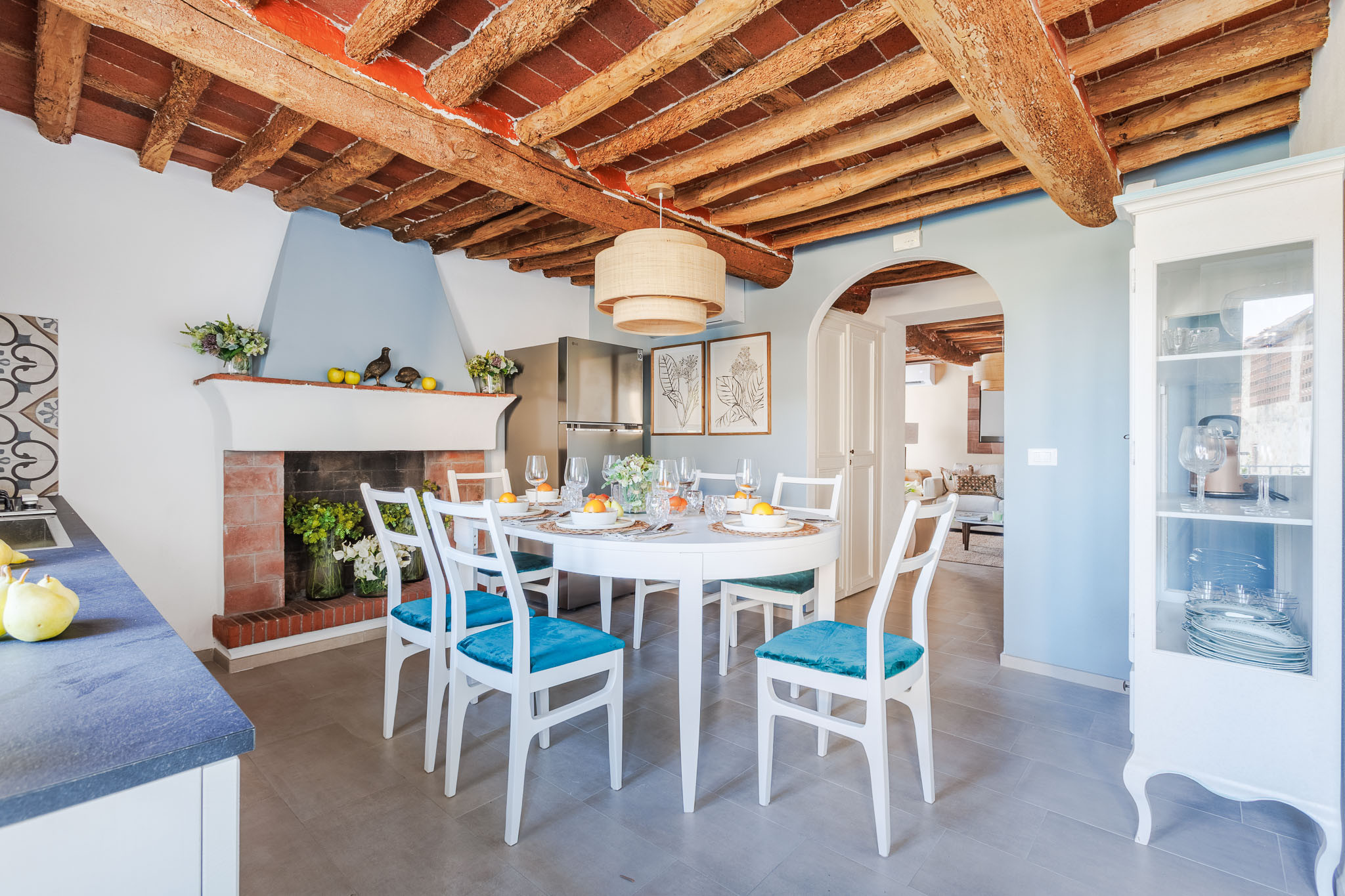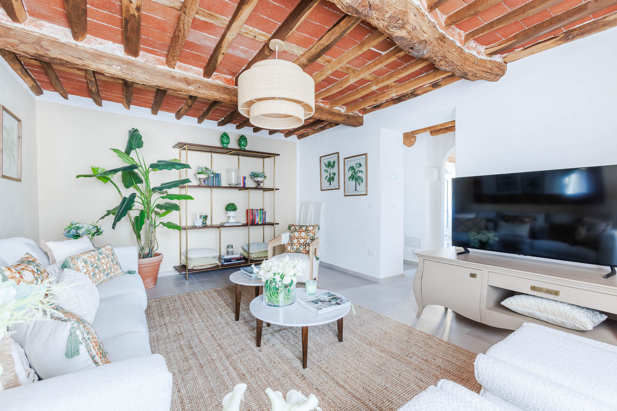 The interiors have been thoughtfully renovated with warm natural tones, wooden beamed ceilings, and elegant furnishings that create a cozy yet refined atmosphere. The living room and dining area are decorated with fresh, contemporary details while preserving the home’s original character, offering a welcoming space to gather with family and friends.