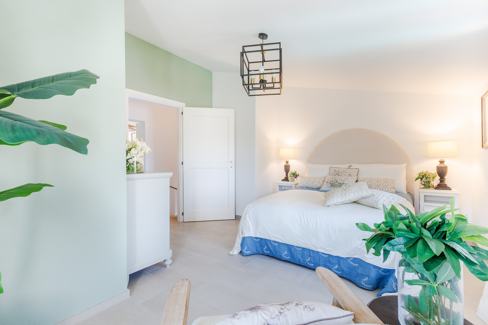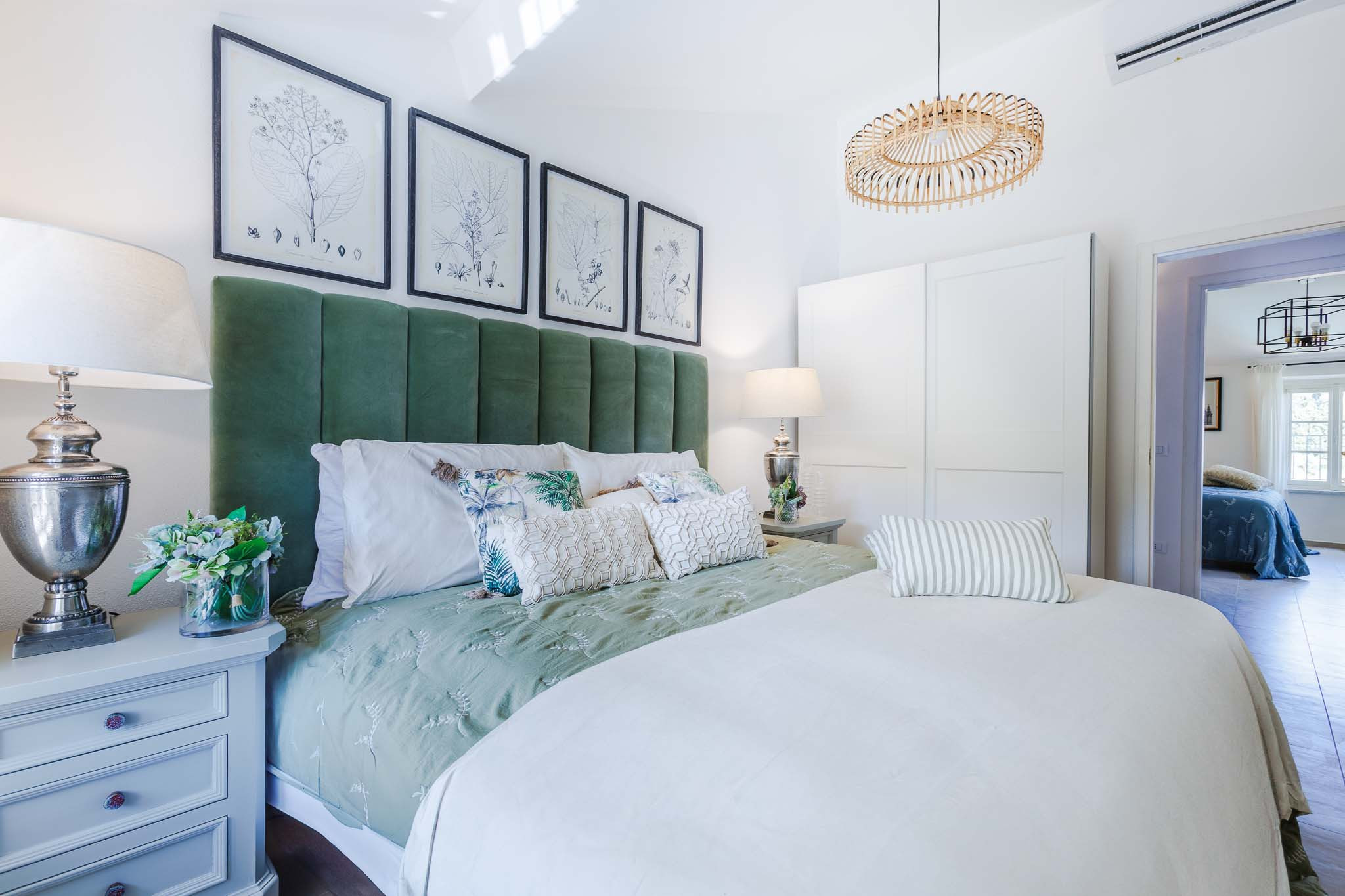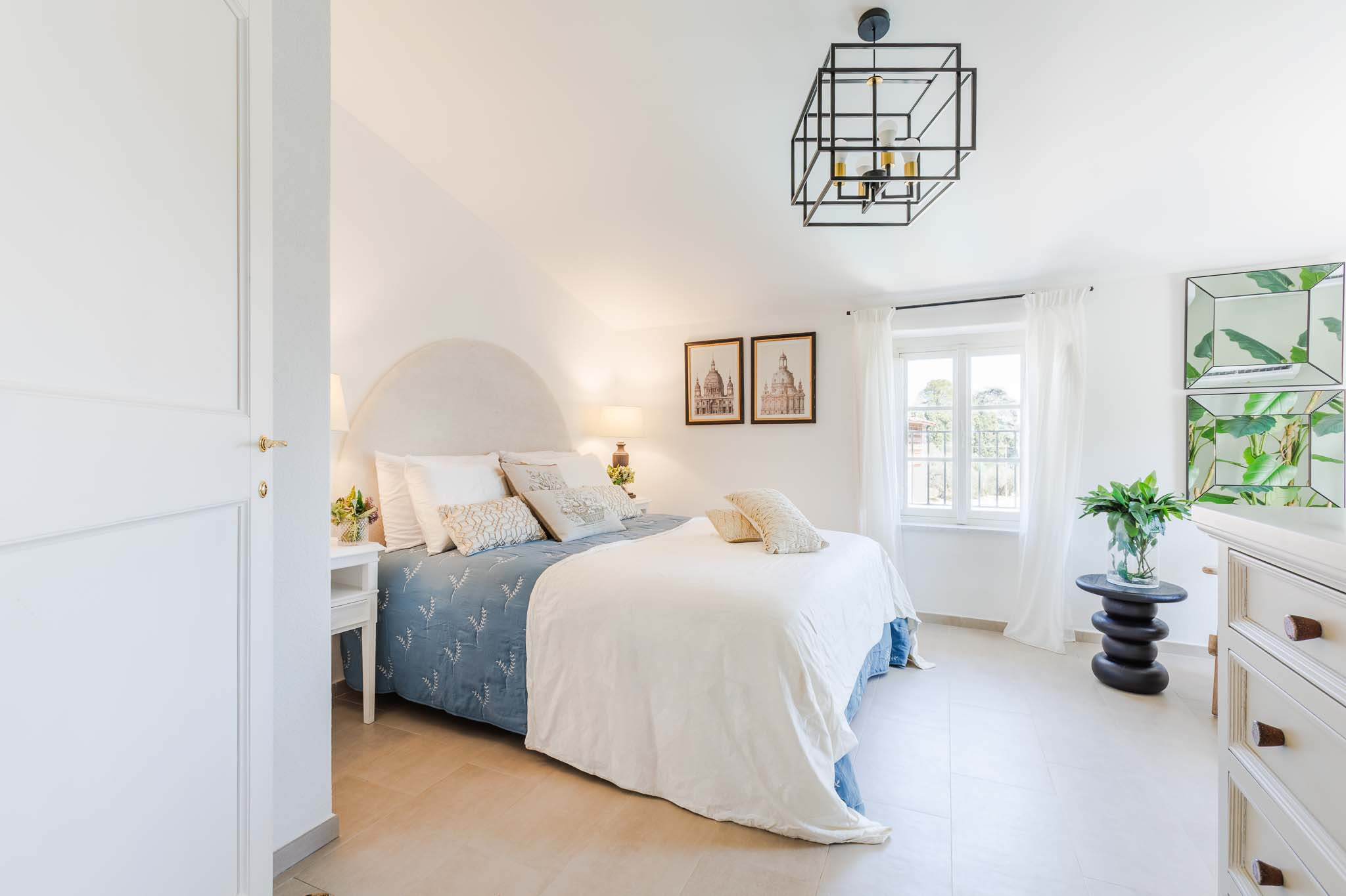 The interiors have been thoughtfully renovated with warm natural tones, wooden beamed ceilings, and elegant furnishings that create a cozy yet refined atmosphere. The living room and dining area are decorated with fresh, contemporary details while preserving the home’s original character, offering a welcoming space to gather with family and friends.