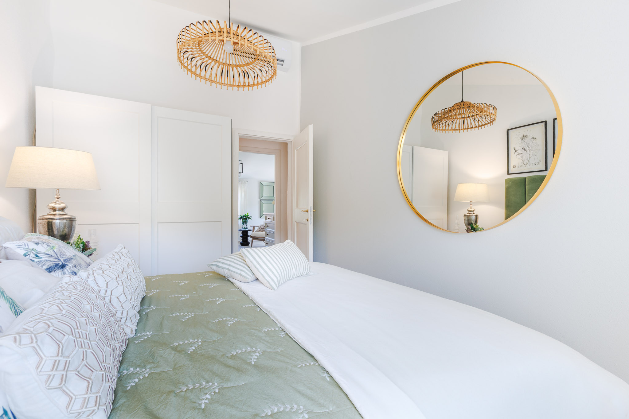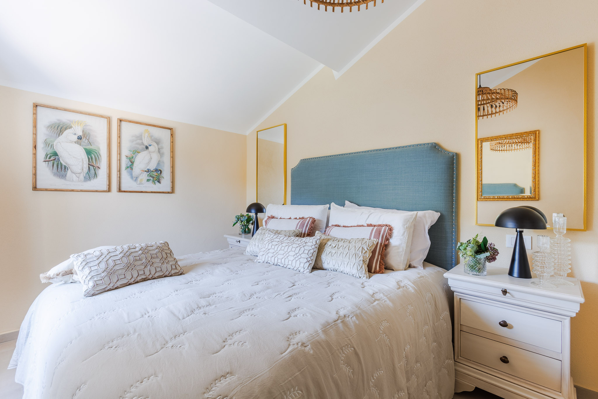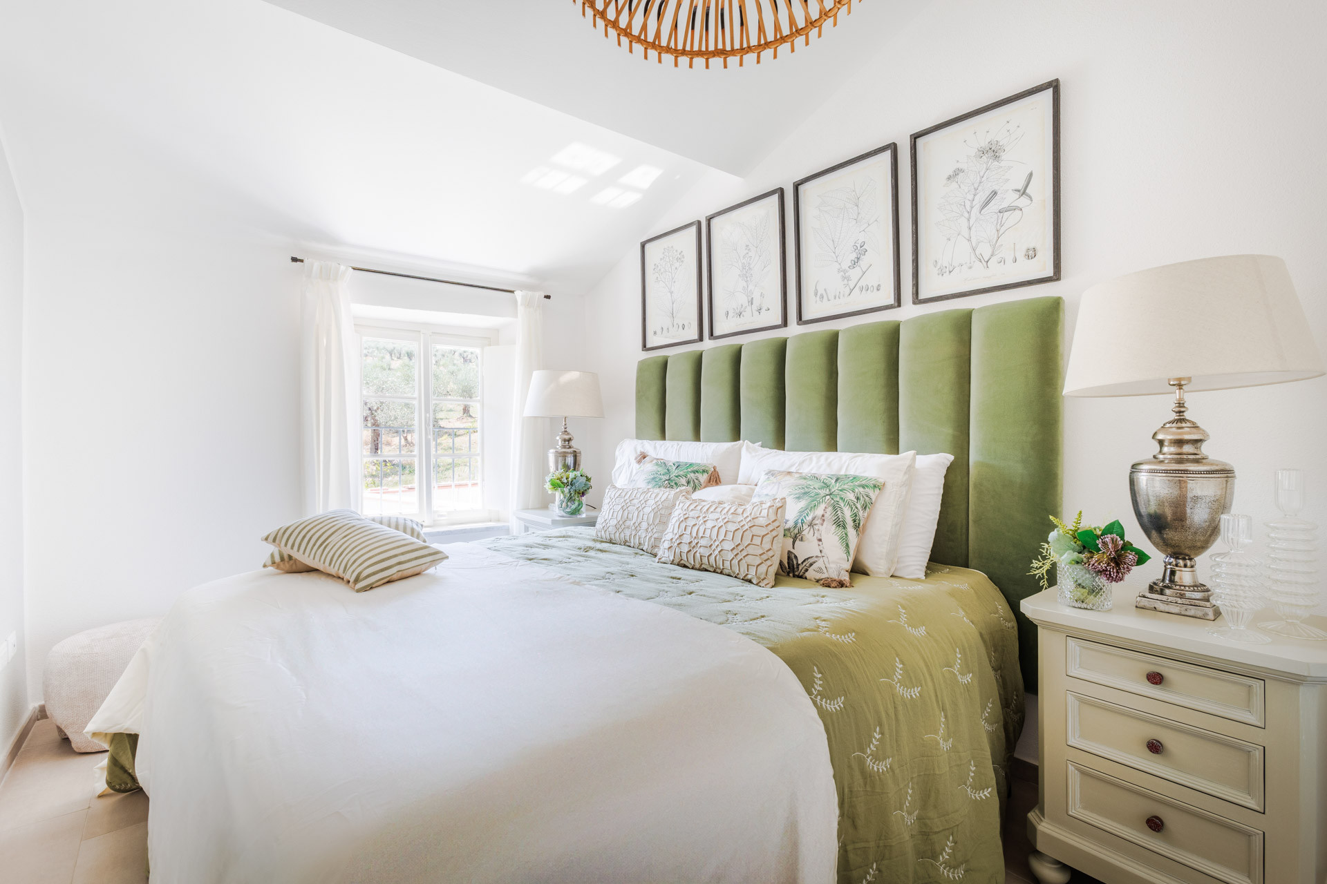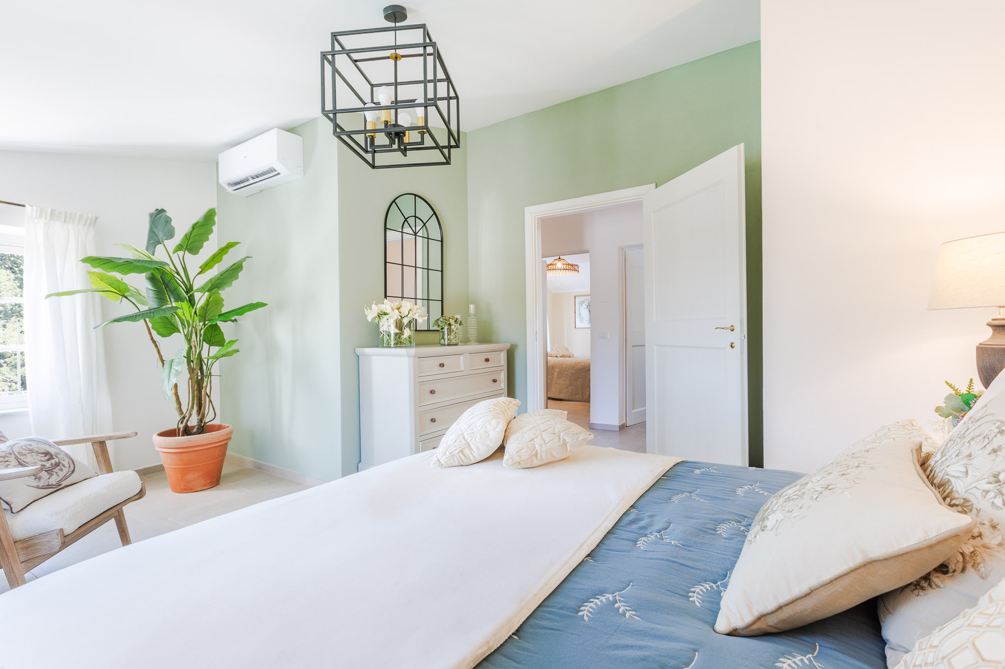 The interiors have been thoughtfully renovated with warm natural tones, wooden beamed ceilings, and elegant furnishings that create a cozy yet refined atmosphere. The living room and dining area are decorated with fresh, contemporary details while preserving the home’s original character, offering a welcoming space to gather with family and friends.