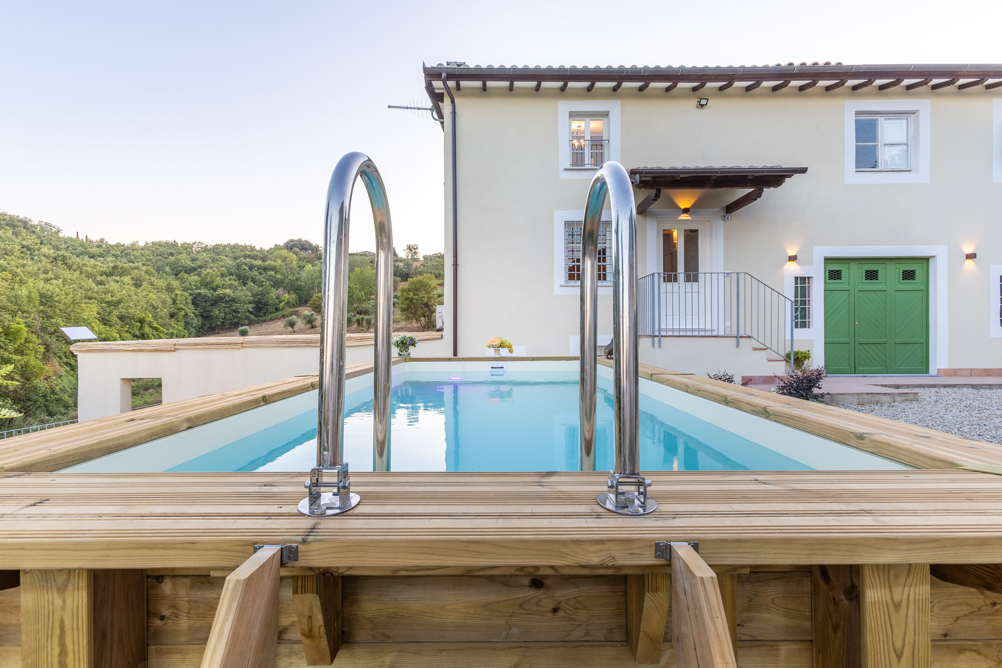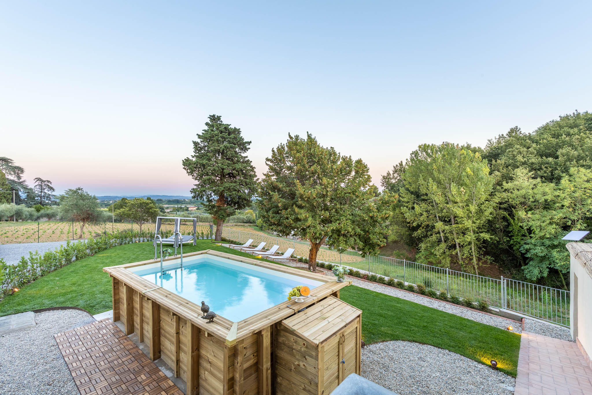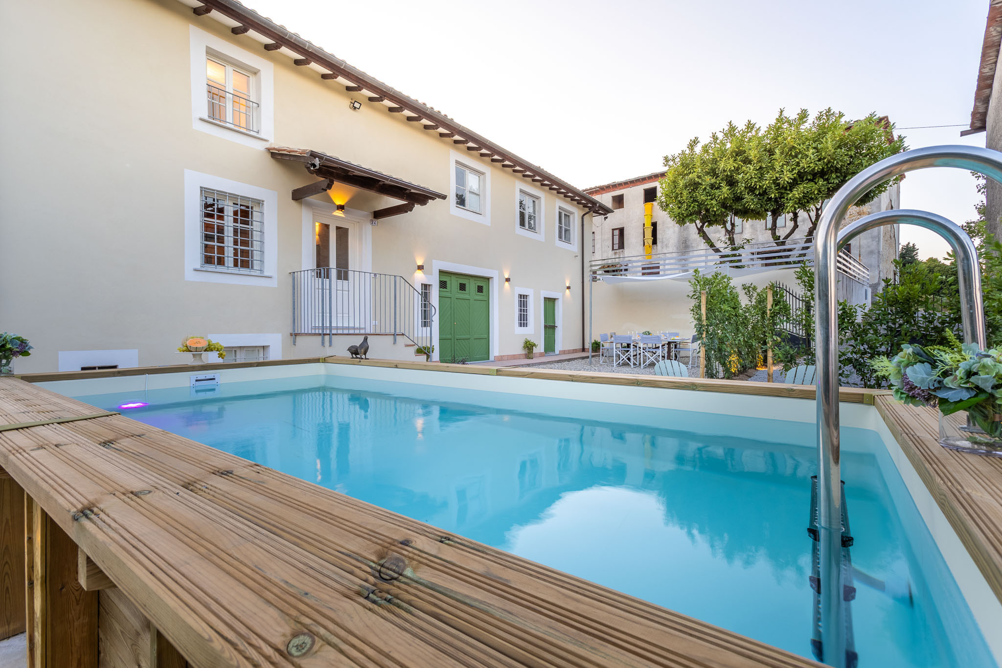 Outdoors, guests can enjoy a private above-ground pool set in the garden, complete with sun loungers for lazy afternoons under the Tuscan sun. A shaded outdoor dining area invites you to savor al fresco meals surrounded by greenery, making every moment feel like a holiday.