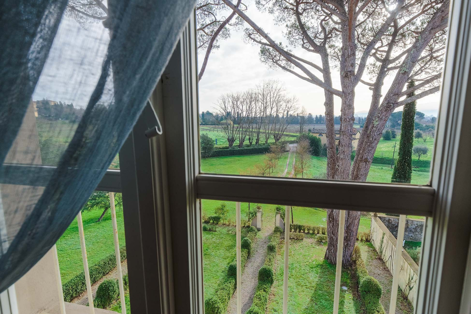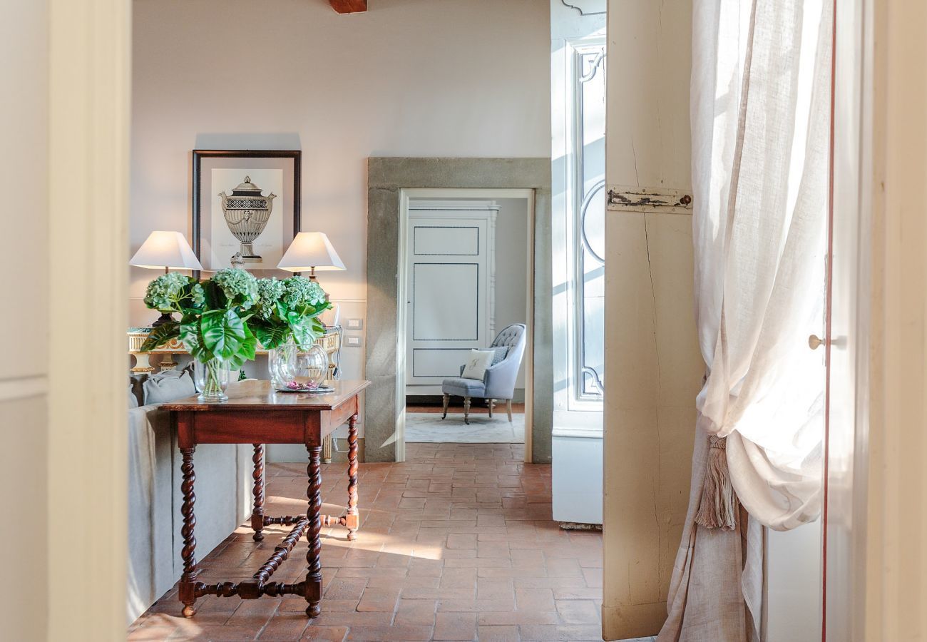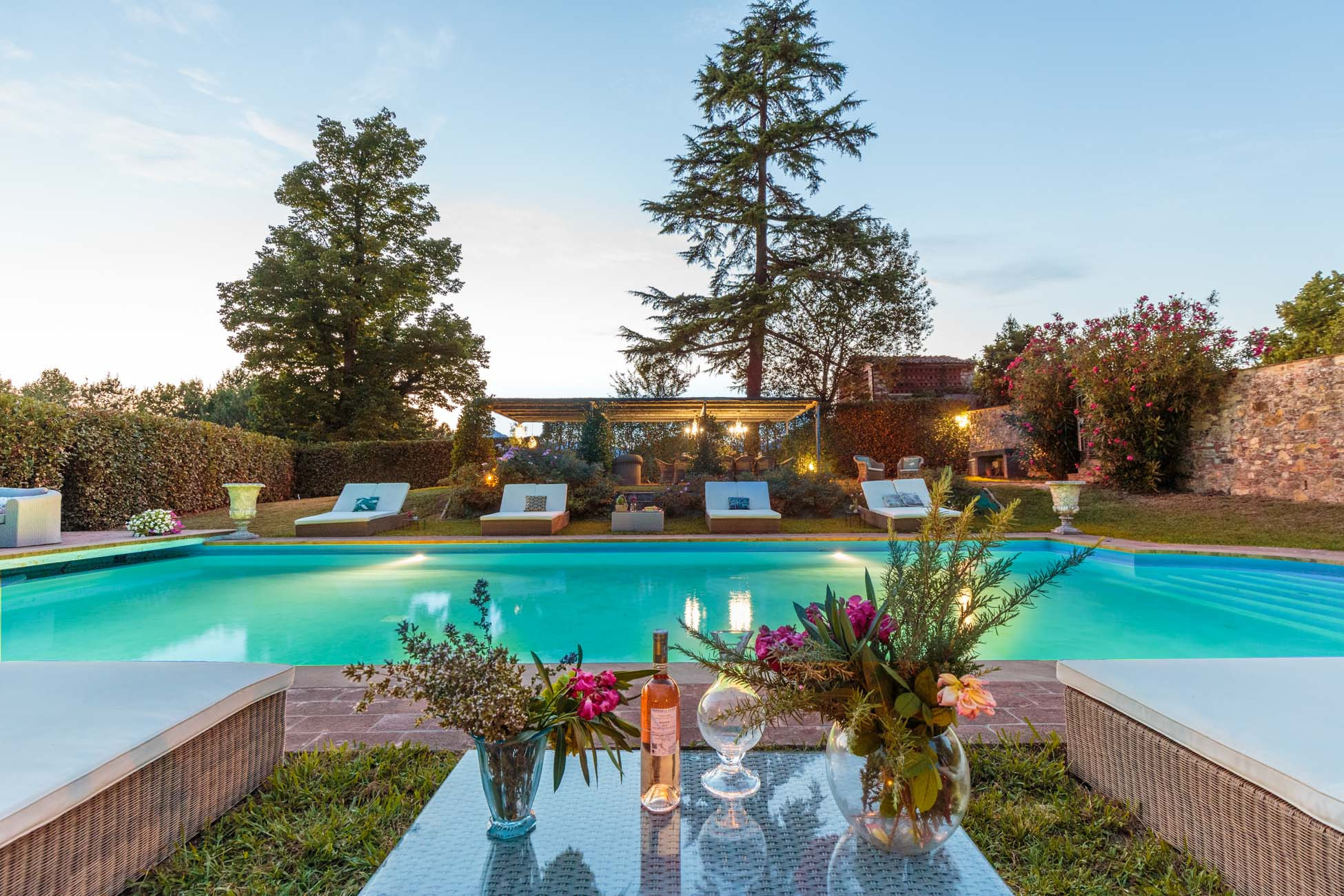 Secluded amid lush flowers and trees, the villa's ample grounds invite you to enchanting days and nights in the Tuscan air. Savor bright mornings floating in the sparkling swimming pool and sunbathing on stylish four-poster loungers.