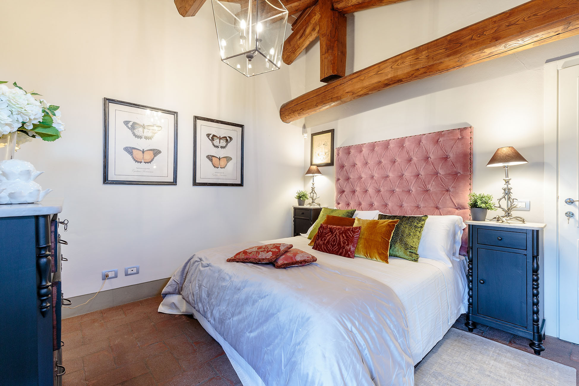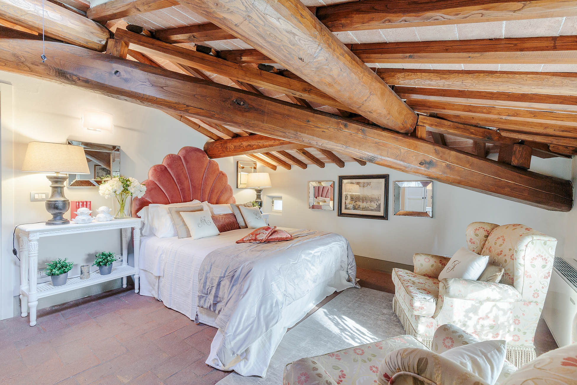 Exposed wood beams and ancient stone walls show off Villa Francigena authenticity. Within the spacious villa, you’ll find designer furniture, local works of art, and elegant lighting fixtures. The atmosphere is classic Italian countryside, warm, inviting, and stylish.