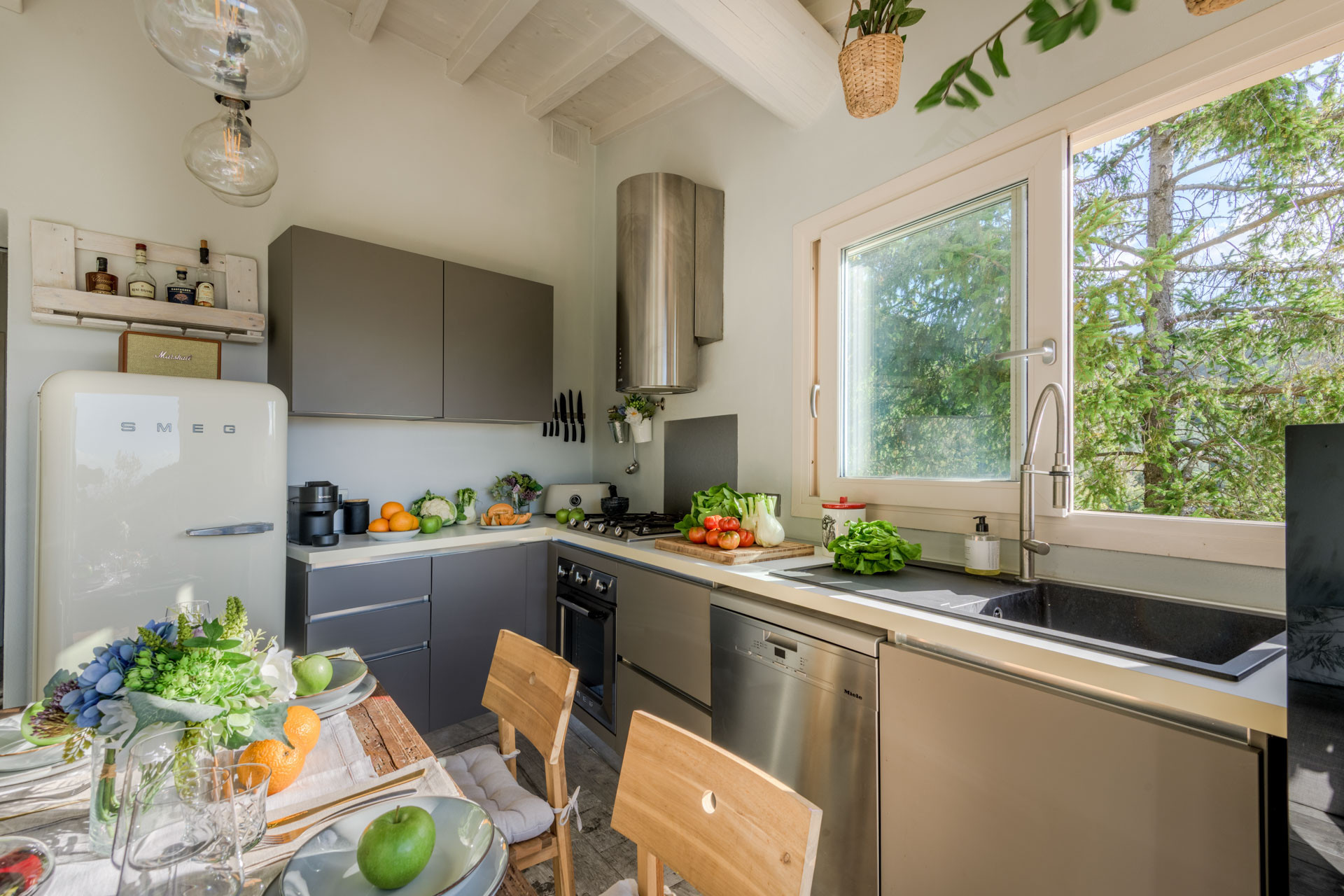 Ground floor: it features a fully equipped kitchen, a dining room that opens to the terrace/outdoor dining area, a cosy living room, a bathroom with a shower.
