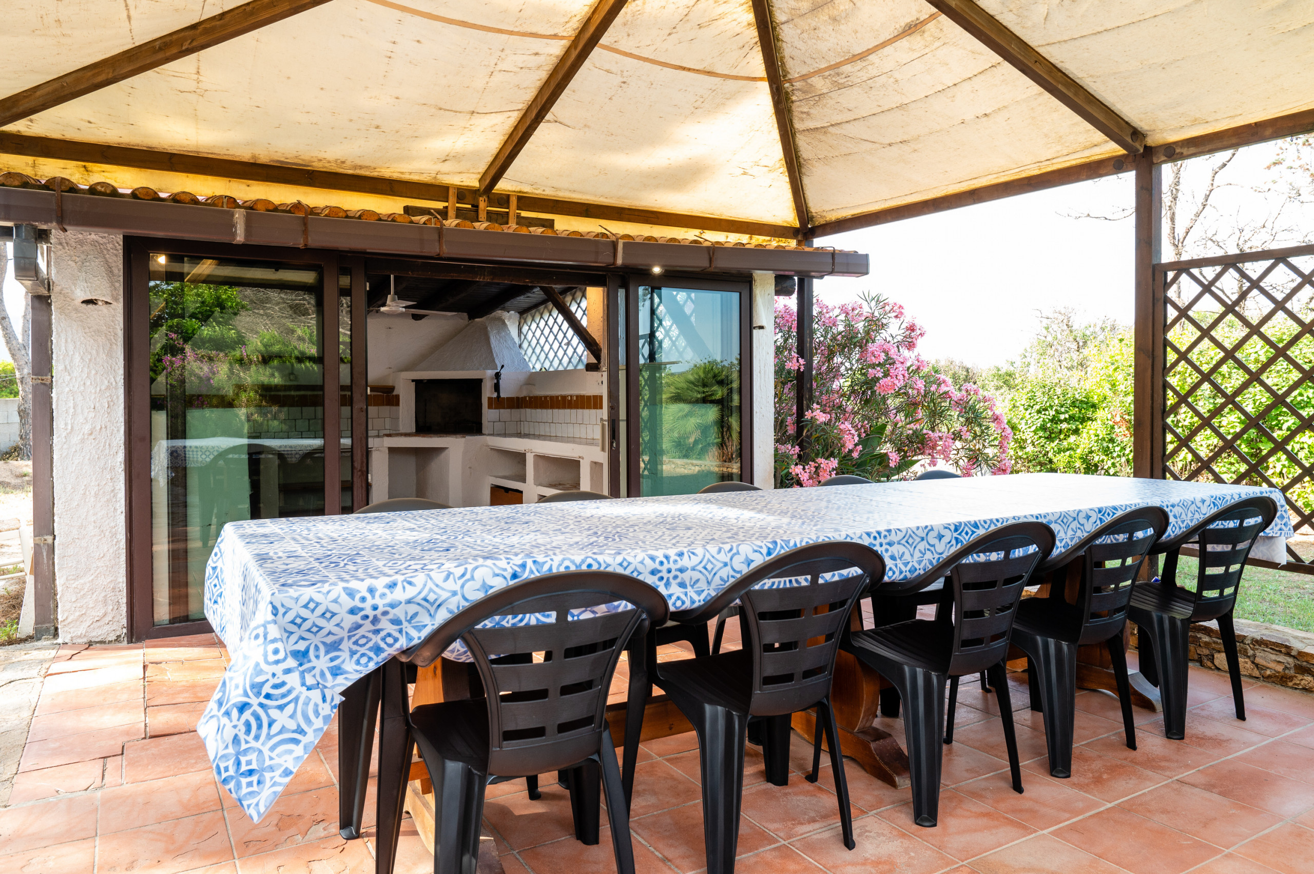 Gli esterni di Villa Calyra includono un ampio giardino privato con area barbecue, una terrazza arredata e una splendida piscina con zona poco profonda sicura per i bambini, caratteristica che rende la proprietà una perfetta villa per famiglie. Gli spazi all’aperto sono pensati per vivere momenti di convivialità e relax immersi nella quiete della campagna sarda, valorizzando appieno la natura circostante e offrendo una vera villa con giardino privato.