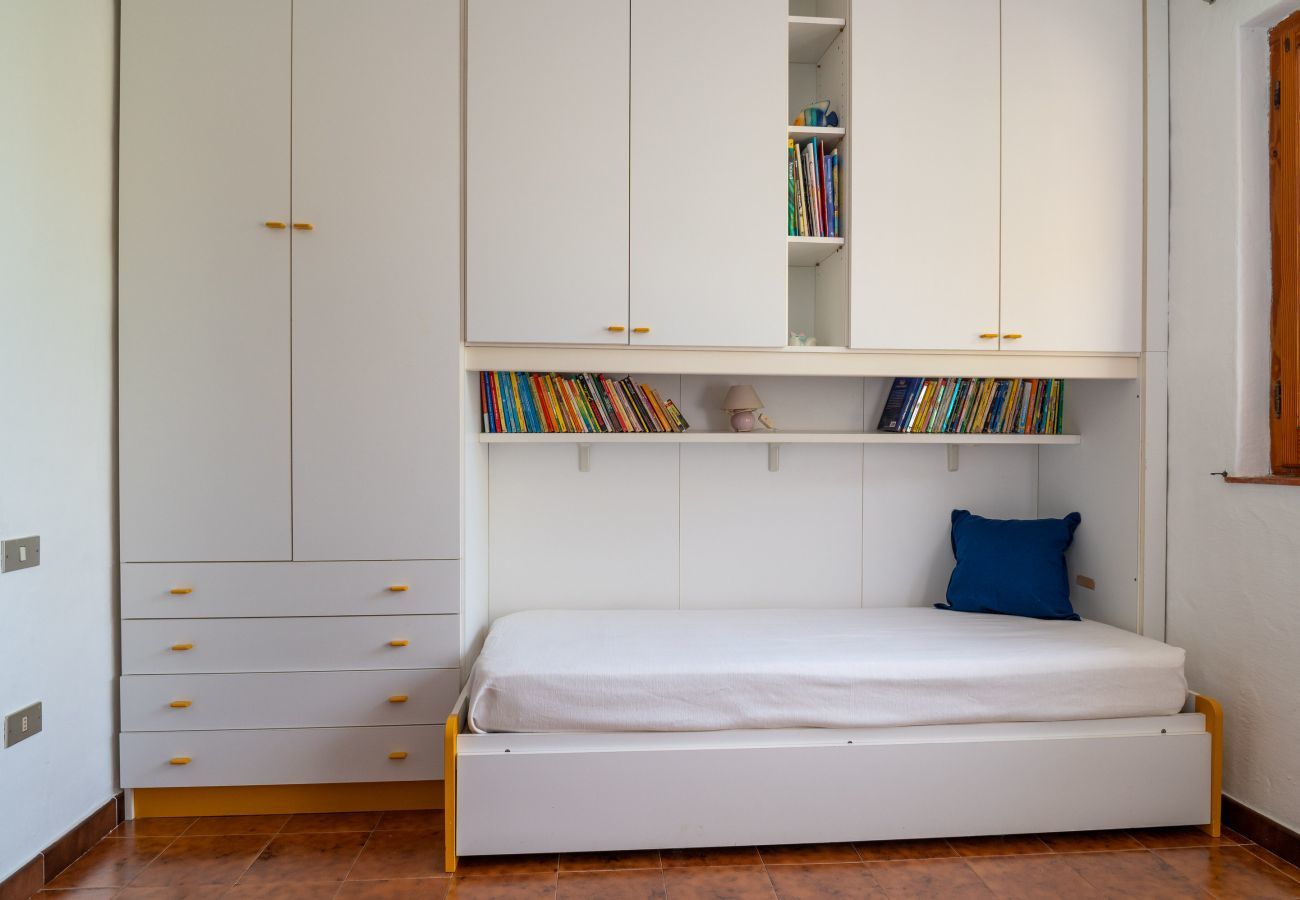 Al piano superiore si trova la zona notte, composta da due camere matrimoniali e una camera con letto alla francese e letto singolo, servita da un bagno con doccia. Nel giardino retrostante è presente una doccia esterna, perfetta al rientro dalla spiaggia.