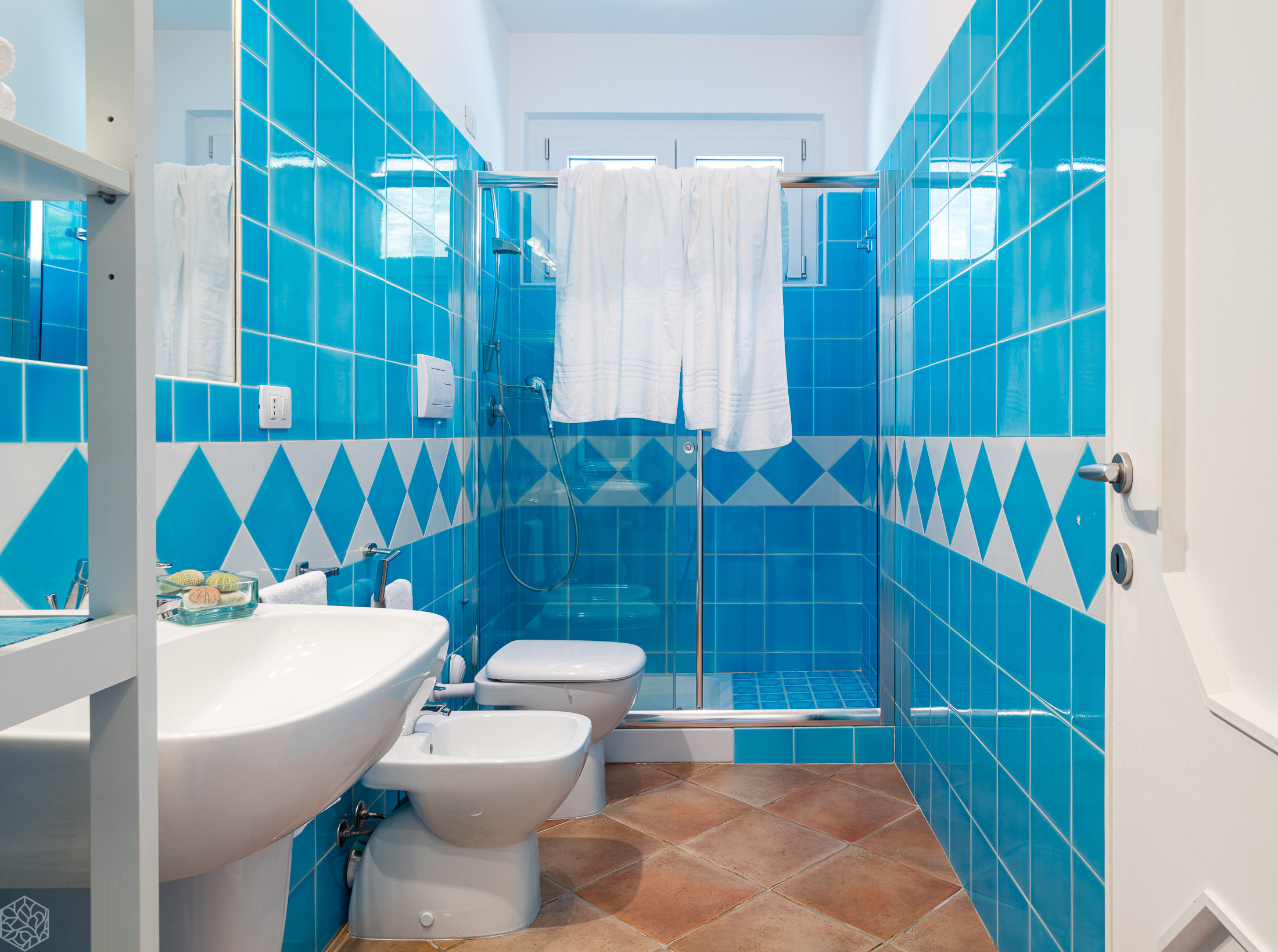 La zona notte include tre camere matrimoniali (6 posti letto totali): una camera master con affaccio sul mare, una camera con bagno en-suite e una terza camera matrimoniale. Un ulteriore bagno, dal design originale con lavabo giallo brillante, serve la zona notte. Ogni camera è dotata di topper morbidi, cuscini aggiuntivi, zanzariere e aria condizionata in ogni ambiente.