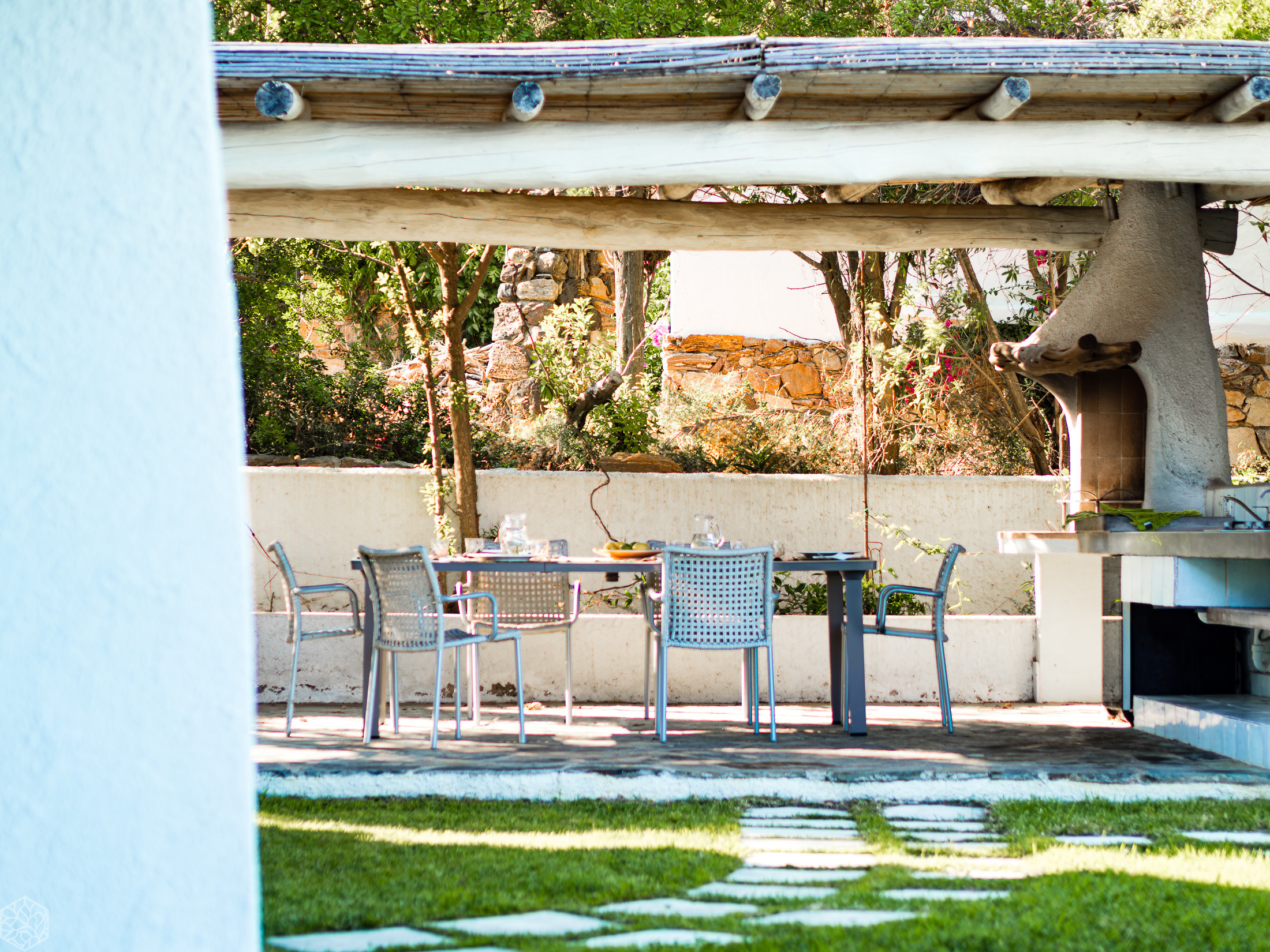 La proprietà offre numerosi spazi dedicati al relax, tra cui una grande veranda panoramica arredata con tavolo da pranzo, divani e lettini prendisole, ideale per godersi il silenzio e la brezza marina. Il giardino privato, ricco di essenze mediterranee, valorizza ulteriormente la vista sul golfo e su Tavolara. Disponibile un barbecue in muratura.