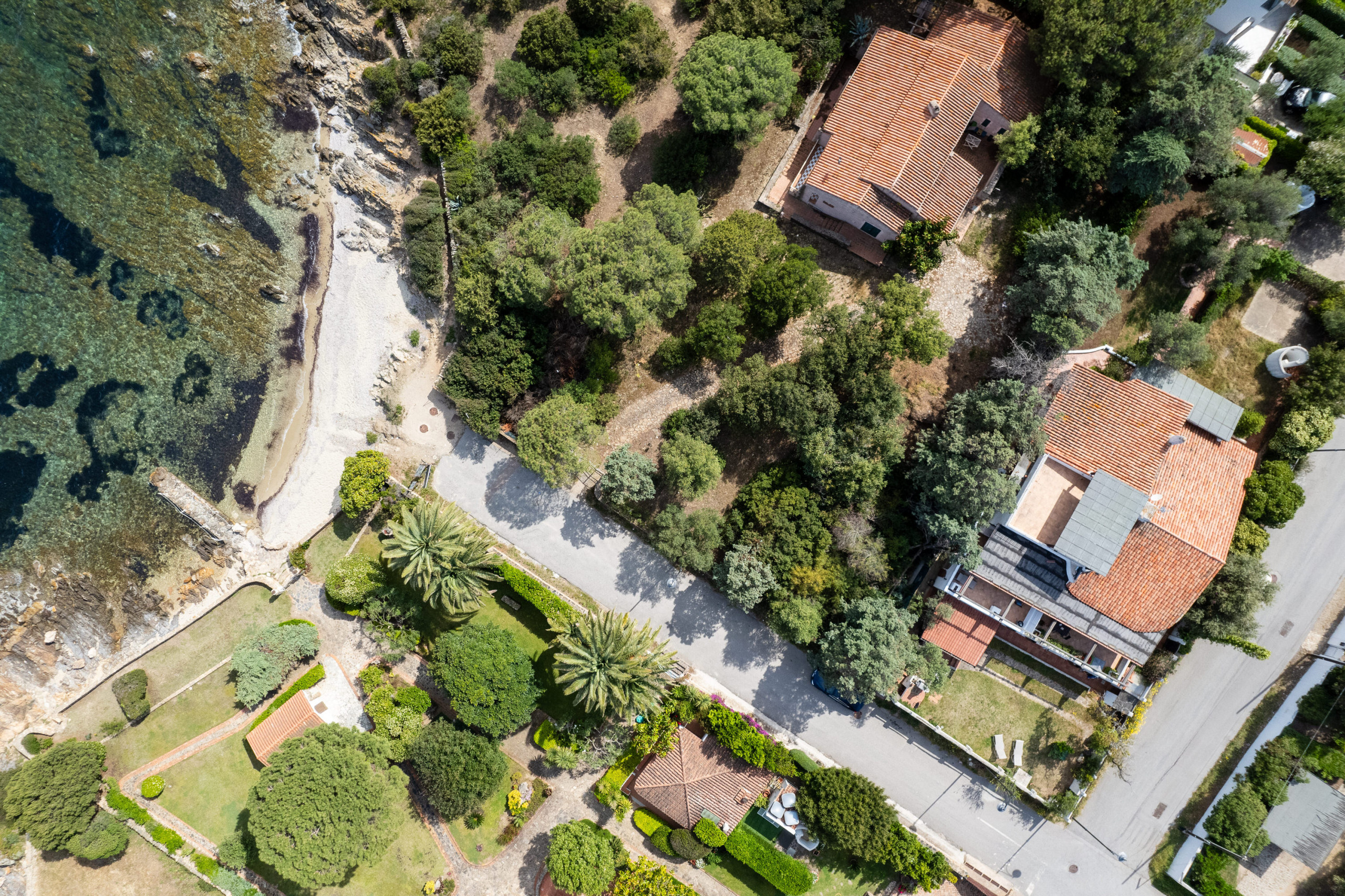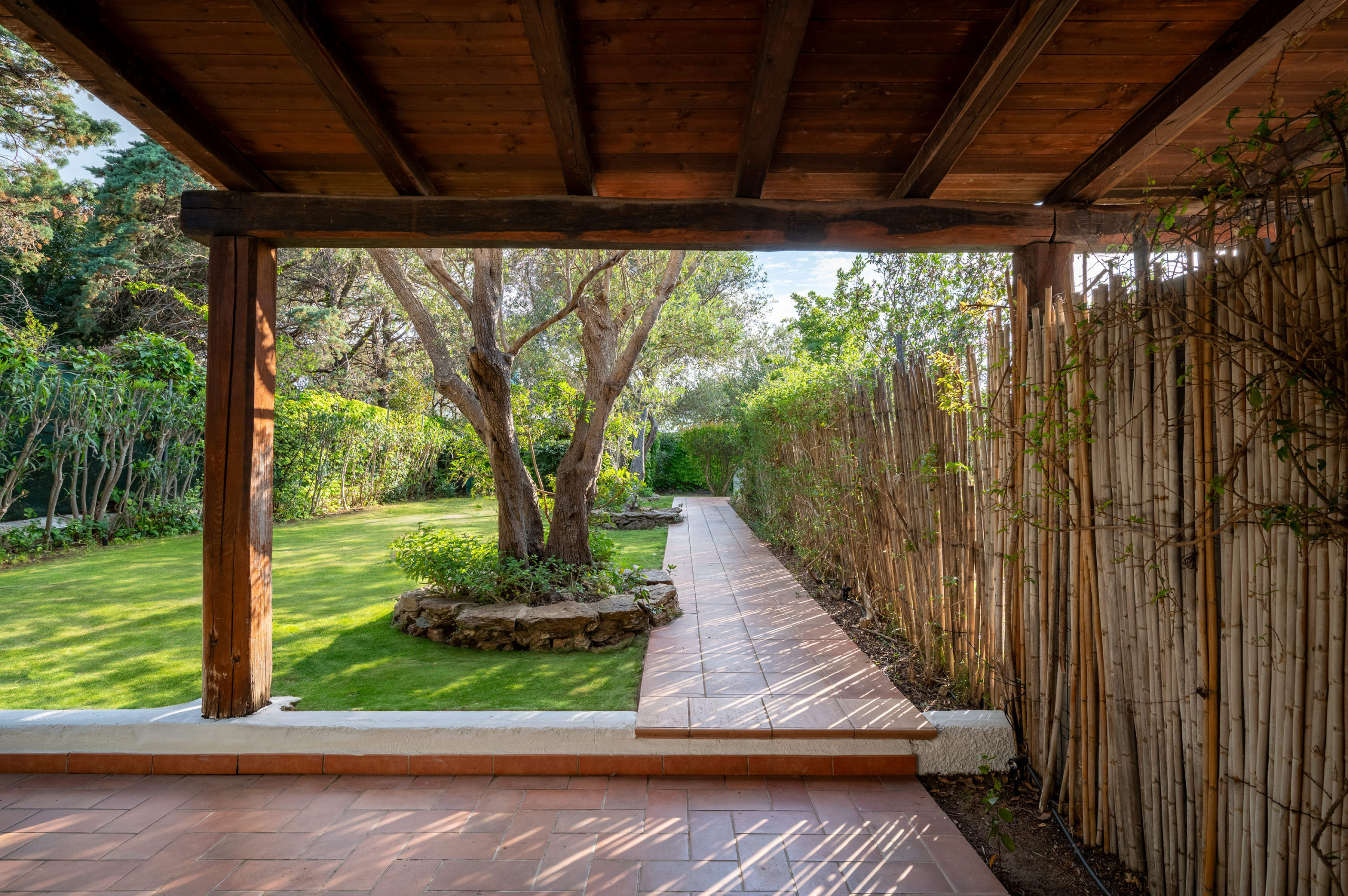 L’abitazione è circondata da un giardino con essenze mediterranee, parzialmente condiviso con una seconda unità. La veranda, orientata verso la costa, è uno degli spazi più vissuti della casa, mentre il cortile interno offre due posti auto riservati.