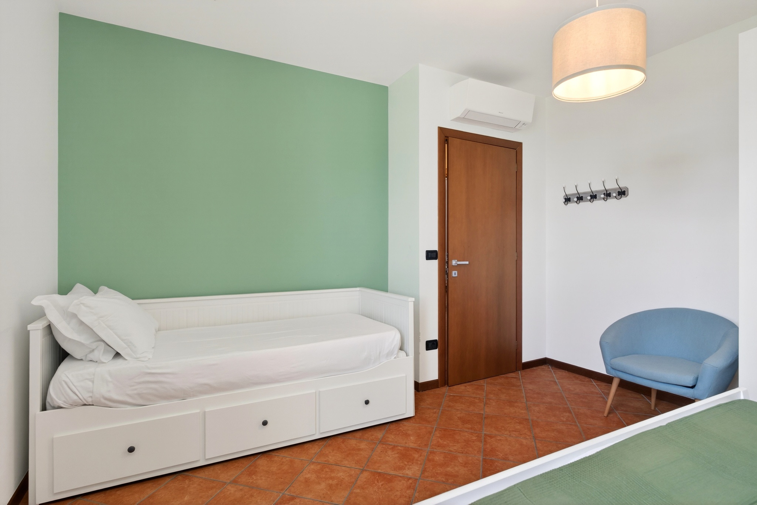 Die Wohnung Giarole, vollständig im Erdgeschoss gelegen, verfügt über ein großes Zimmer mit zwei nebeneinander stellbaren Einzelbetten mit Kleiderschrank, ein Doppelzimmer mit zusätzlichem Einzelbett, das in ein Doppelbett umgewandelt werden kann, ein kleines Badezimmer mit Dusche, ein Hauptbadezimmer mit Fenster und Waschecke mit Waschmaschine, Duschkabine und Doppelwaschbecken. Die geräumige Küche blickt auf die Seitenterrasse, die mit Tisch und Stühlen ausgestattet ist, und verfügt über eine moderne Küche mit Geschirrspüler, Induktionskochfeld, Mikrowelle, großem Kühlschrank mit Gefrierfach, amerikanischer Theke zum Frühstücken, Coffee Corner mit deutscher Kaffeemaschine und Kapselkaffeemaschine. Der Wohnbereich, ausgestattet mit Sofa, Sesseln, Satelliten-TV und großem Esstisch, öffnet sich zur überdachten Terrasse mit Lounge-Bereich und bietet einen angenehmen Blick auf Garten und Pool.