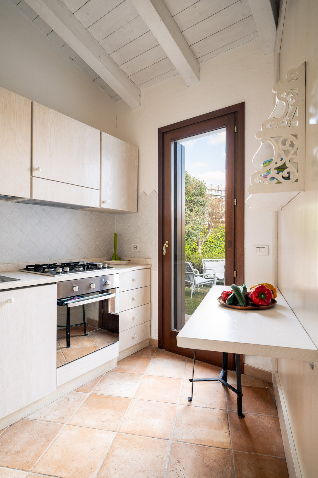 Der Wohnbereich öffnet sich direkt zum Garten und schafft eine fließende Verbindung zwischen Innen- und Außenbereich sowie eine entspannte Atmosphäre. Die Unterkunft verfügt über zwei Schlafzimmer, eines davon mit eigenem Bad, eine vollständig ausgestattete separate Küche sowie gepflegte Außenbereiche mit möblierter Terrasse und privatem Garten.