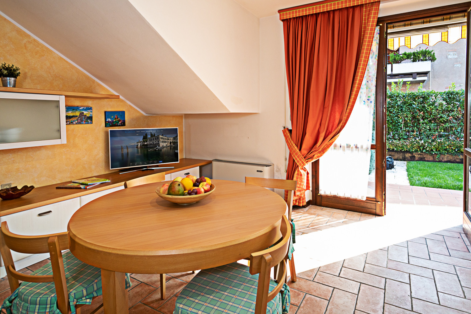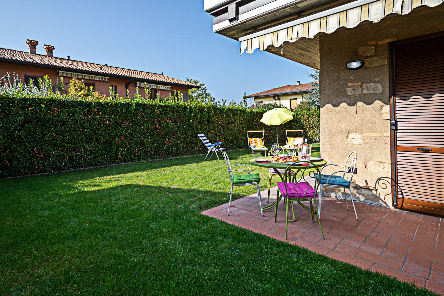 Die komfortable Wohnung Iris mit ca. 65 m² befindet sich im Erdgeschoss eines ruhigen Wohnkomplexes und bietet einen privaten Garten auf drei Seiten mit Sonnensegel, Tisch und Stühlen, wo man sich an heißen Sommertagen oder nach einem Ausflug in die charakteristischen Dörfer des Gardasees entspannen kann.