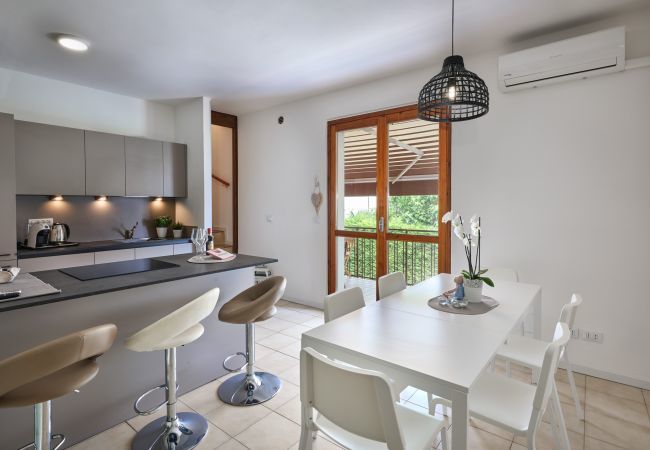 Die komfortable Wohnung Iris mit ca. 65 m² befindet sich im Erdgeschoss und bietet einen auf drei Seiten eingezäunten Garten sowie eine Terrasse mit Sonnensegel, Tisch und Stühlen, wo man sich an heißen Sommertagen oder nach einem Ausflug in die charakteristischen Dörfer des Gardasees entspannen kann.