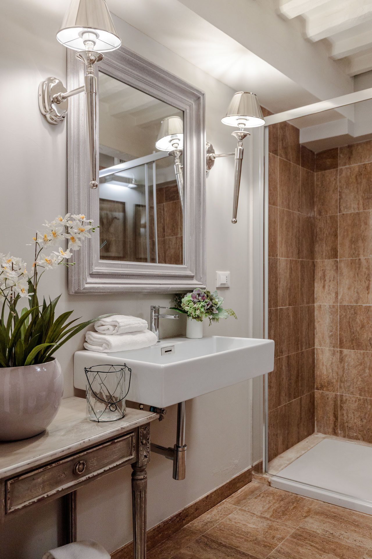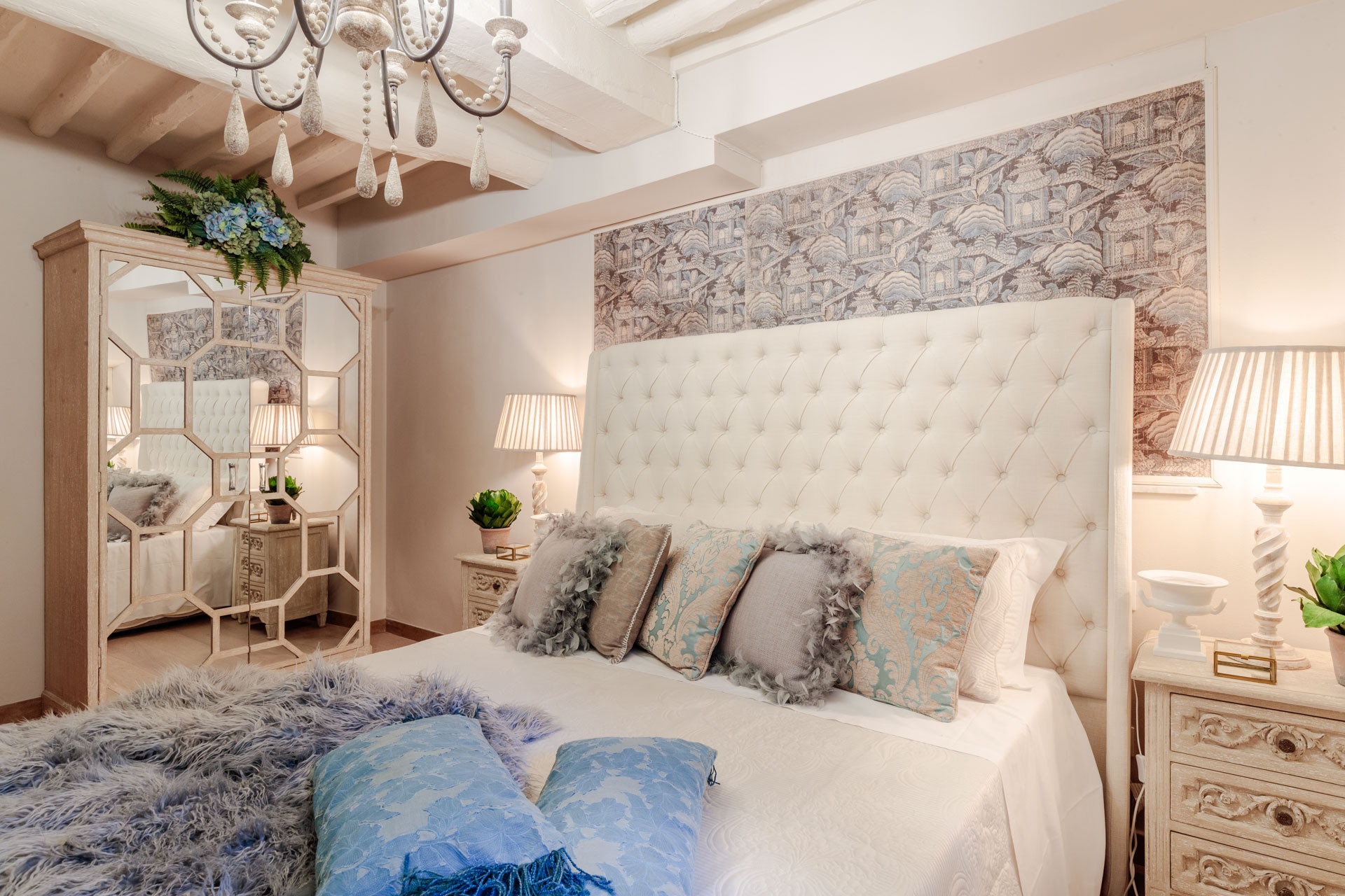 The romantic living room welcomes you with a blend of classic charm and contemporary style. The master bedroom, adorned with hand-painted wallpaper, offers a serene retreat with a plush master bed bathed in the soft glow of a chandelier. Ample windows frame views of a secret garden, and whitewashed beamed ceilings evoke Lucca's storied past. The bathroom is a chic sanctuary, featuring a marble-built shower that adds a touch of luxury to your daily routine.
