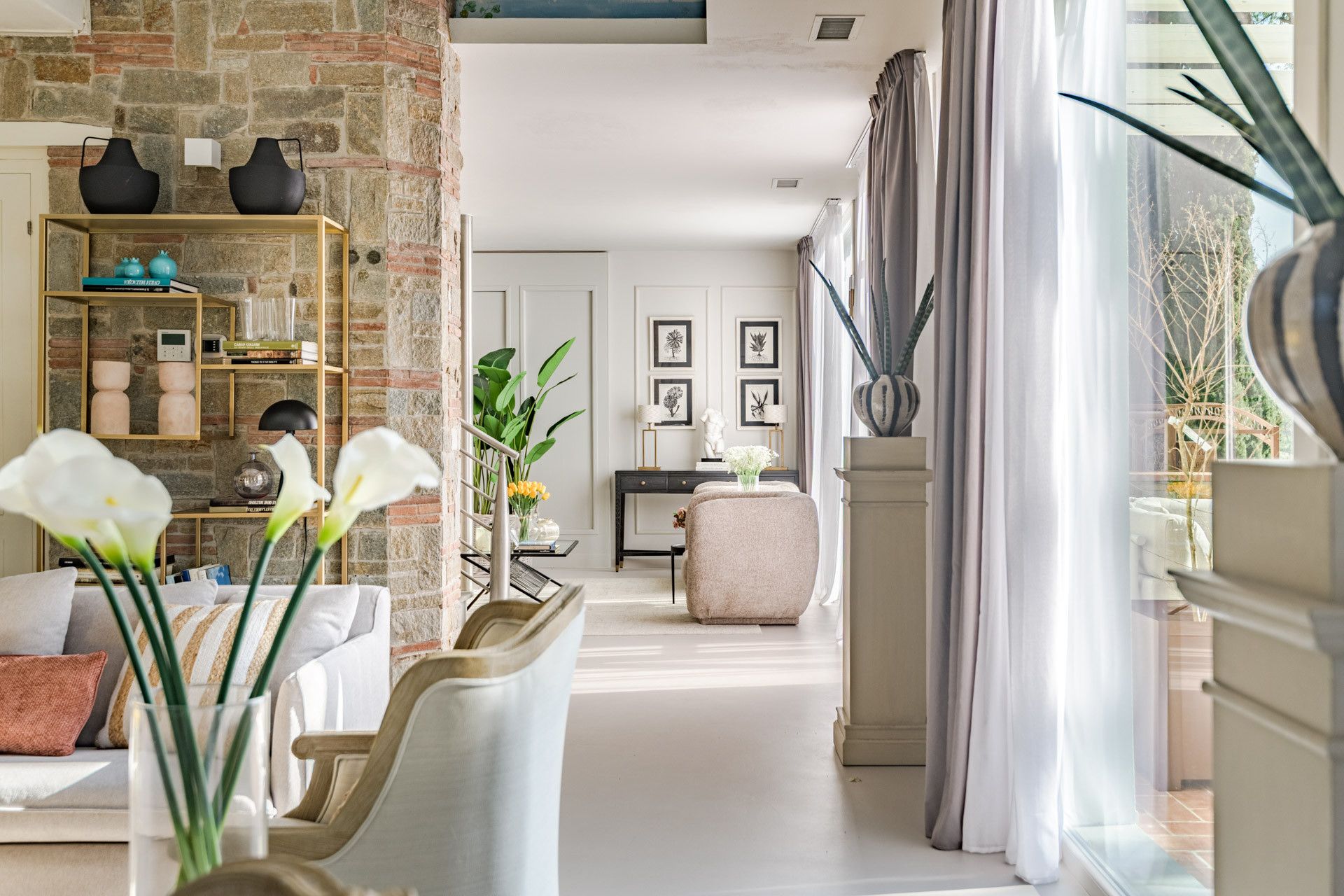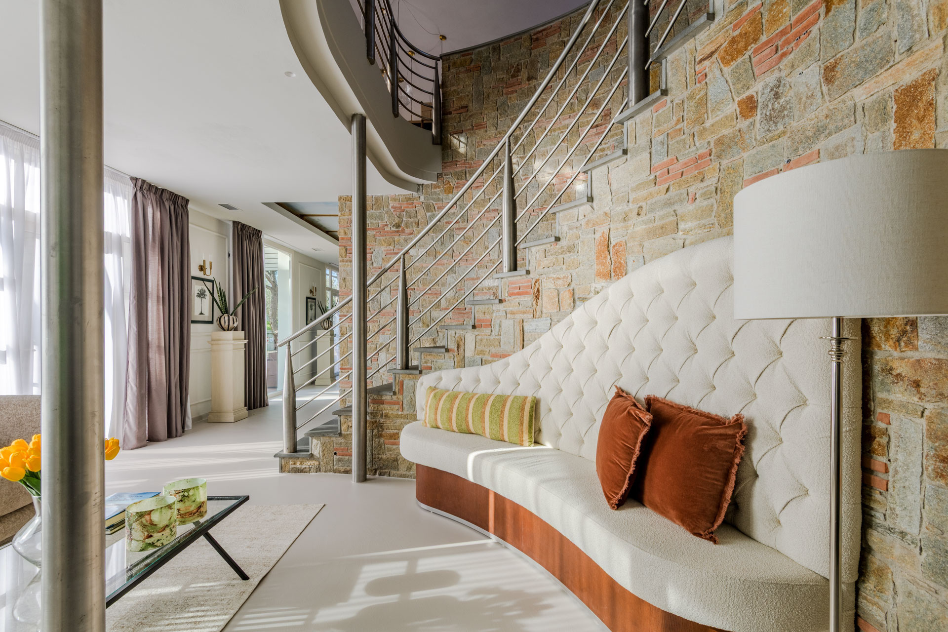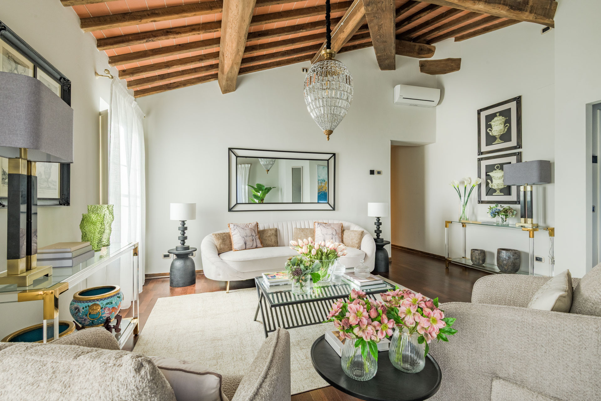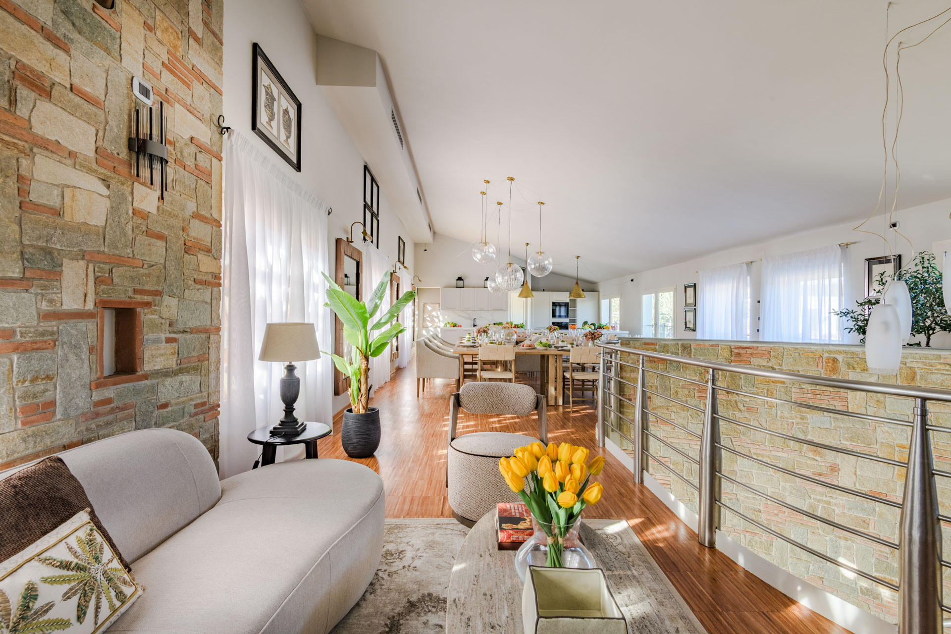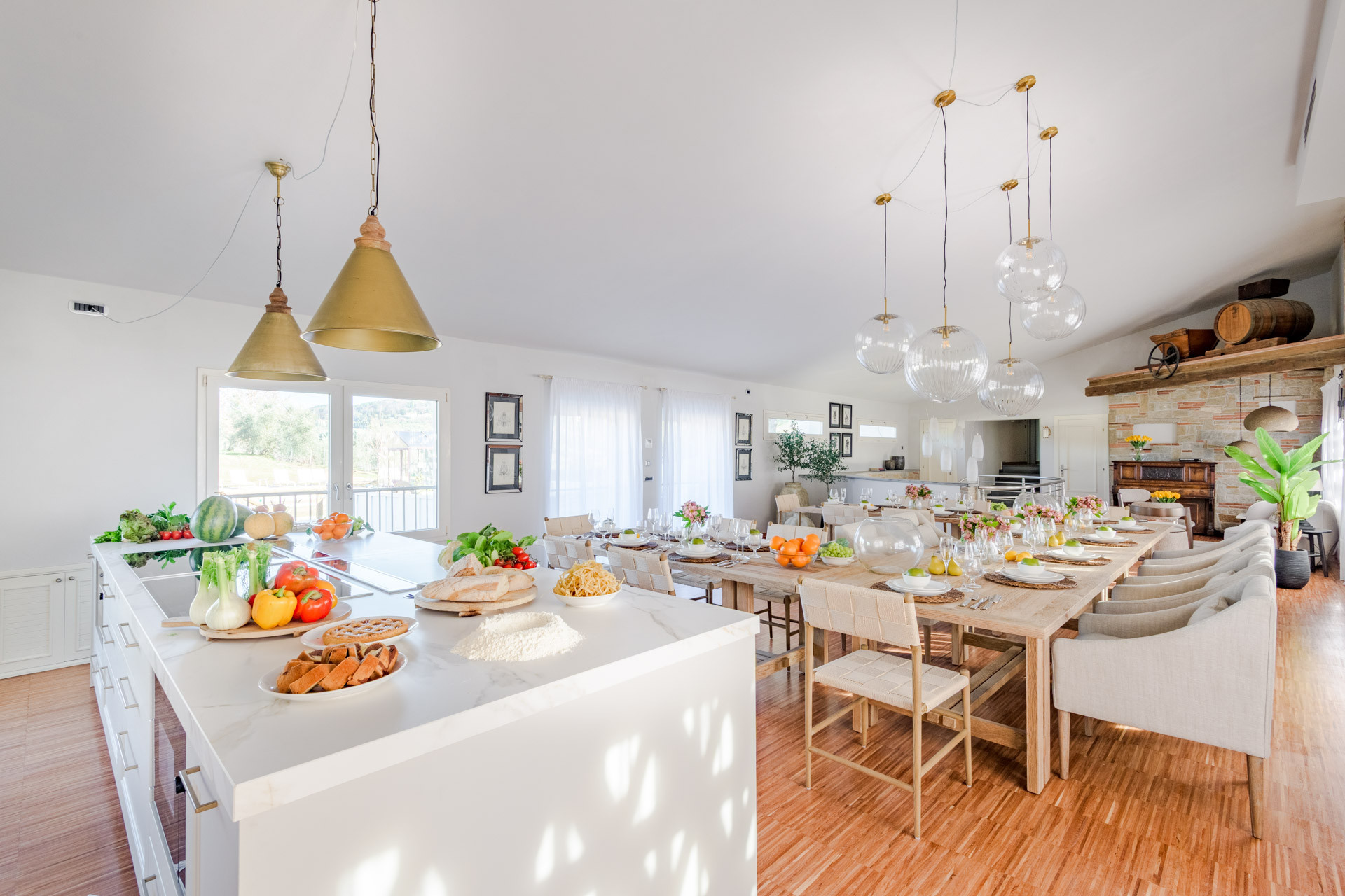 Erstes Stockwerk: Beim Ersteigen der majestätischen Treppe betreten Sie einen spektakulären Wohnbereich. Ein zweites Wohnzimmer führt zur weitläufigen Esszone mit einem "C-förmigen" Tisch für 26 Personen und einer offenen Küche mit einer zentralen Kochinsel, ideal für Gruppenkochtreffen.