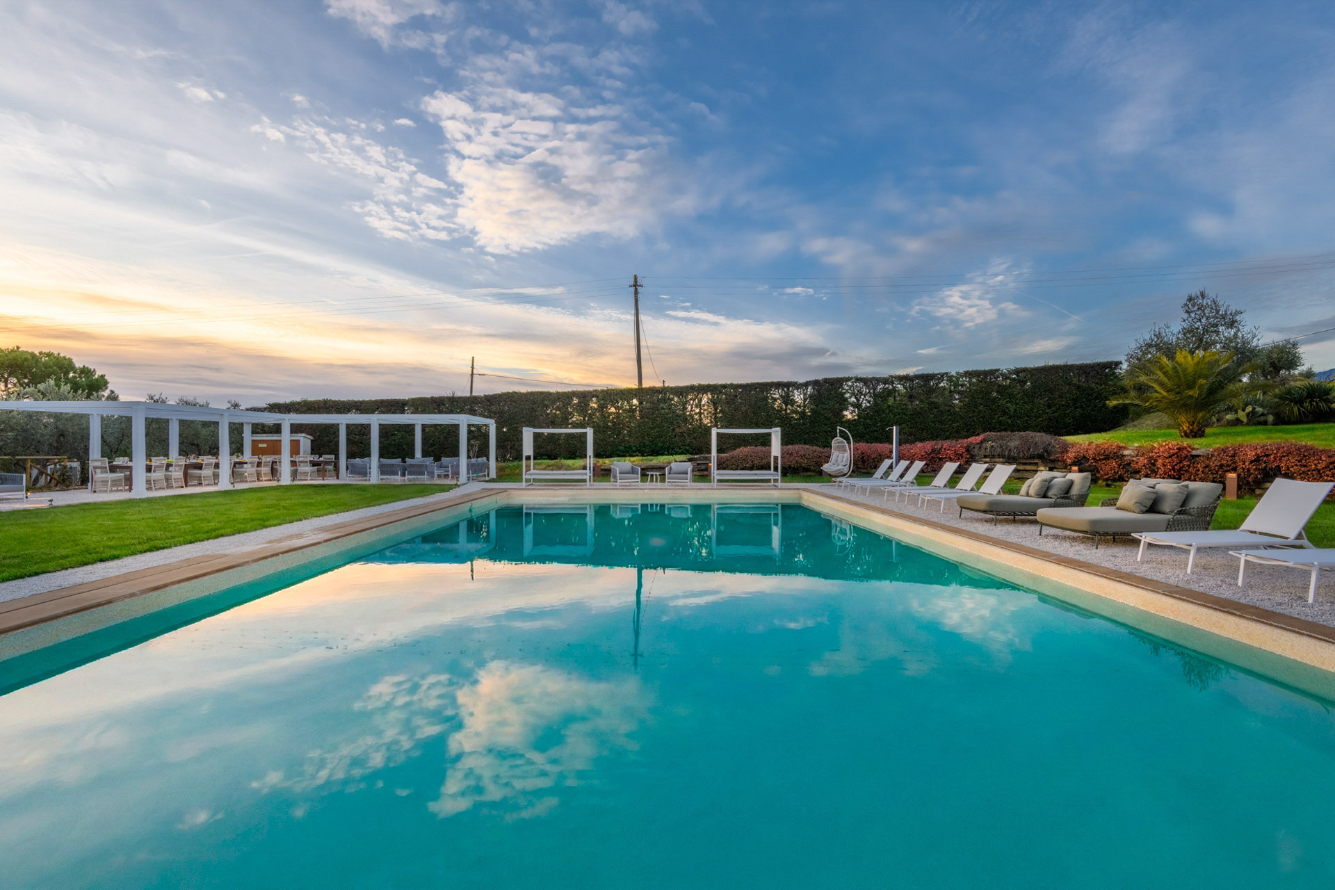 Traum-Pool: Ein 18 Meter großer Pool, umgeben von Sonnenliegen für jeden Gast und stilvollen Lounge-Bereichen.