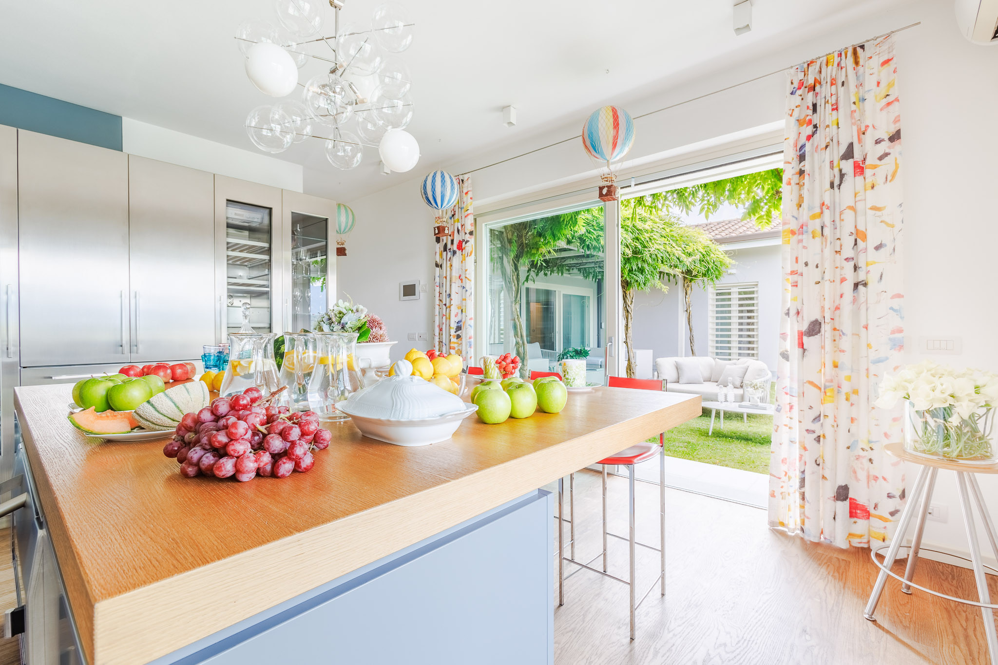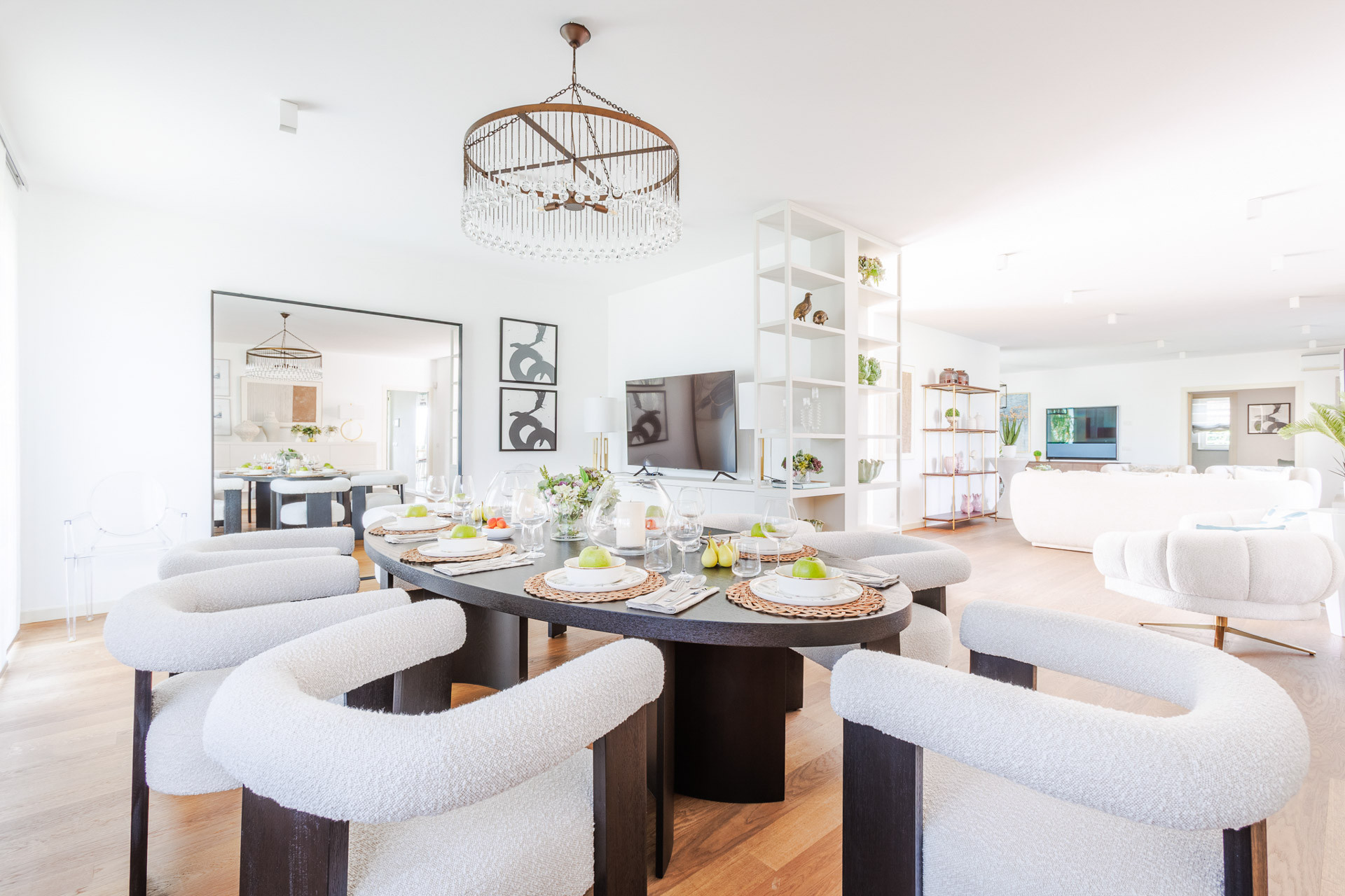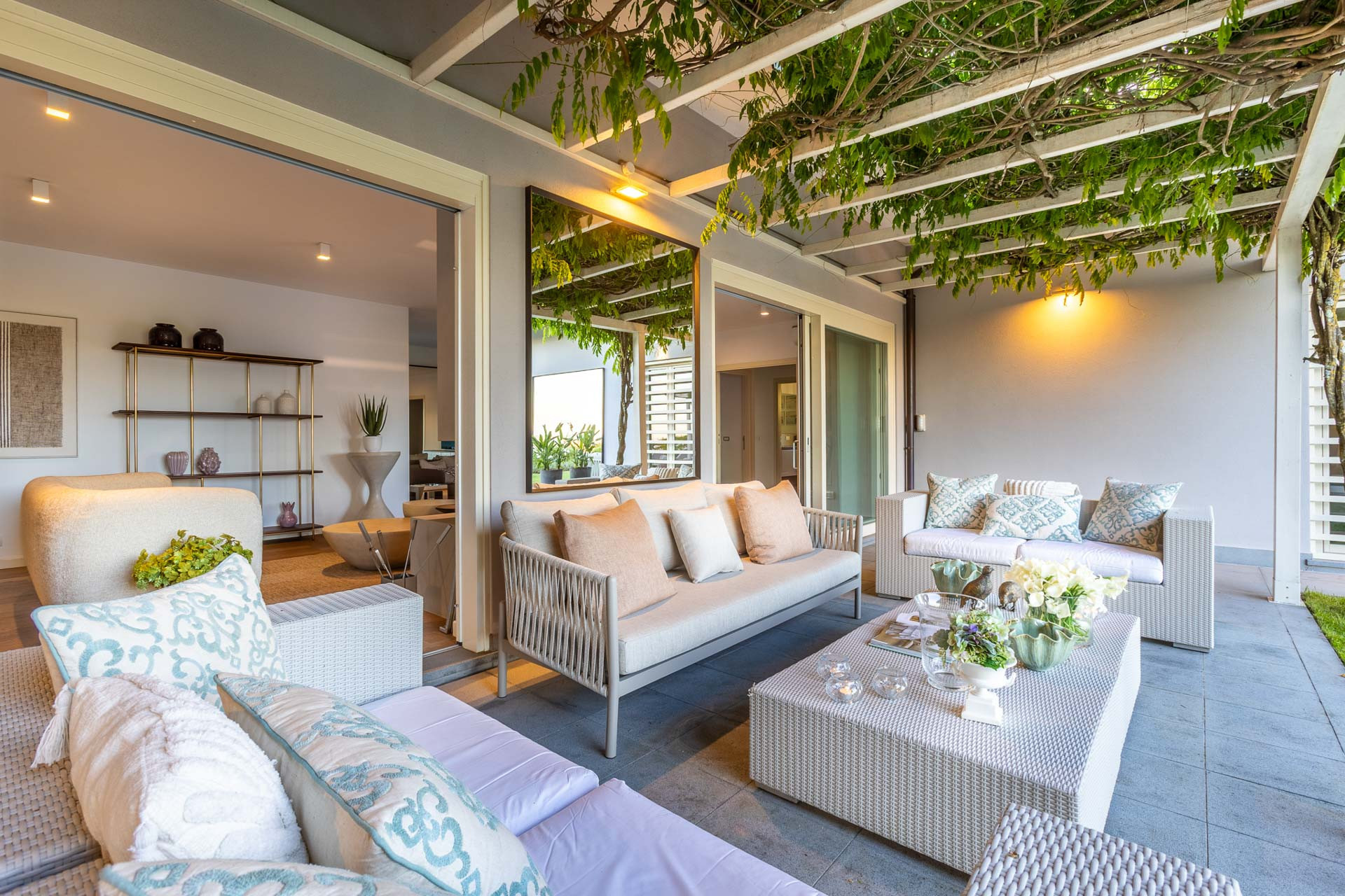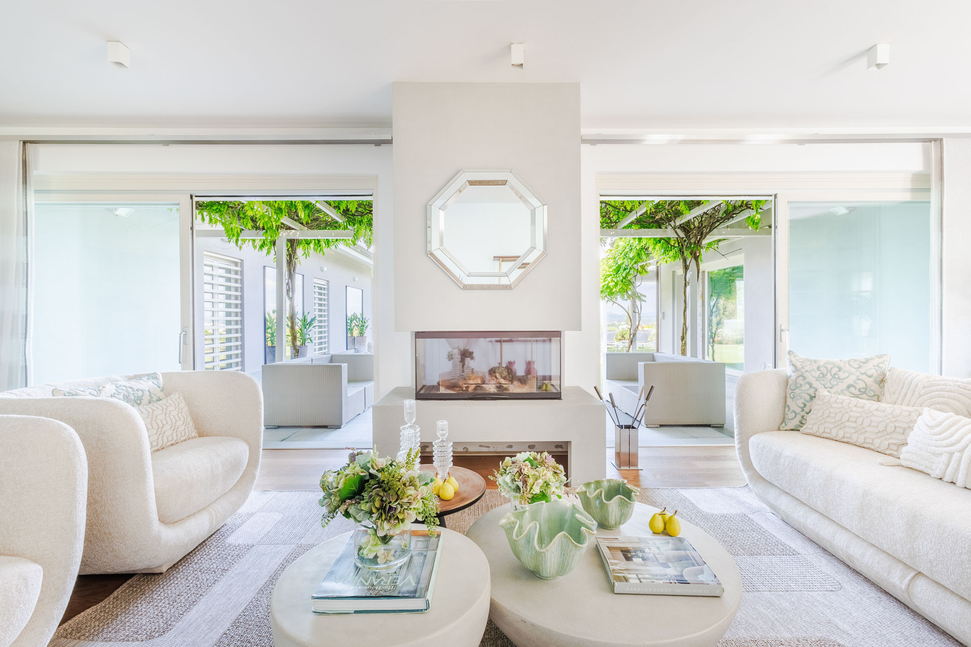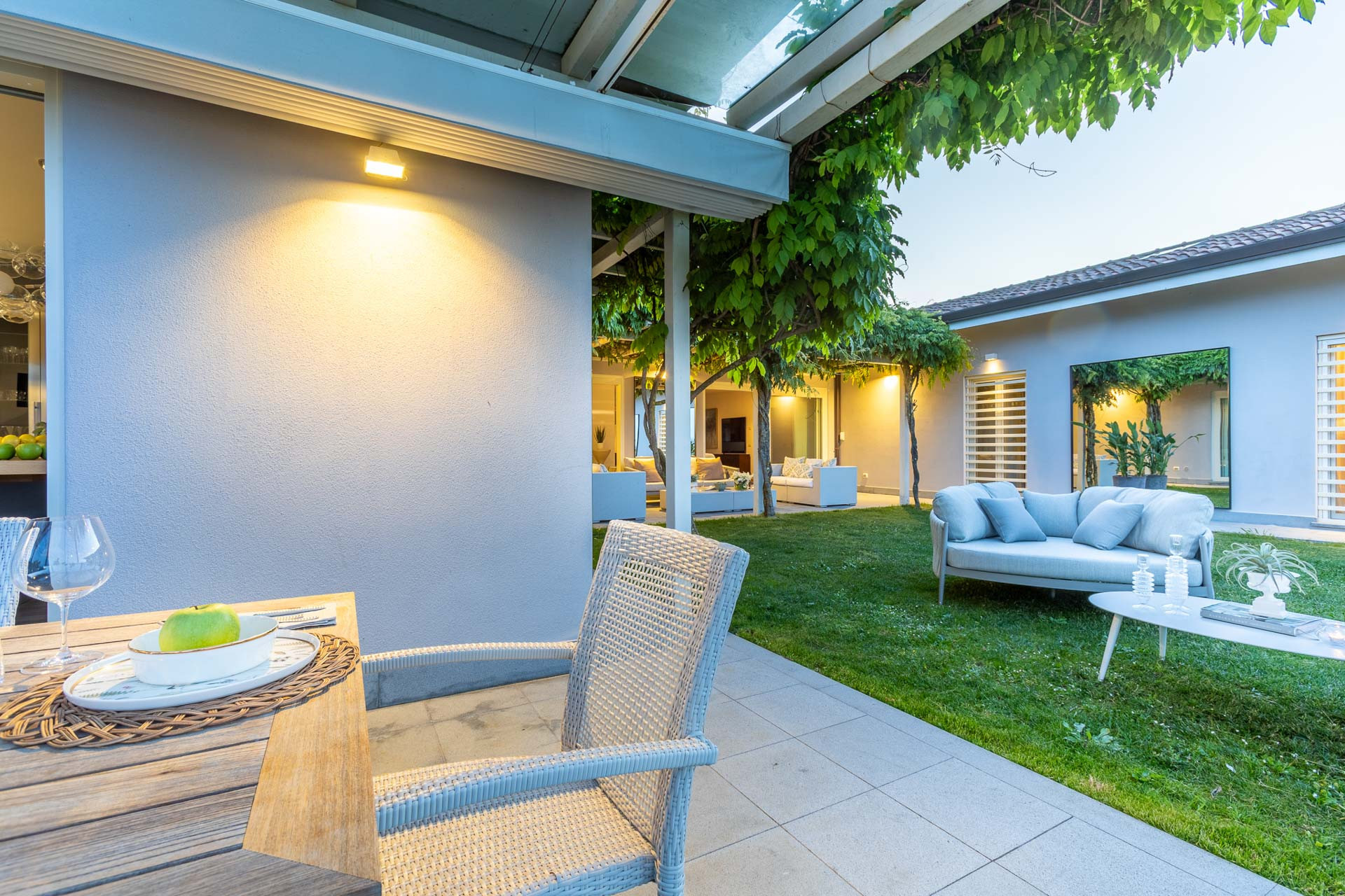 Die wichtigsten Wohnbereiche im Inneren öffnen sich durch mehrere Türen zum Garten und laden eine nach Garten duftende Brise in das Haus ein. Der offene Raum verfügt über eine voll ausgestattete Küche mit Kamin und einem Esstisch für zehn Personen sowie ein großes Wohnzimmer mit Fernseher und einem zusätzlichen Esstisch. Die Küche ist komplett mit hochwertigen Geräten für den modernen Koch ausgestattet. Klimaanlage und exzellentes WIFI schaffen eine komfortable Umgebung für alle Gäste.