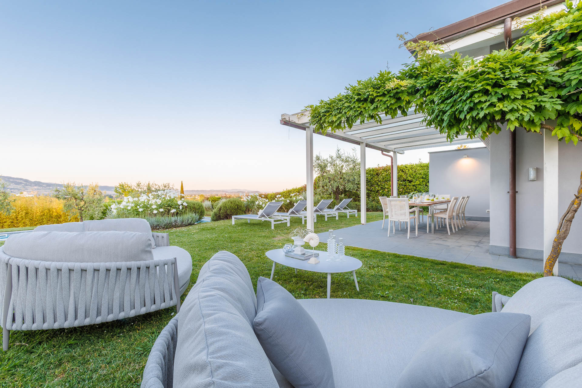 Genießen Sie den Morgen am riesigen Swimmingpool der Villa, baden Sie in seinem kristallklaren Wasser und entspannen Sie sich auf eleganten Sonnenliegen. Genießen Sie ein Mittagessen im Freien an dem schönen Tisch unter der Laube, während das Wasser des Pools neben Ihnen das hügelige Ufer umspült. Erkunden Sie lokale Weingüter, Bauernhöfe und Lebensmittel rund um die Villa und kehren Sie am Abend zurück, um auf dem Rasen Digestif zu trinken, während die funkelnde Oberfläche die Farben des Sonnenuntergangs widerspiegelt.