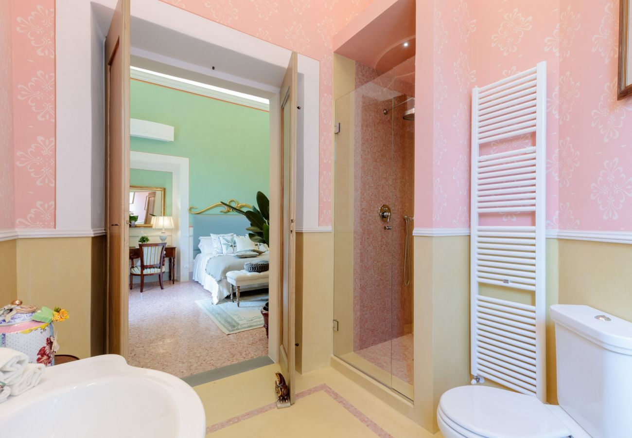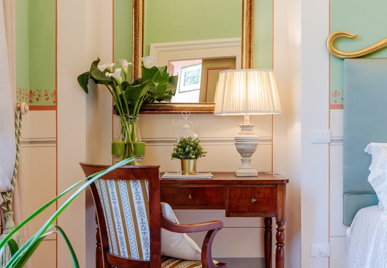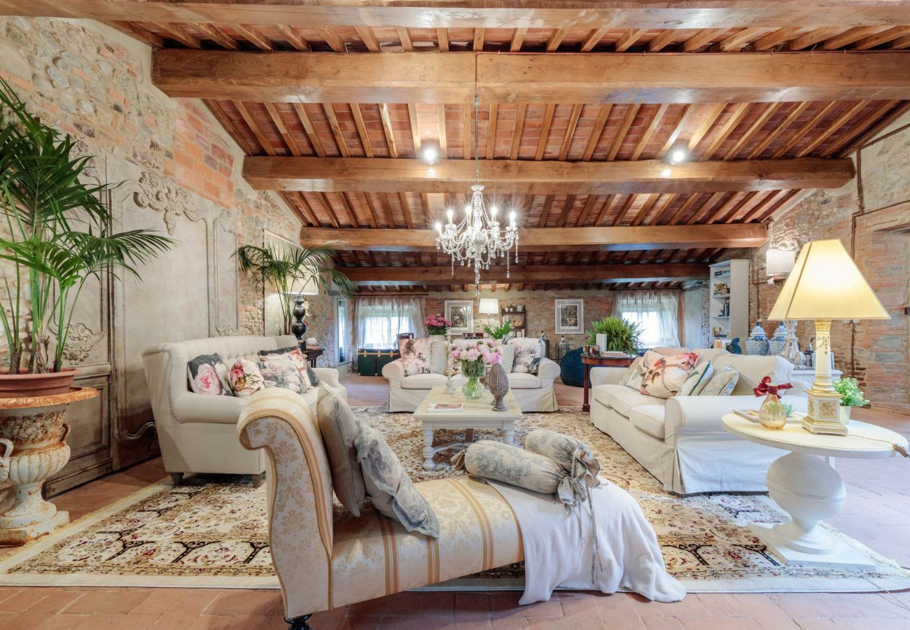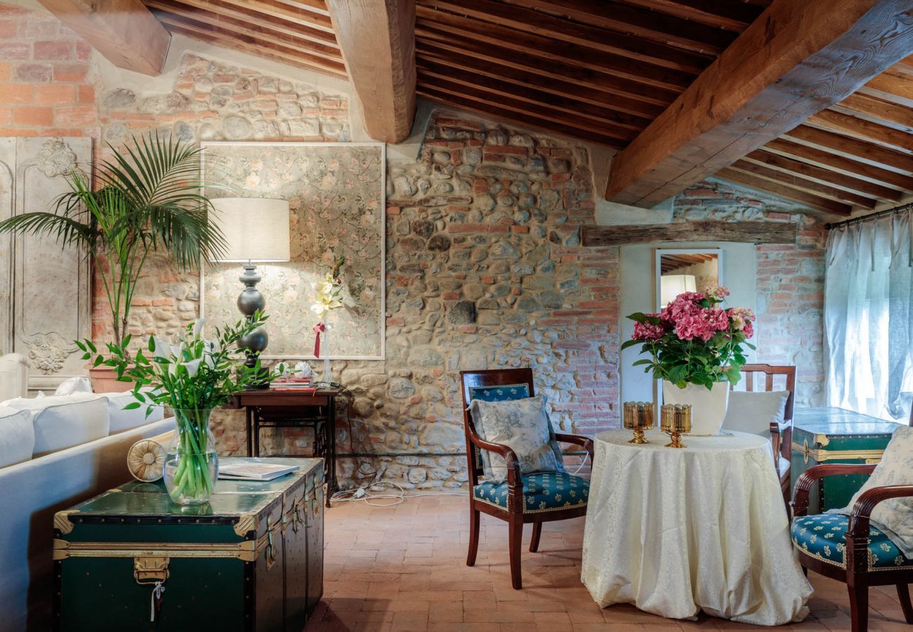 Die Innenräume der VILLA HUGO sind klassisch und prächtig, mit Cotto-Böden, originalem Kamin, weichen Polstern, vollen Vorhängen und vielen Kronleuchtern, die die Wohnräume krönen. Im Erdgeschoss befindet sich eine voll ausgestattete Küche mit Zugang zur Außenveranda und ihren Ess- und Wohnbereichen. Im Erdgeschoss gibt es auch ein Esszimmer im Innenbereich mit Fernseher und Kamin, so dass Sie sich einfach im hellen, luftigen toskanischen Esszimmer niederlassen können, um Gerichte frisch aus dem Garten zu genießen und italienischen Wein zu probieren. Ein Badezimmer vervollständigt die Etage.