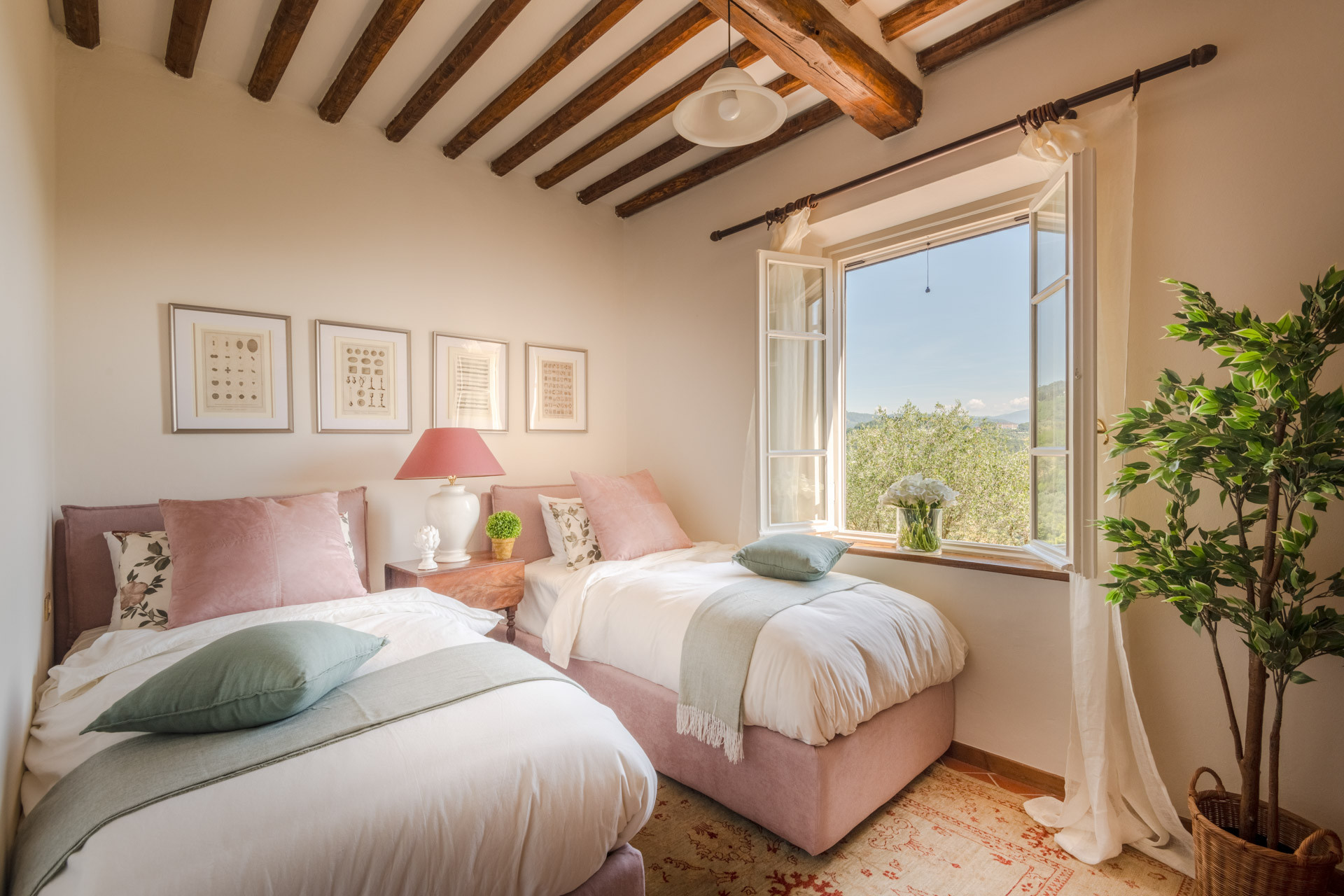 The villa’s story is as enchanting as its surroundings. Its owner, a New York architect with deep Italian roots, fell in love with Lucca’s medieval charm and iconic city walls. Her passion extended to the picturesque hamlet of Carignano, where the intoxicating scent of jasmine and lavender first welcomed her to what would become Villa Lontana.