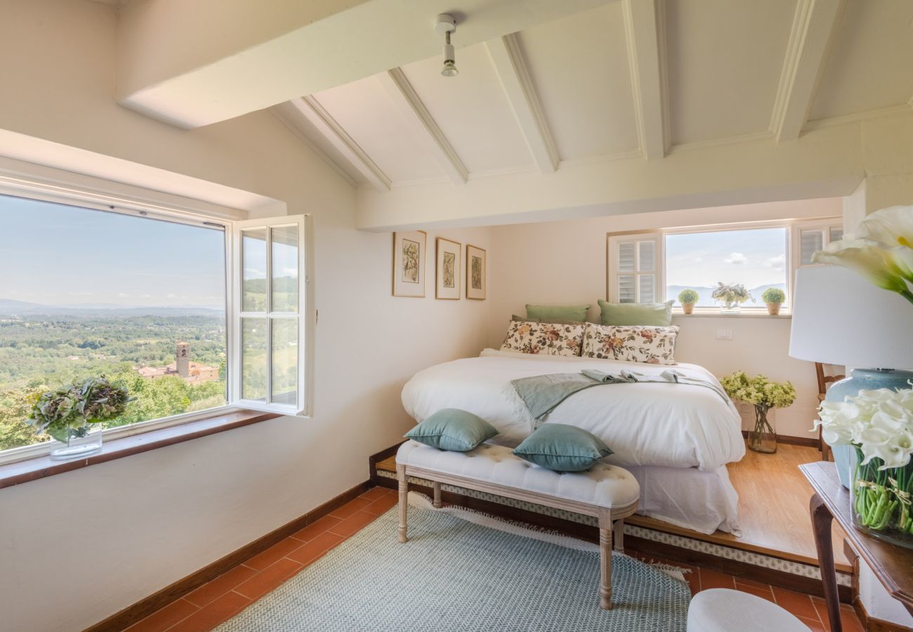 The villa itself is a vision of elegance and comfort. The cream-colored house with blue shutters stands proudly beside Lucca’s famed vineyards, offering a romantic view of a nearby medieval church. Meticulously renovated, the villa features two state-of-the-art kitchens, luxurious Carrara marble bathrooms, and modern amenities like high-speed WiFi and air conditioning.