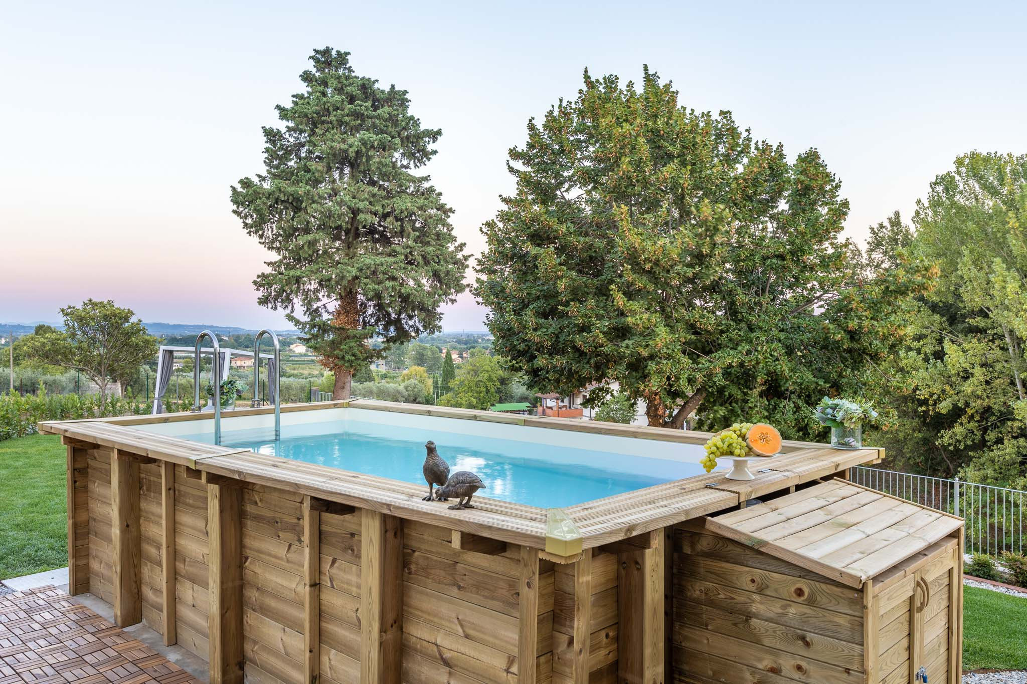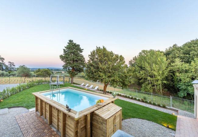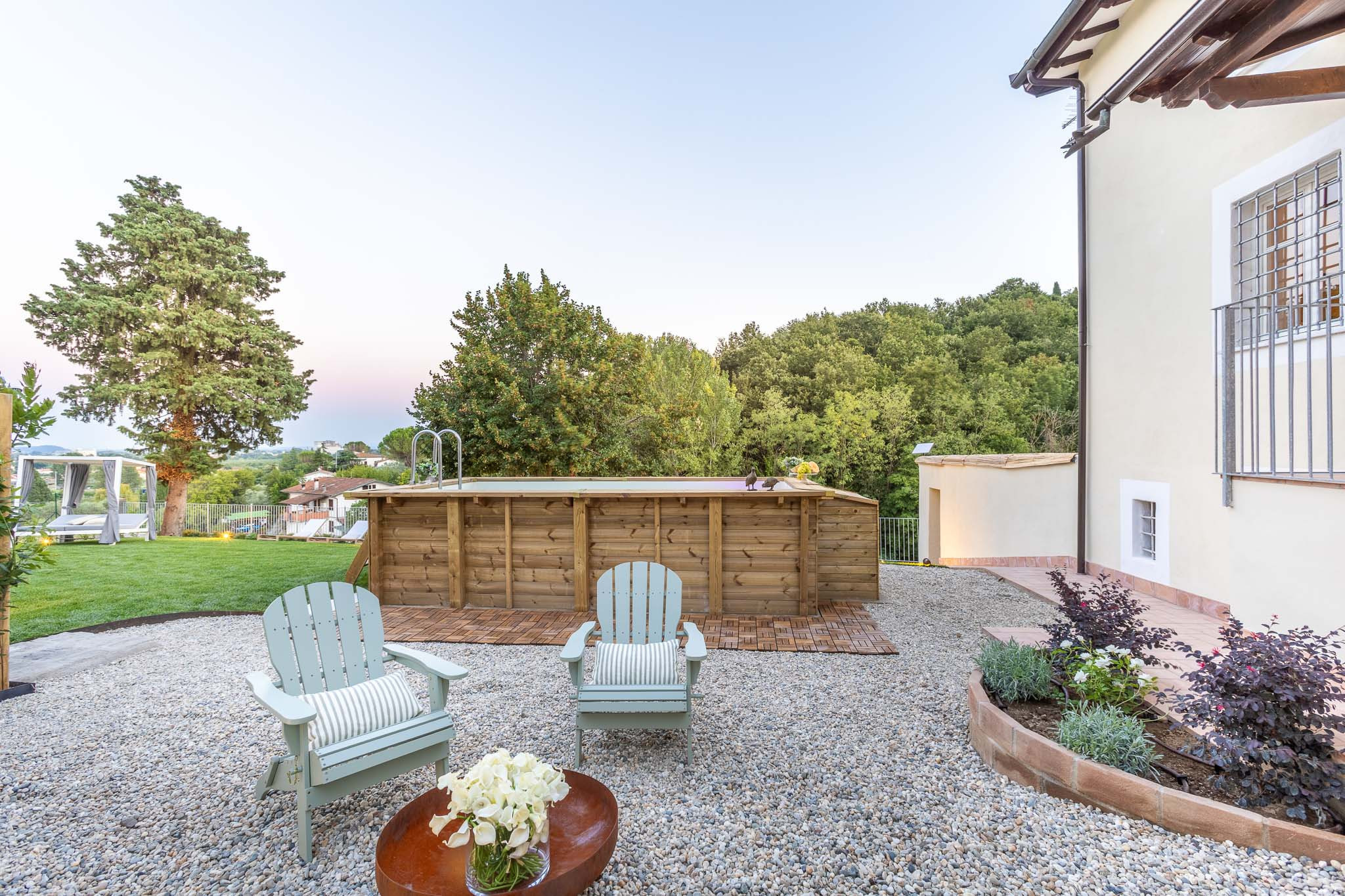 Outdoors, guests can enjoy a private above-ground pool set in the garden, complete with sun loungers for lazy afternoons under the Tuscan sun. A shaded outdoor dining area invites you to savor al fresco meals surrounded by greenery, making every moment feel like a holiday.