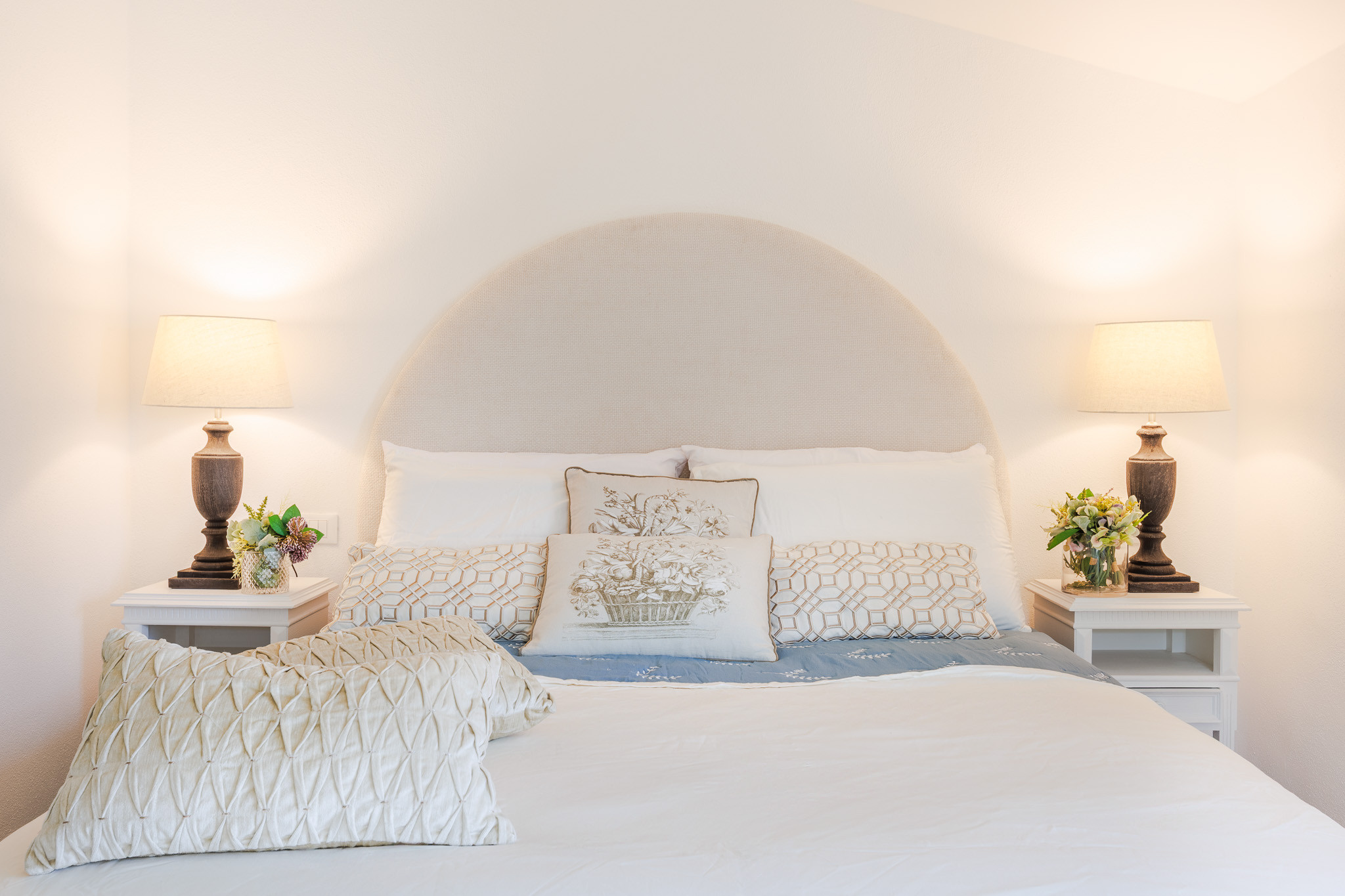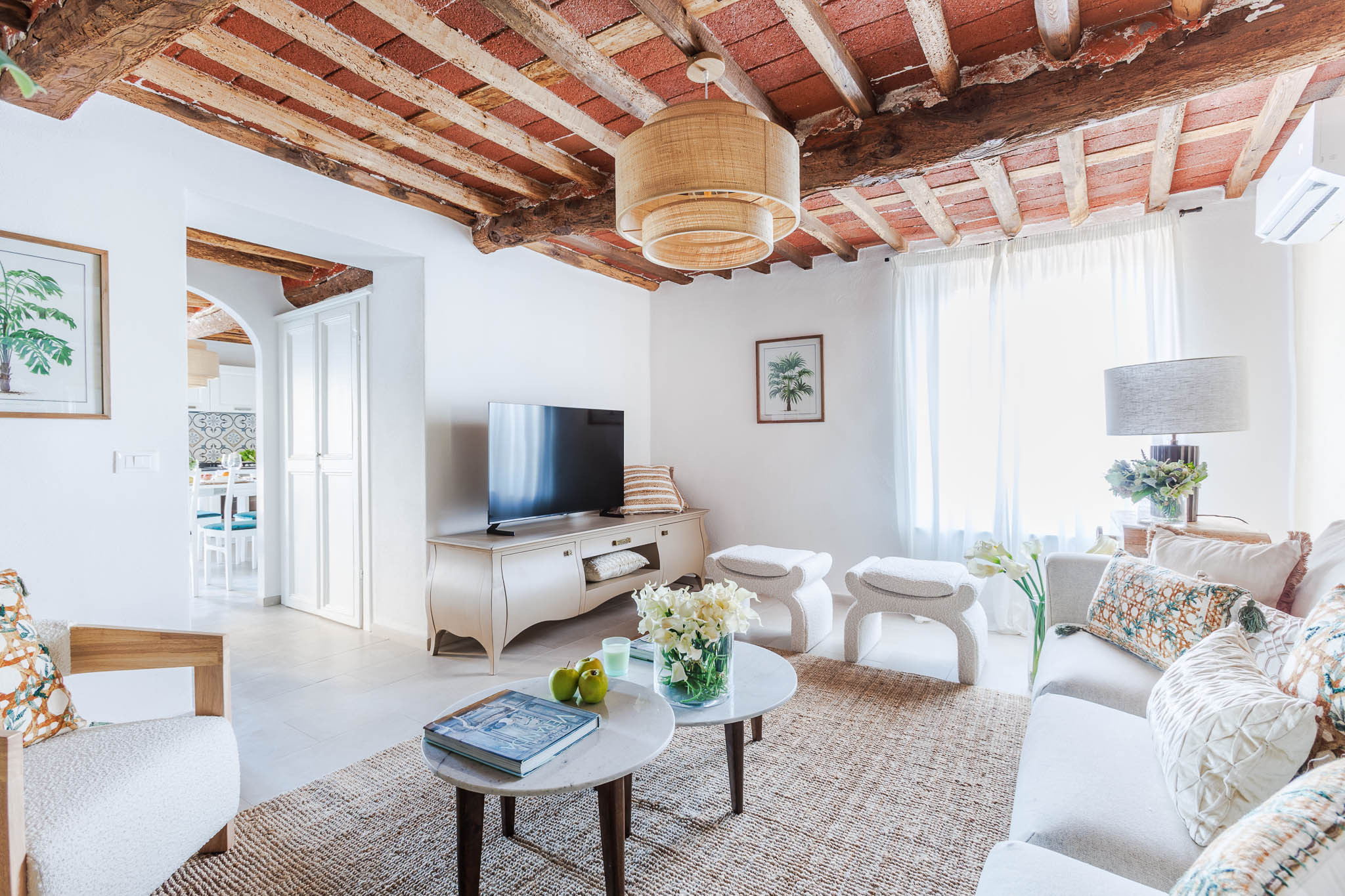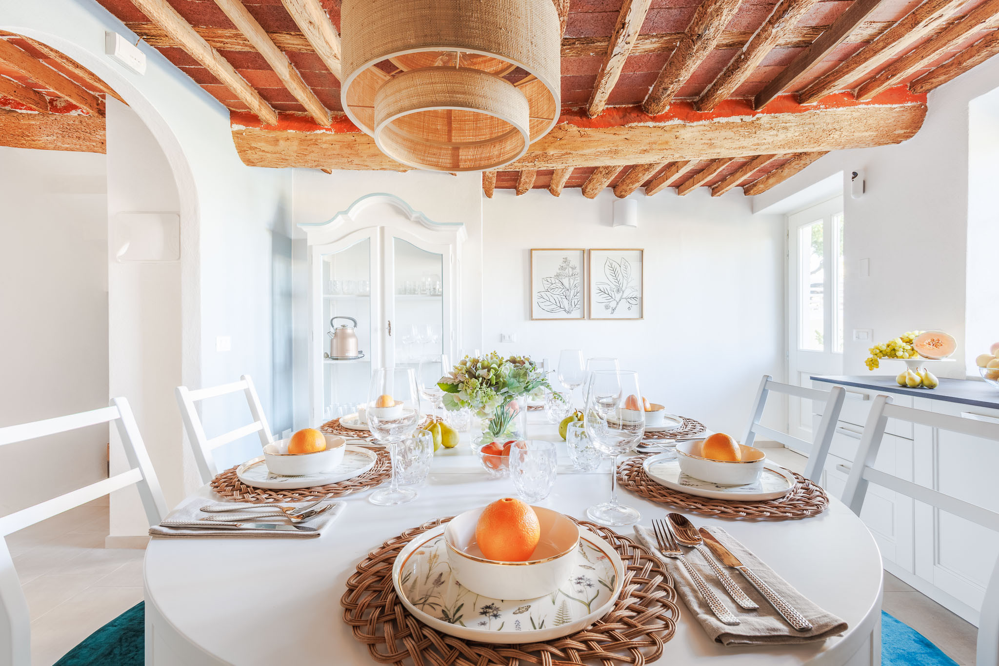 The interiors have been thoughtfully renovated with warm natural tones, wooden beamed ceilings, and elegant furnishings that create a cozy yet refined atmosphere. The living room and dining area are decorated with fresh, contemporary details while preserving the home’s original character, offering a welcoming space to gather with family and friends.