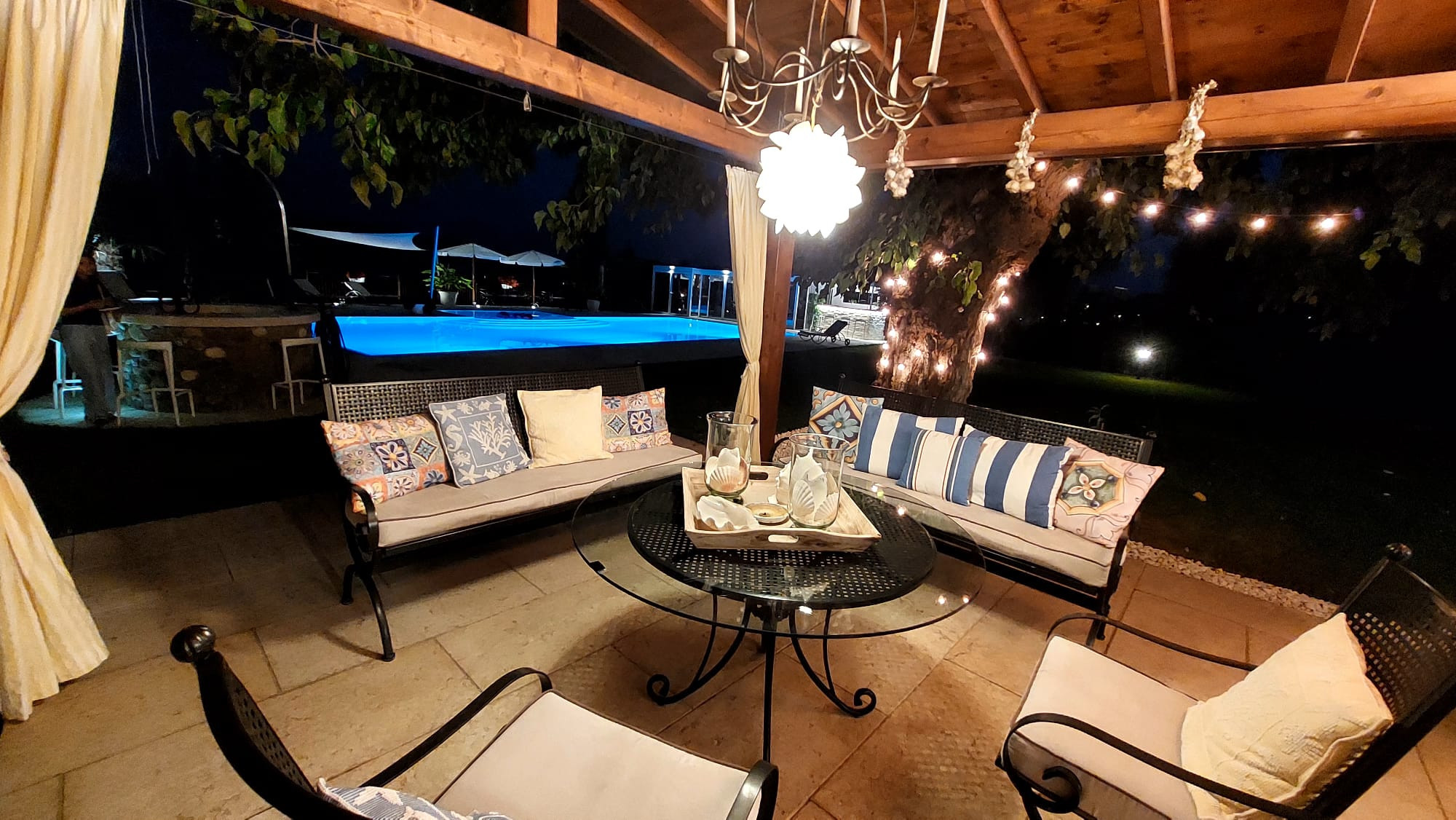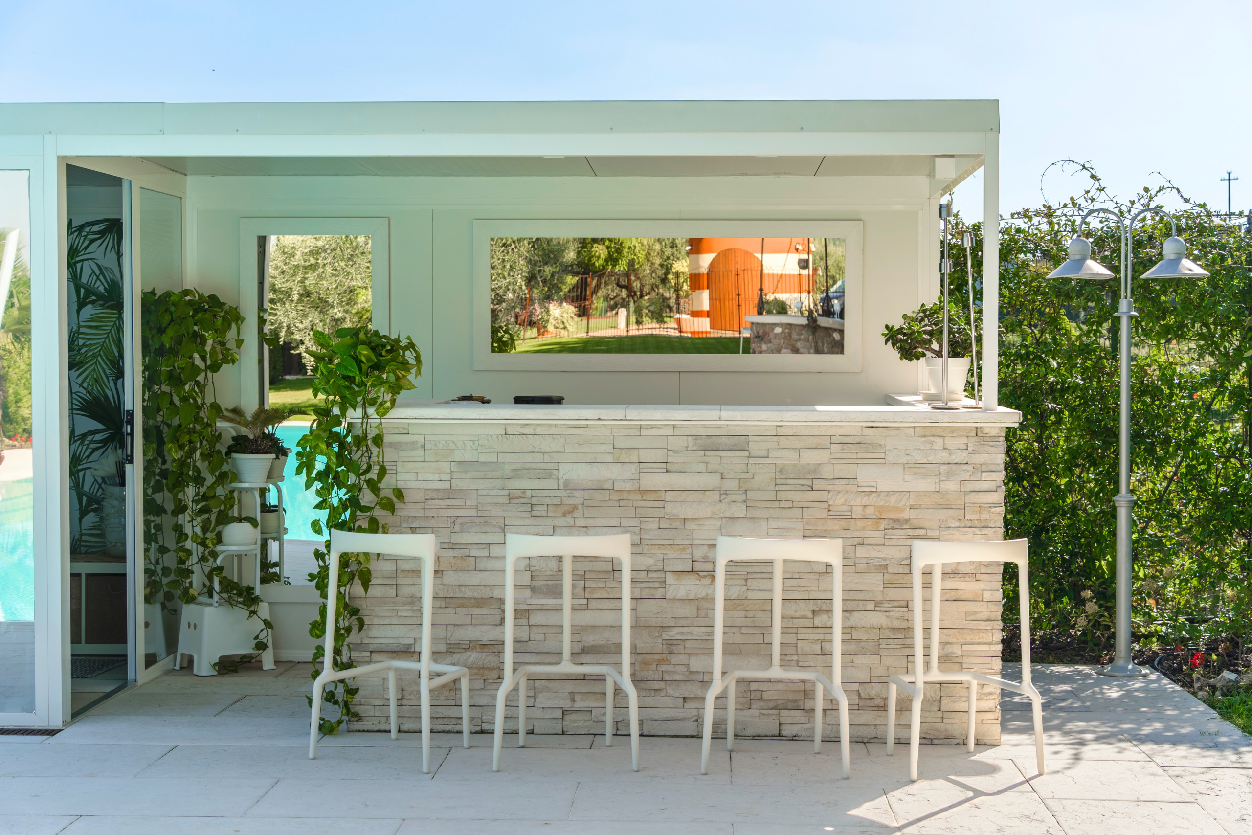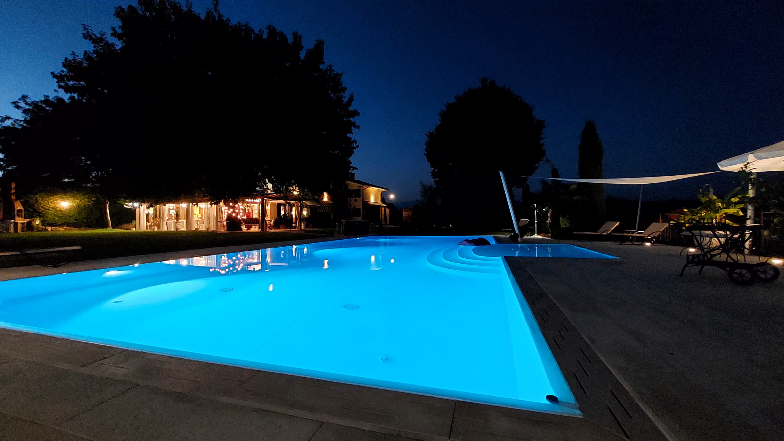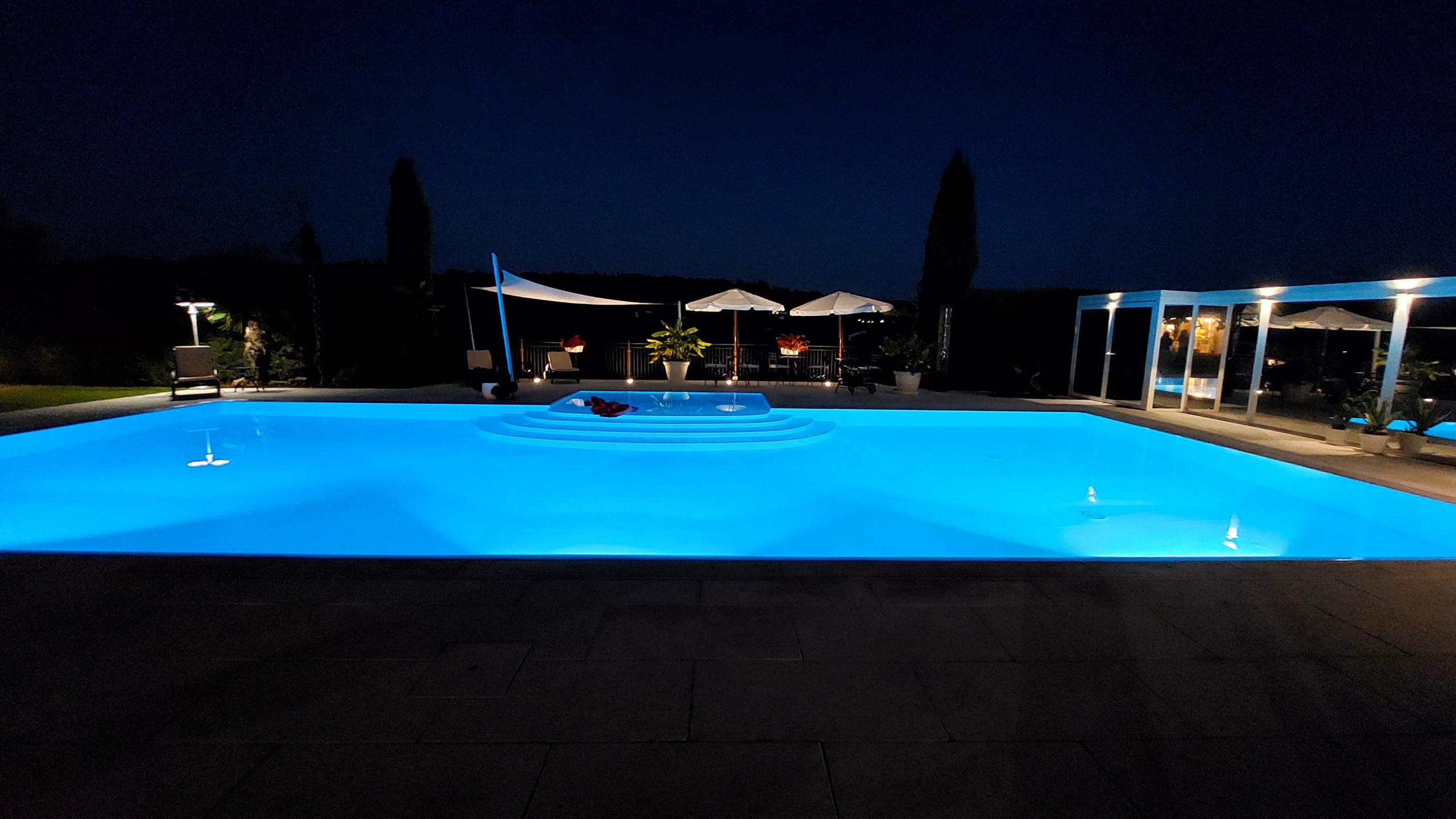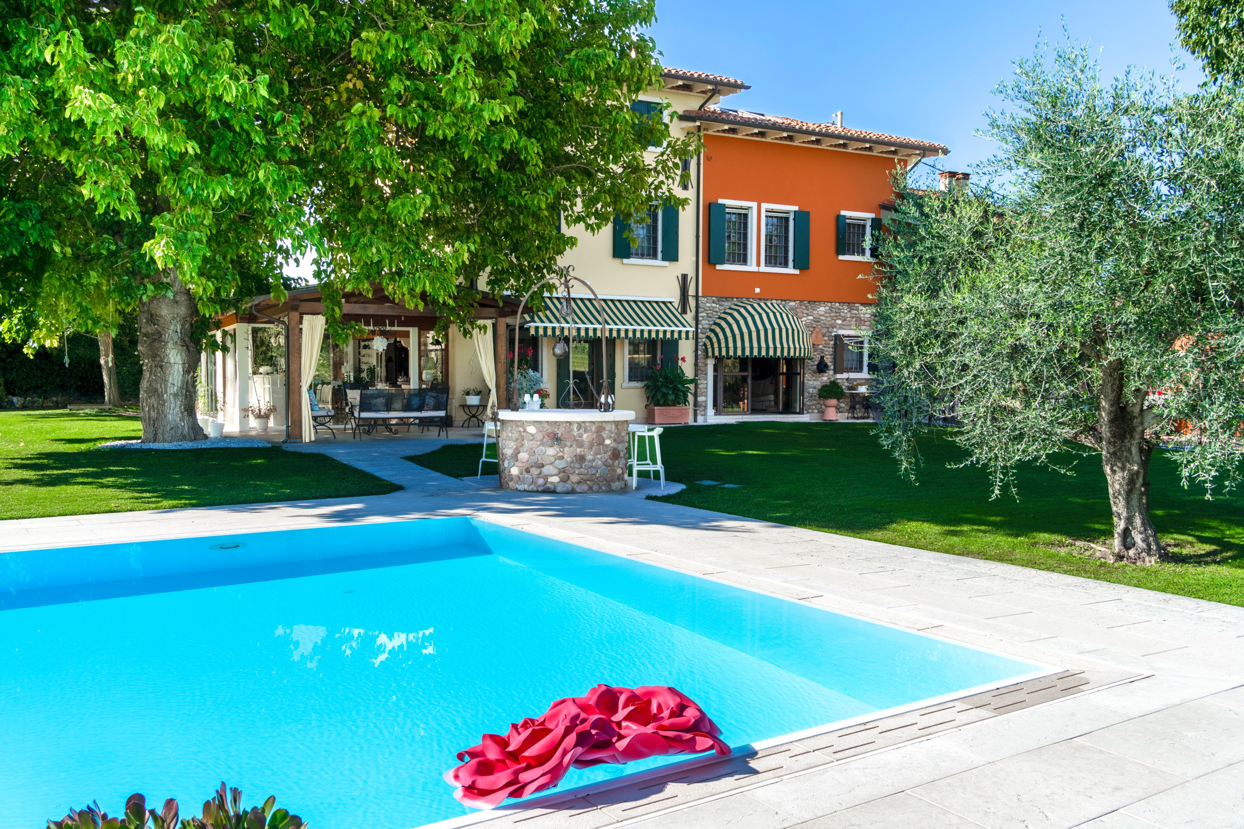 The heart of the residence is the splendid 17-metre-long swimming pool, enhanced by a hydromassage area and a bar zone, ideal for moments of relaxation or preparing breakfast outdoors. Nearby, a refined bathroom with shower and changing room offers additional convenience.