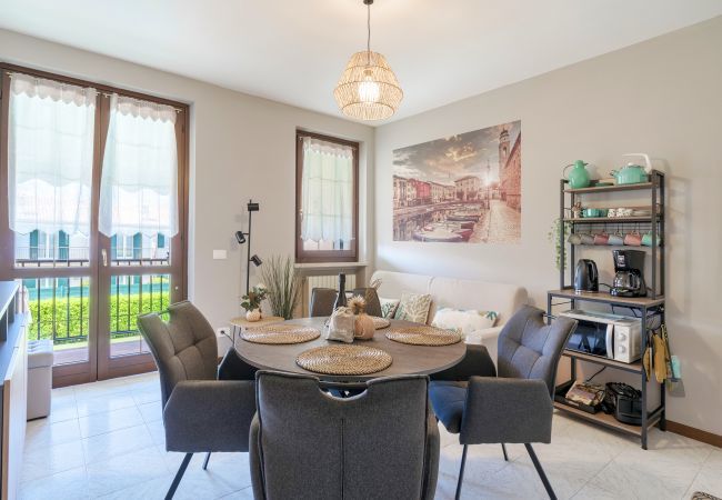 Charming two-room apartment located in the Gardenia residential complex in Lazise, about 1.2 km from the center of Lazise (15 minutes walking) and 1.5 km from the beach. The intimate residential context of only 8 units has a swimming pool (guaranteed opening period 15/05-30/09) and a large green area. The completely renovated apartment opens onto a welcoming living area with a view of the pool and a terrace furnished with a table, chairs, and a sun shade. The living room has a kitchenette with a refrigerator, freezer, oven, gas stove, dishwasher, toaster, American coffee machine, and capsule coffee machine. Relaxation corner with satellite TV, free WiFi, air conditioning, and a comfortable double sofa bed. Modern bathroom with shower cabin and hairdryer available for guests. Spacious storage room with changing area and pantry. The double bedroom, with direct access to the shaded rear garden furnished with an umbrella and sun loungers, has a spacious wardrobe and a canopy bed. Covered parking space in the garage. Cellar with laundry and two bicycles available for guests. Non-smoking apartment, pets not allowed. We recommend this apartment to couples or families looking for a modern accommodation in a small context convenient to the historic center of Lazise.