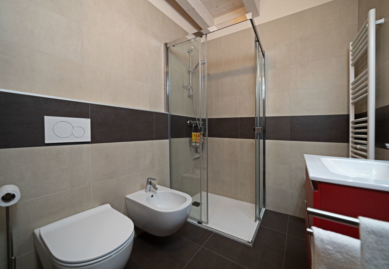 The focal point of the residence, without a doubt, is the magnificent roof solarium terrace shared among the 3 apartments with a wide lake view, furnished with 3 coffee tables, a large umbrella, sunbeds and loungers available to guests. Here you can also find a convenient shower to refresh during hot summer days and a handy shared washing machine.