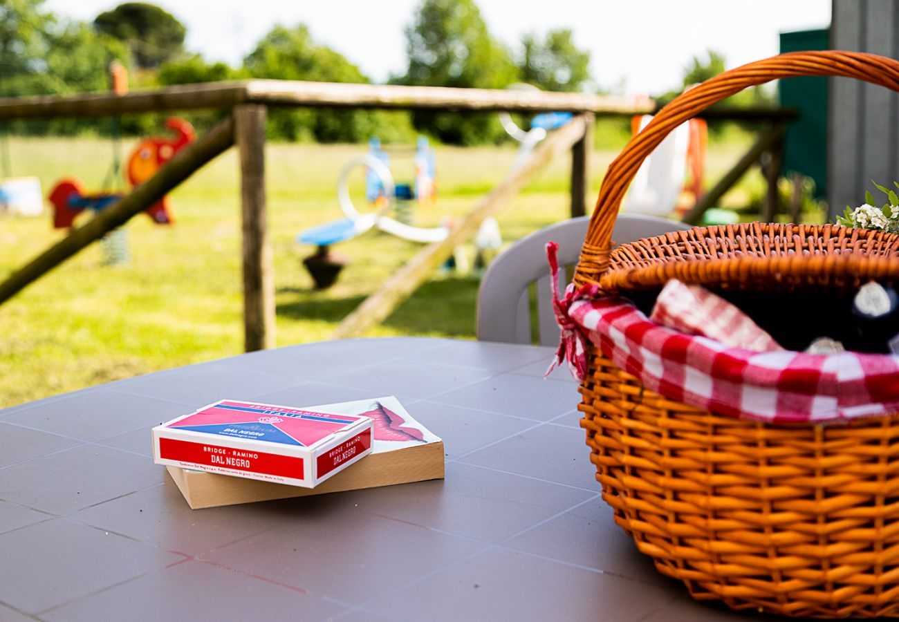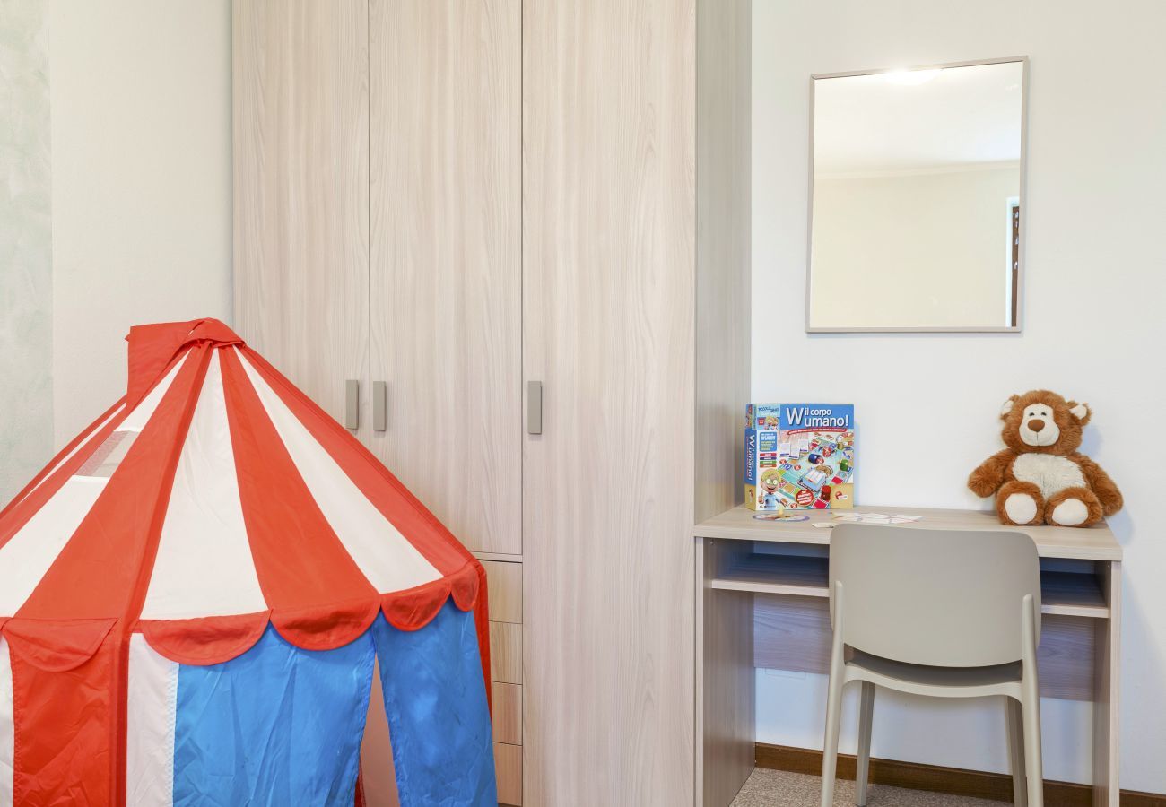 Ground floor apartment with three rooms consisting of a bright living room with a new and equipped kitchen with refrigerator with freezer, table and chairs, coffee machine, toaster, 4-burner hob, microwave and dishwasher, high chair. Sofa bed, satellite TV, Wi-Fi, air conditioning/heating. New master bedroom with double bed, cot, wardrobe, safe. New room with three single beds (can be positioned side by side), small wardrobe and children's desk, bathroom with shower, bidet, mirror and washing machine. Direct access to the large garden furnished with tables, chairs and umbrellas. Small children's play area near the garden. We recommend this apartment for families with children looking for a place near the lake, in a quiet location with all the comforts of a holiday village.