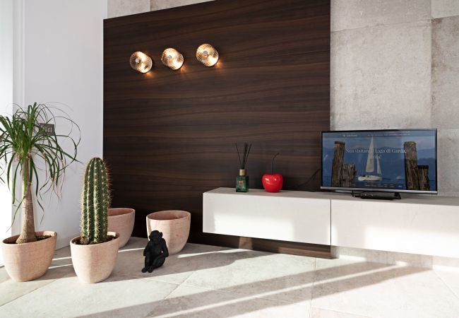 The highlight of the apartment is the large covered terrace with exposed beams overlooking the enchanting panorama of Lake Garda. From here, in fact, guests can admire the town of Lazise on the left and the bay of Garda on the right. The terrace is equipped with a table and chairs for outdoor dining and two sunbeds for moments of relaxation. The Yin and Yang apartment offers a bright living area with large sliding windows and a modern kitchen equipped with every comfort: induction hob, refrigerator with freezer, oven, dishwasher, kettle, toaster, coffee machine. The dining area is furnished with a large square table, satellite TV and an elegant velvet sofa. The master bedroom, in an oriental style, is furnished with a double bed and a sliding mirror wardrobe. Second bedroom with single bed and second pull-out bed equipped with a 3-door wardrobe. The bathroom has a flush-to-floor shower, washbasin, bidet and WC. Air conditioning in the corridor between the bedrooms and the living room. Free WiFi available to guests. A reserved parking space outside the property, additional external parking in the nearby public car park. Pets not allowed. Non-smoking apartment.