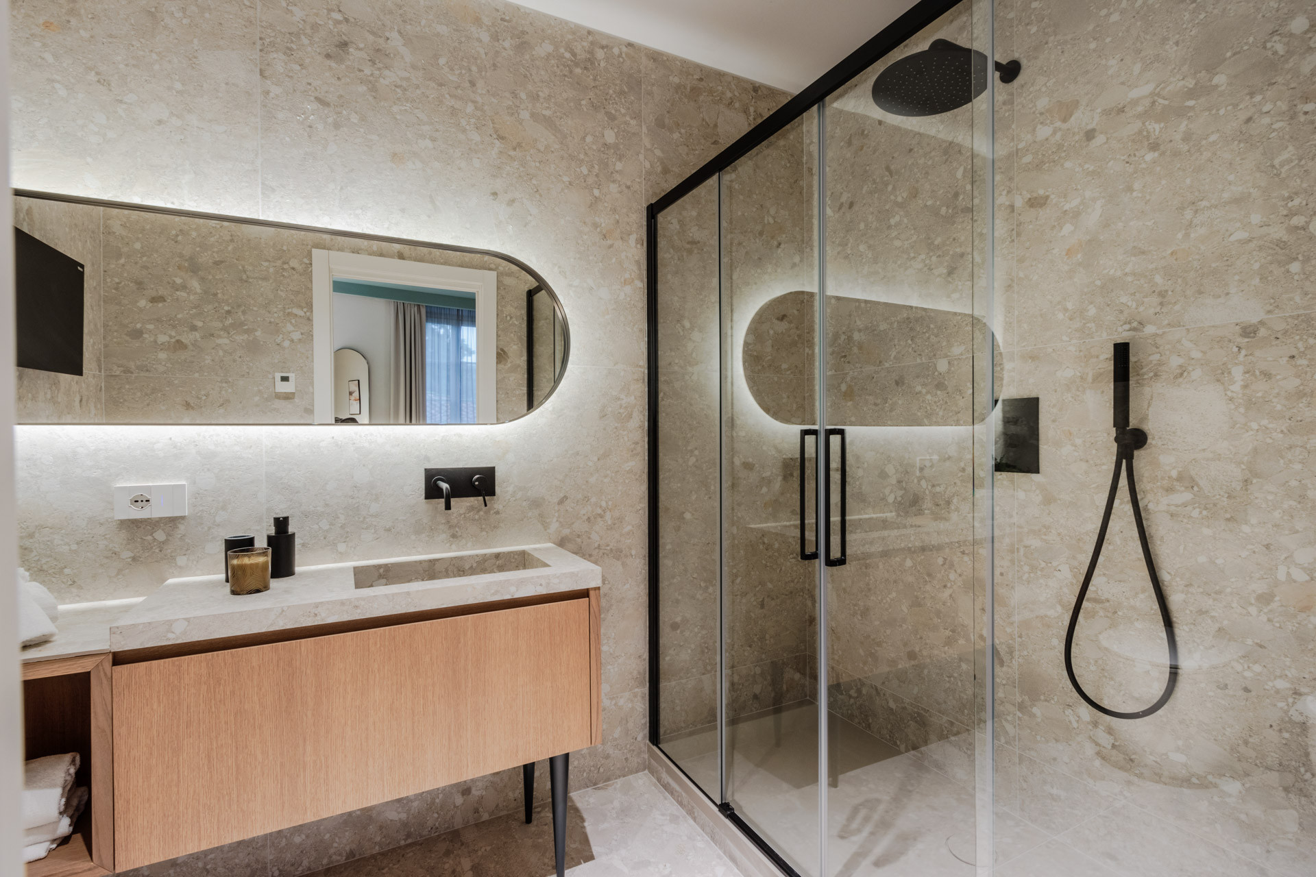 Every aspect of comfort has been meticulously considered, with four sumptuous bathrooms offering the epitome of luxury. Two feature exquisite stone-built showers, each a testament to craftsmanship and refinement, while the third beckons with a contemporary bathtub, promising moments of sublime relaxation beneath its gleaming faucets.