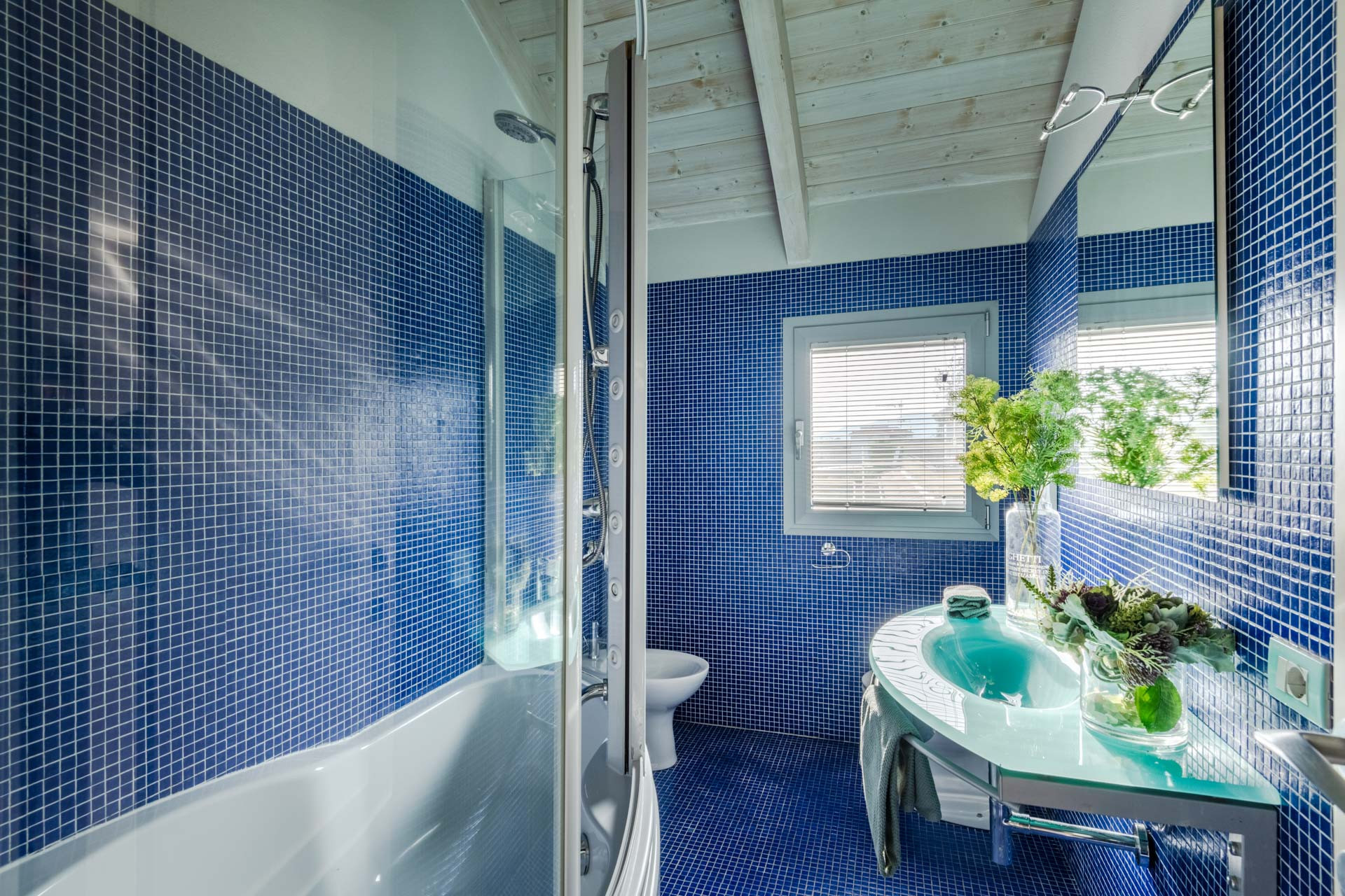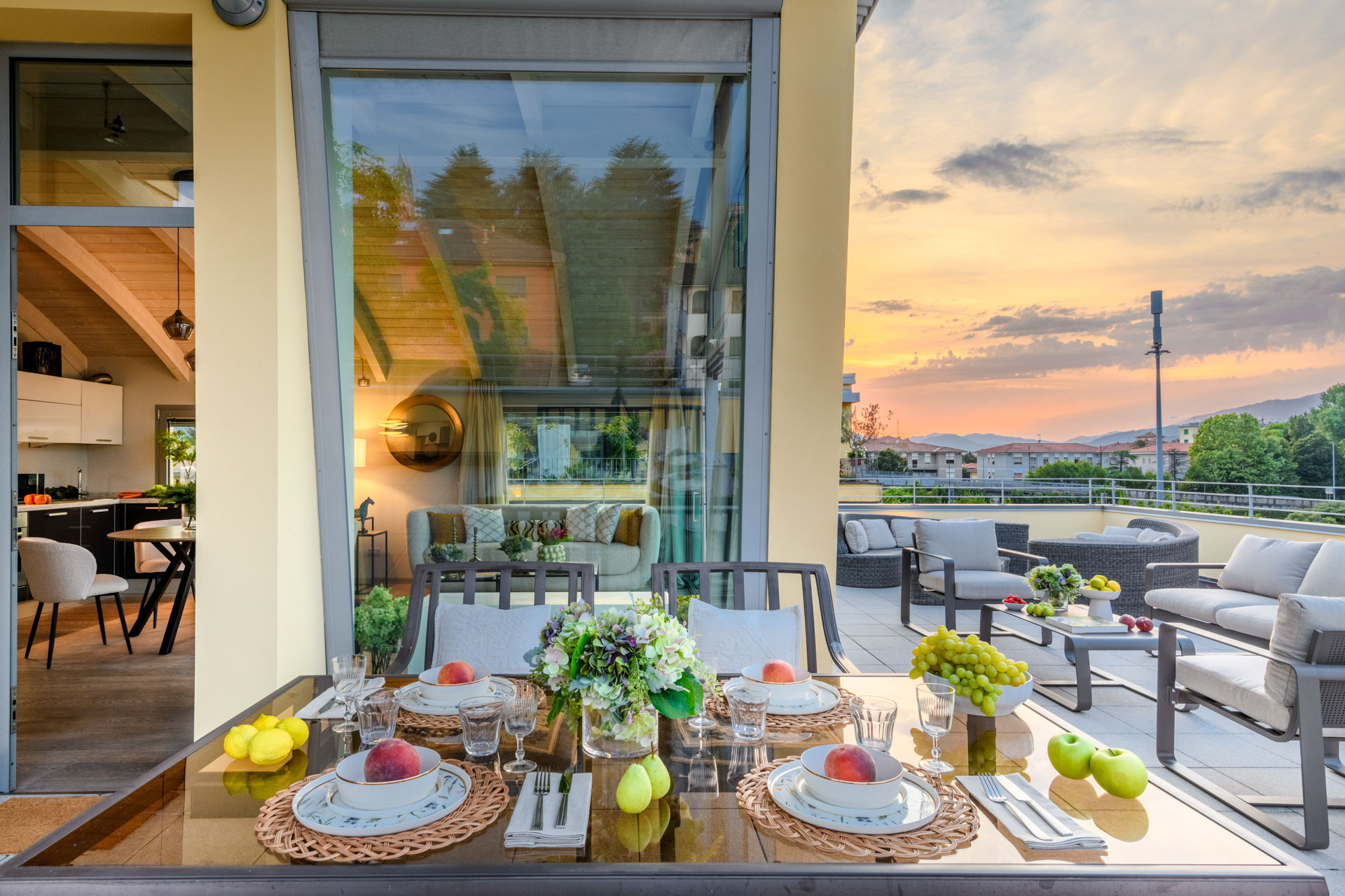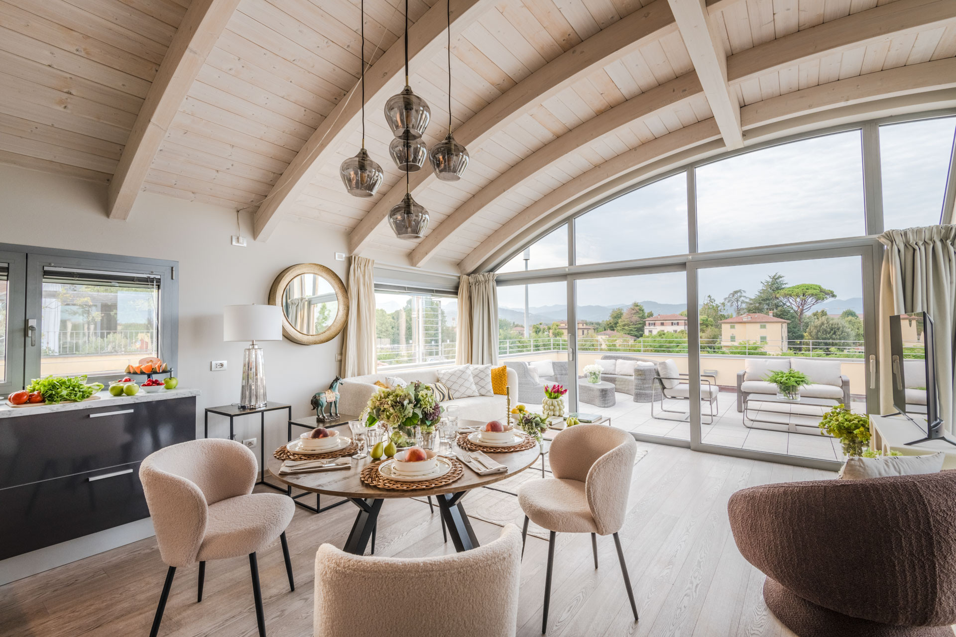 As you step inside, you are greeted by an expansive open-concept living space, where sleek, modern furnishings are complemented by the soft glow of natural light. The glass walls not only frame breathtaking, panoramic views of Lucca's ancient walls but also create an intimate connection with the vibrant surroundings, making the line between indoor elegance and outdoor splendor nearly invisible.