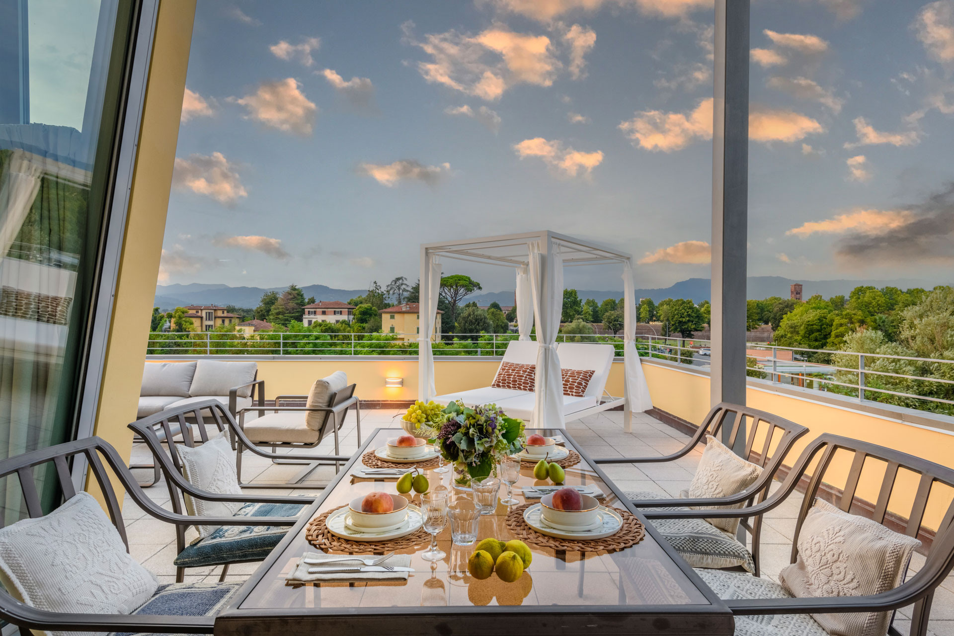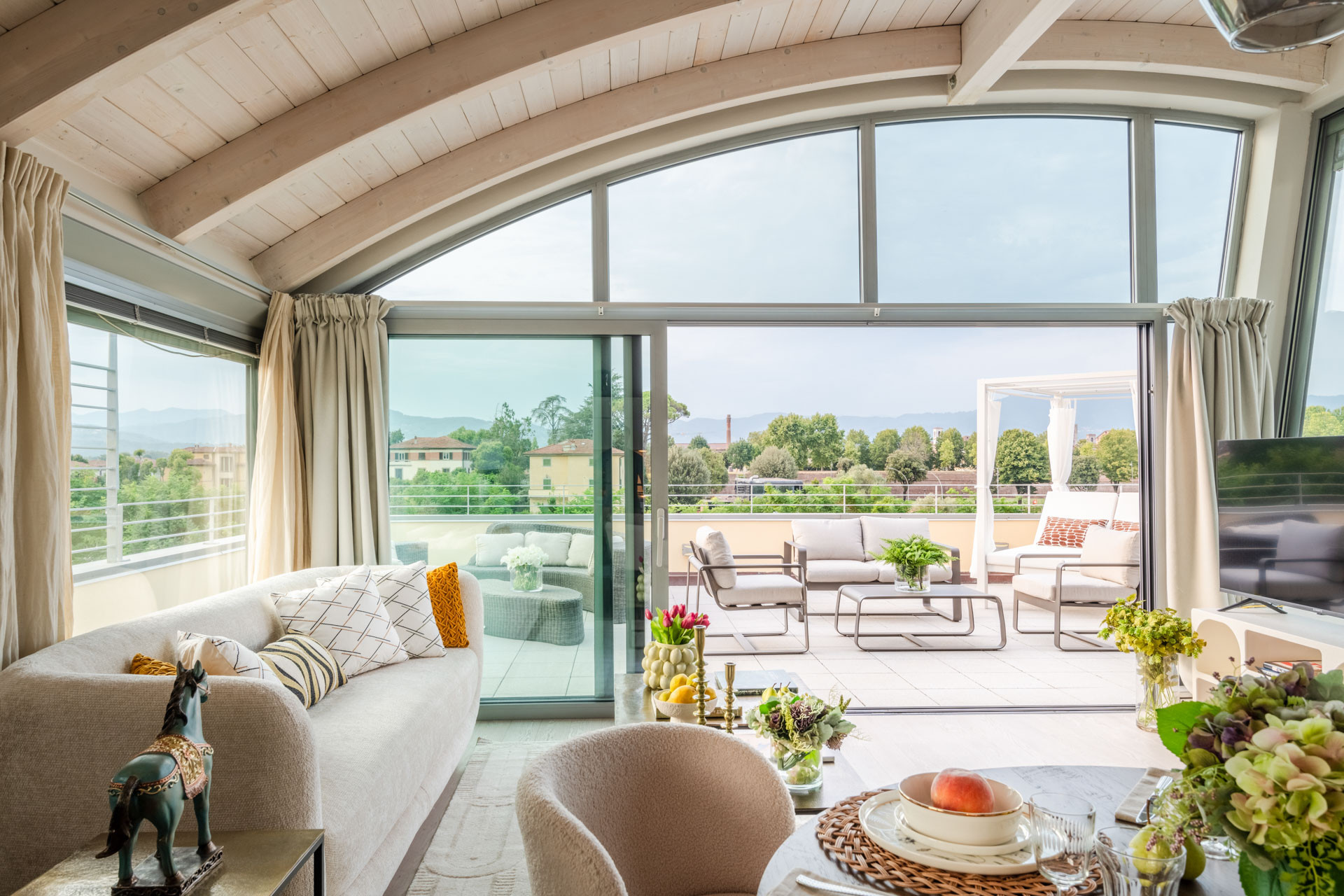 The heart of this penthouse is its grand terrace—a private haven where you can savor a morning espresso while watching the city come to life, or unwind with a glass of wine as the sun sets over the Tuscan hills. This outdoor oasis is more than just a terrace; it is an extension of the living space, perfect for al fresco dining, entertaining guests, or simply soaking in the serene ambiance of this historic city.