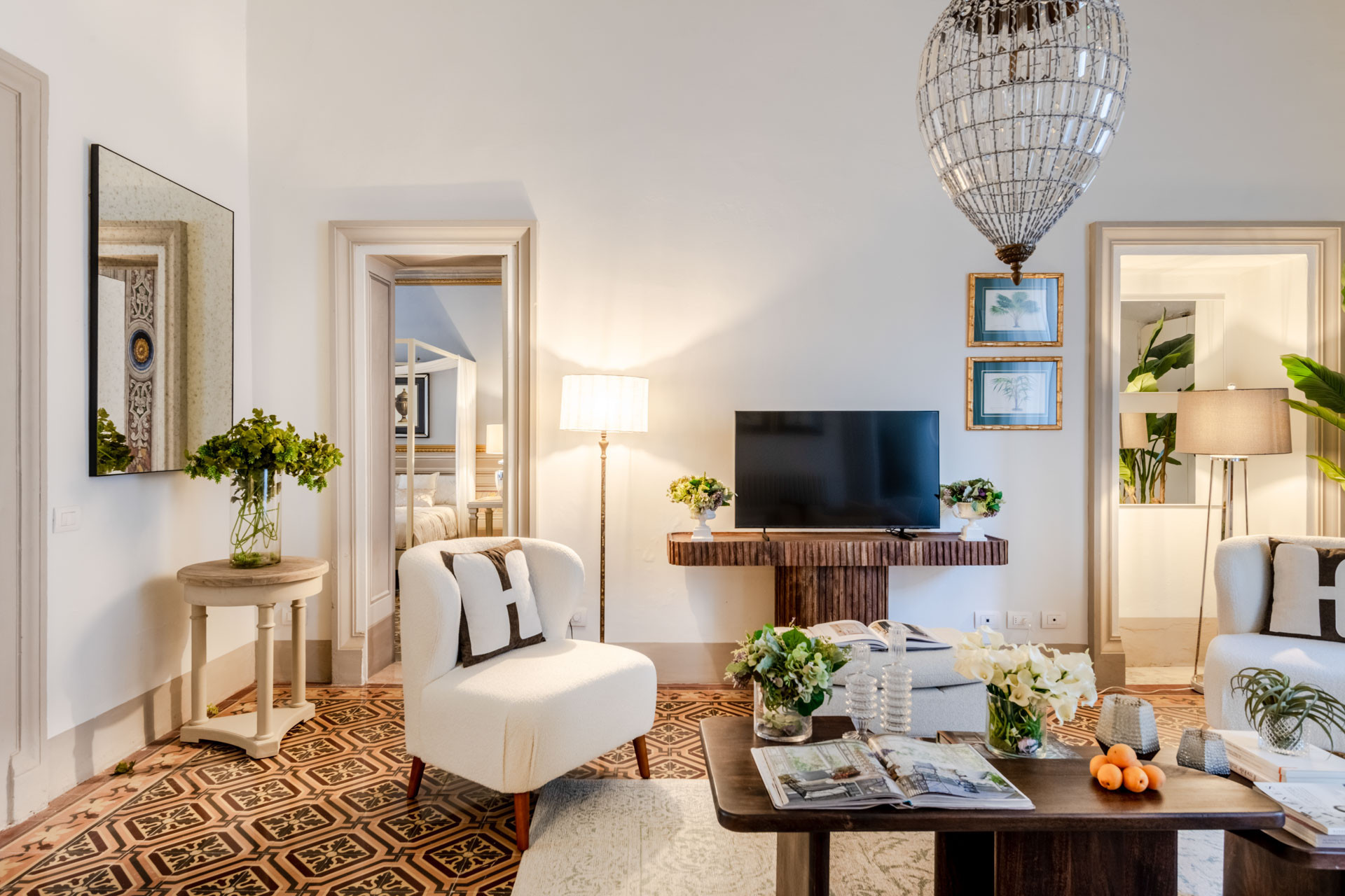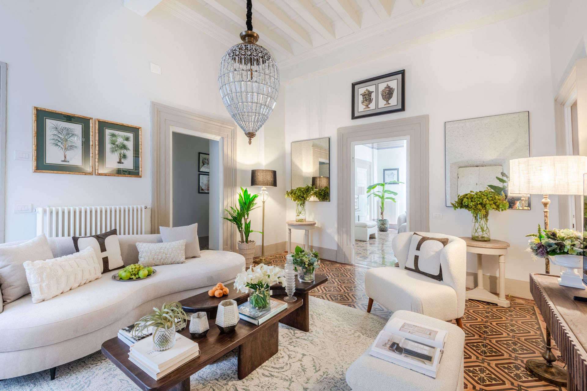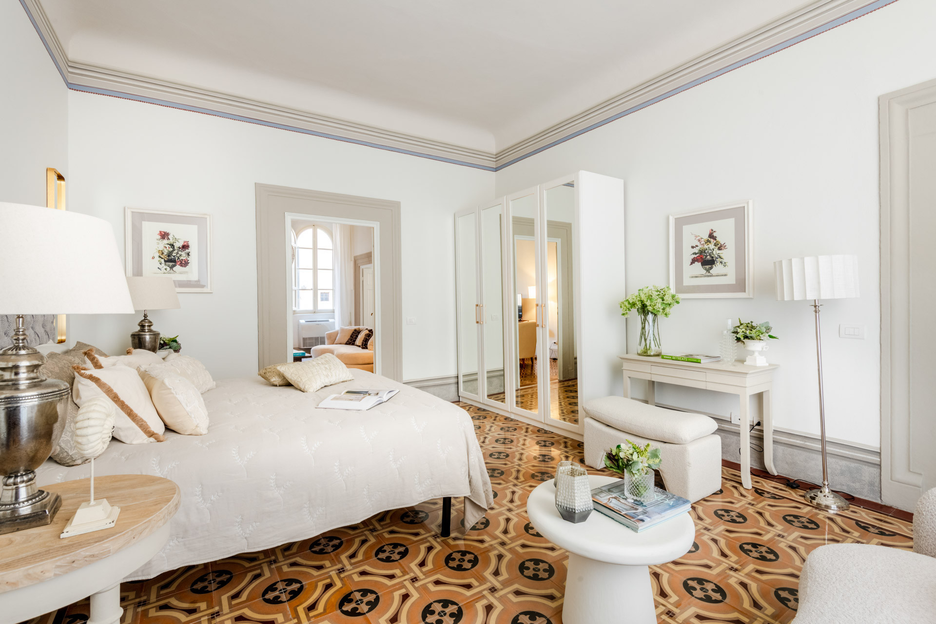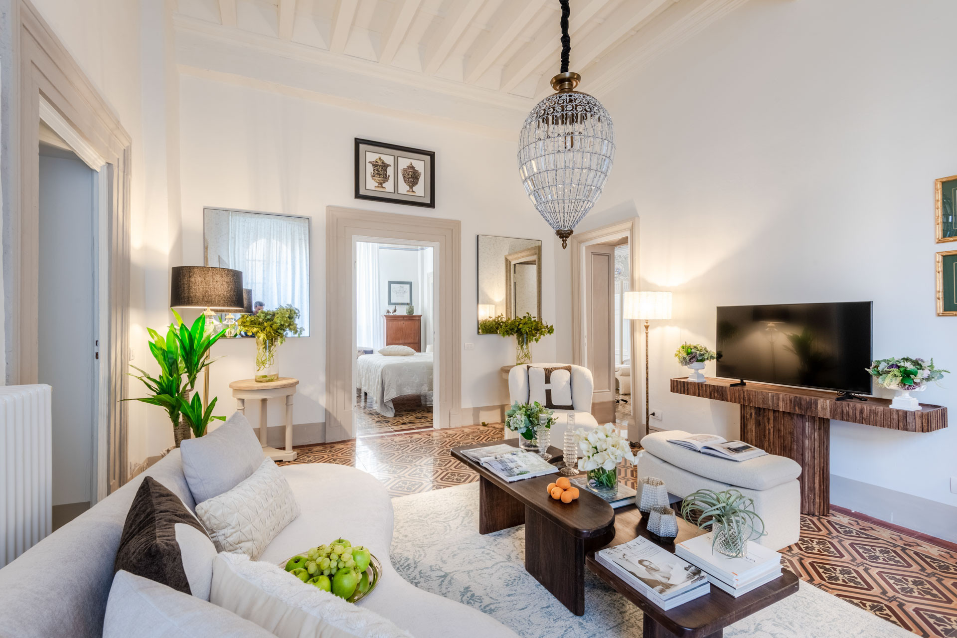 Every corner of The Frescoed Tale tells a story: the original tessieri floors, a hallmark of Lucca’s historic residences, add character and depth to the space, while carefully curated furnishings bring a sense of harmony and quiet sophistication. The apartment has been fully renovated, combining historical charm with modern amenities.