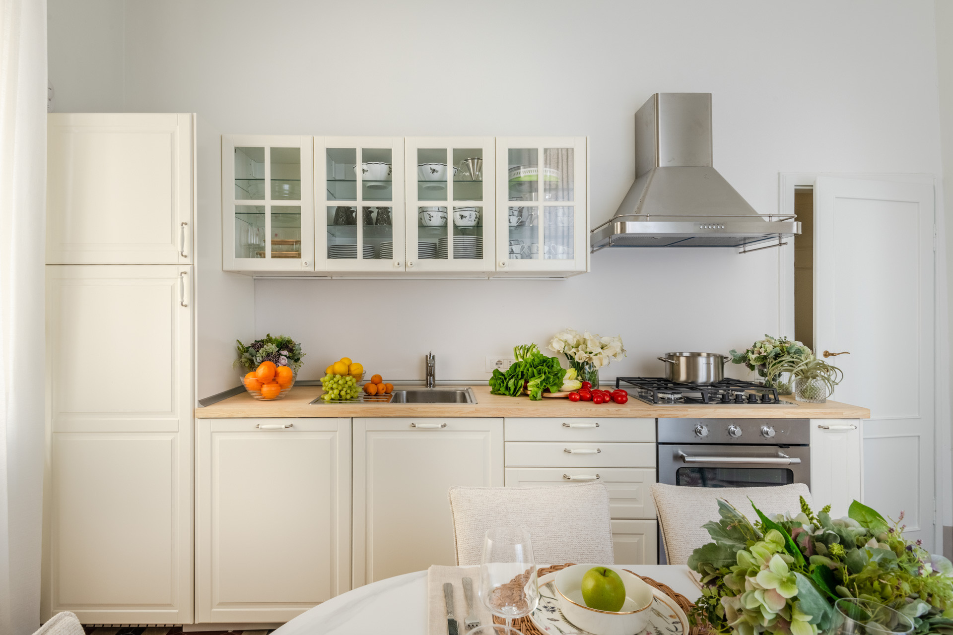 Upon entering, guests are welcomed into a spacious and luminous living room — a refined setting where soft neutral tones, elegant textures, and original architectural details create a warm and serene atmosphere. The adjoining dining kitchen is fully equipped and designed for convivial meals, bathed in natural light streaming through large windows.